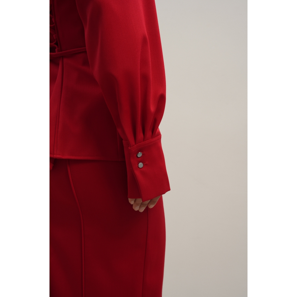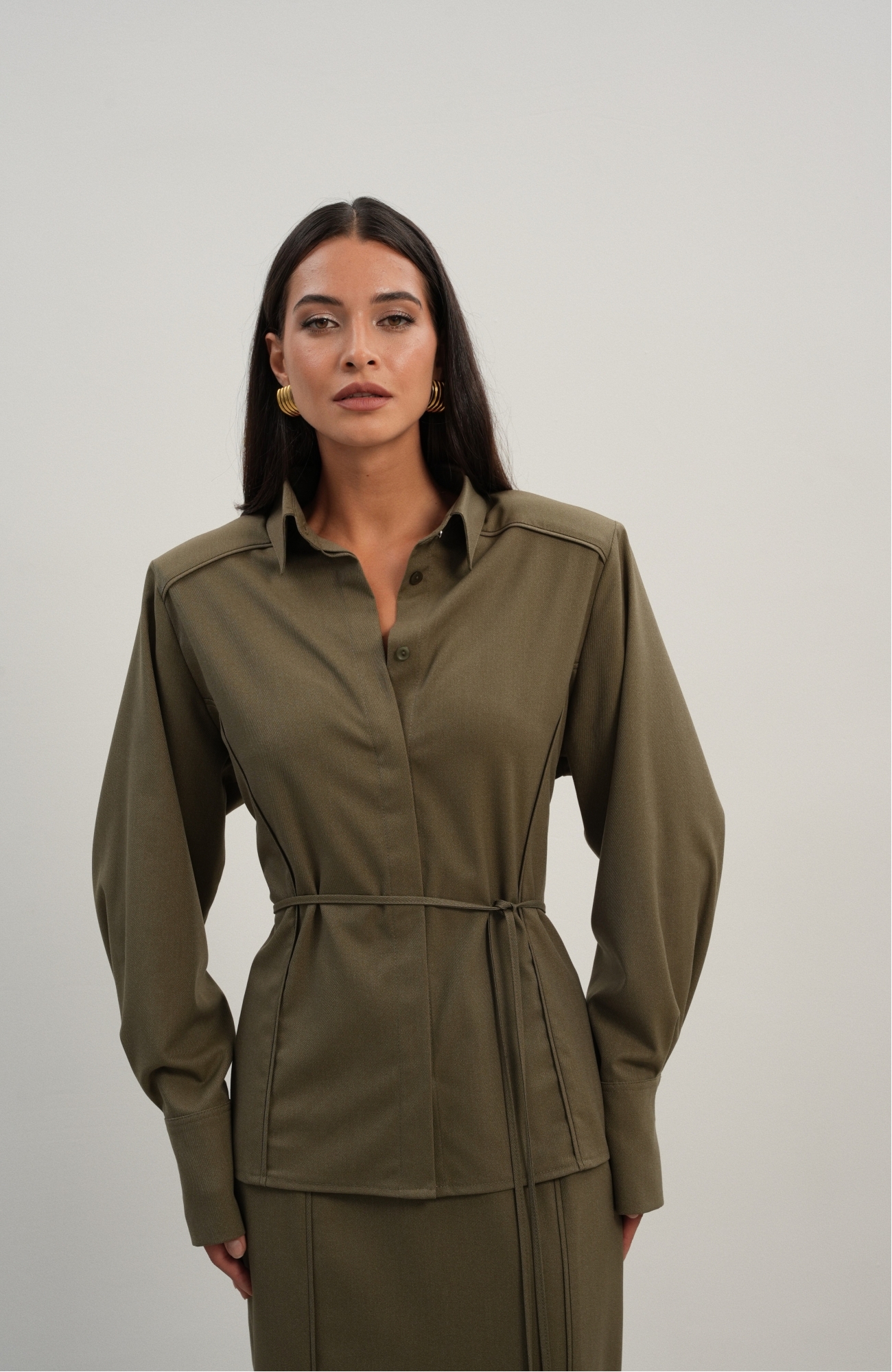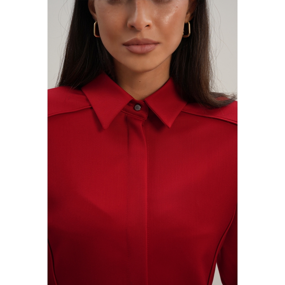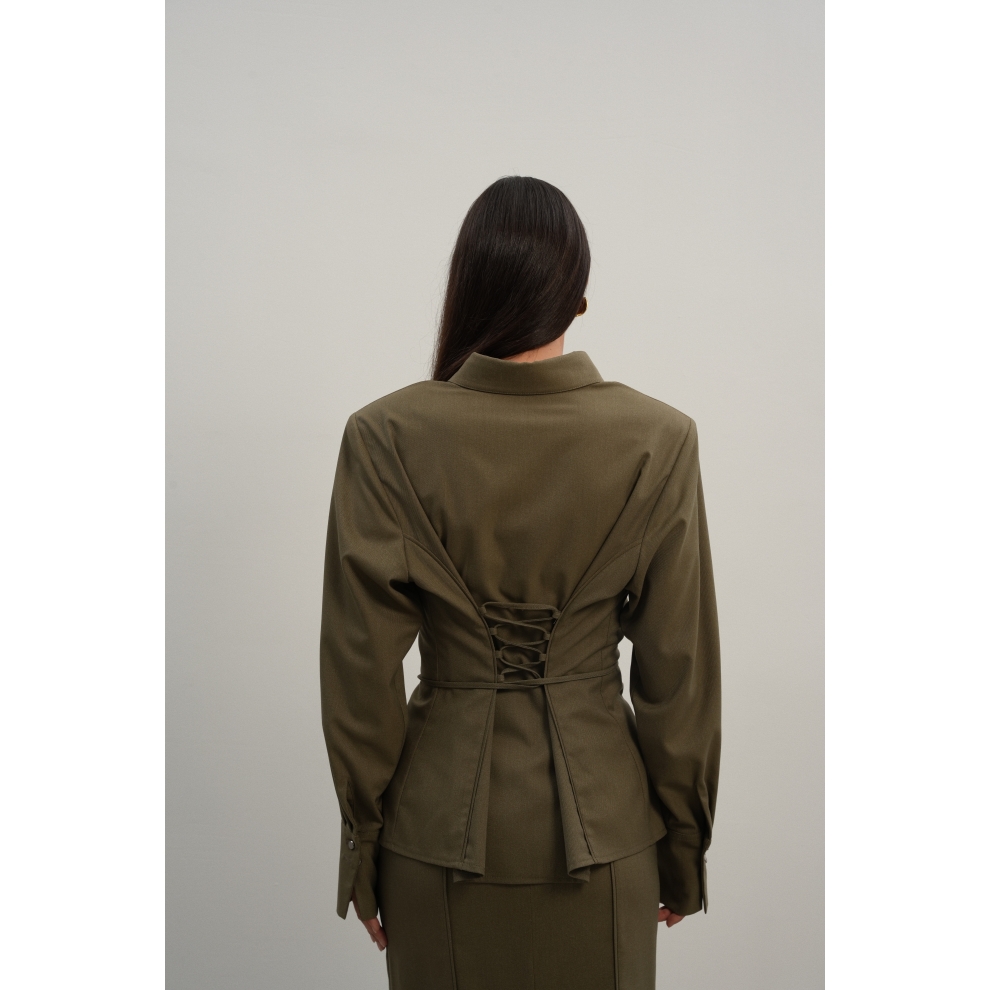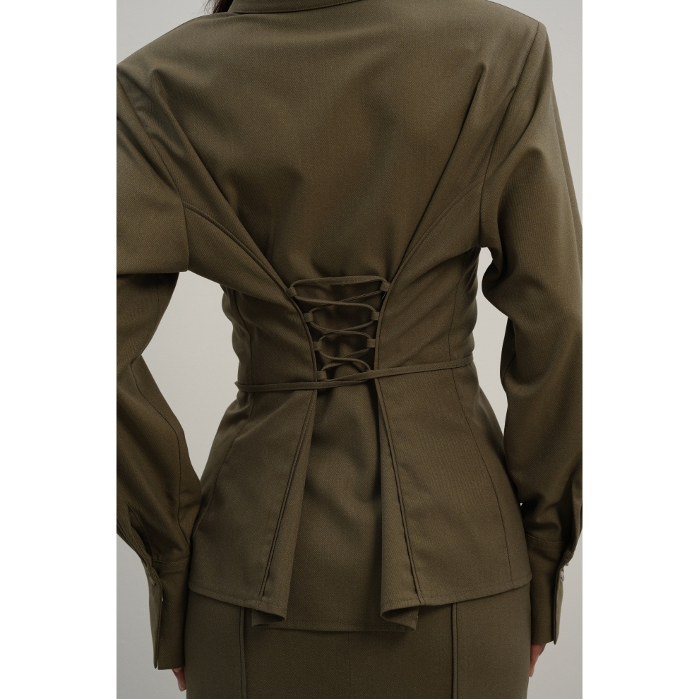 Рубашка с акцентными плечами приталенного силуэта с рельефами. Сзади по спинке расположена шнуровка, которая позволяет регулировать ширину изделия на талии.