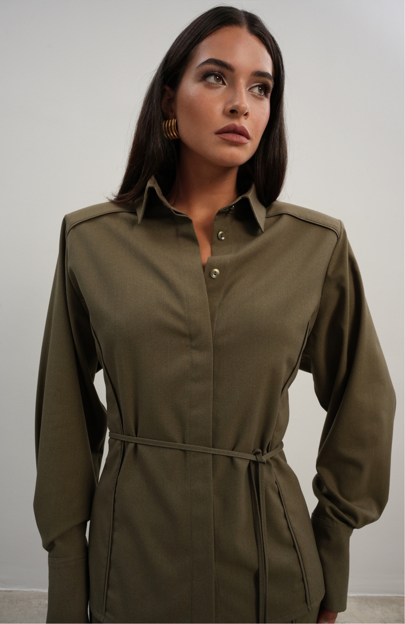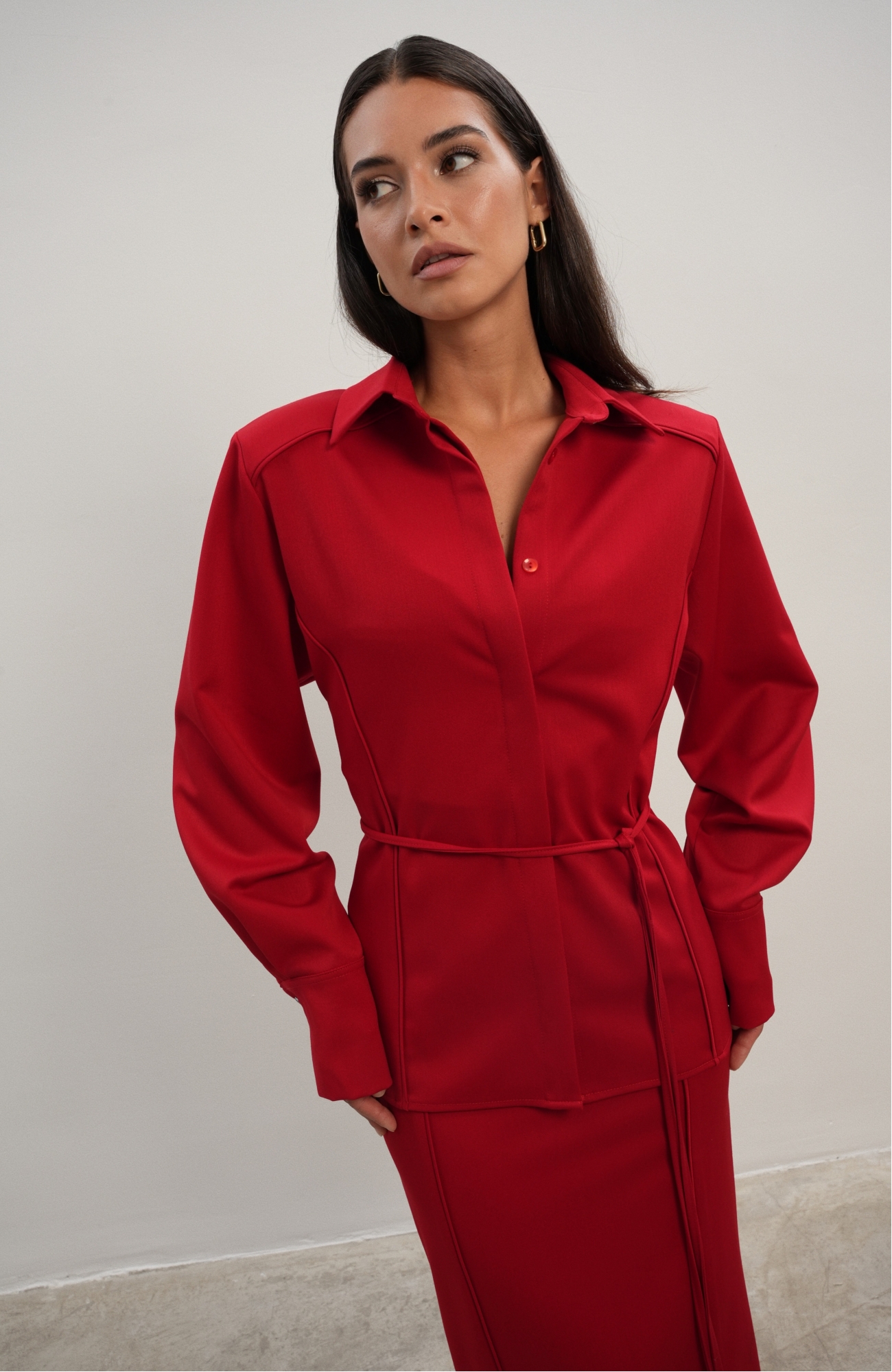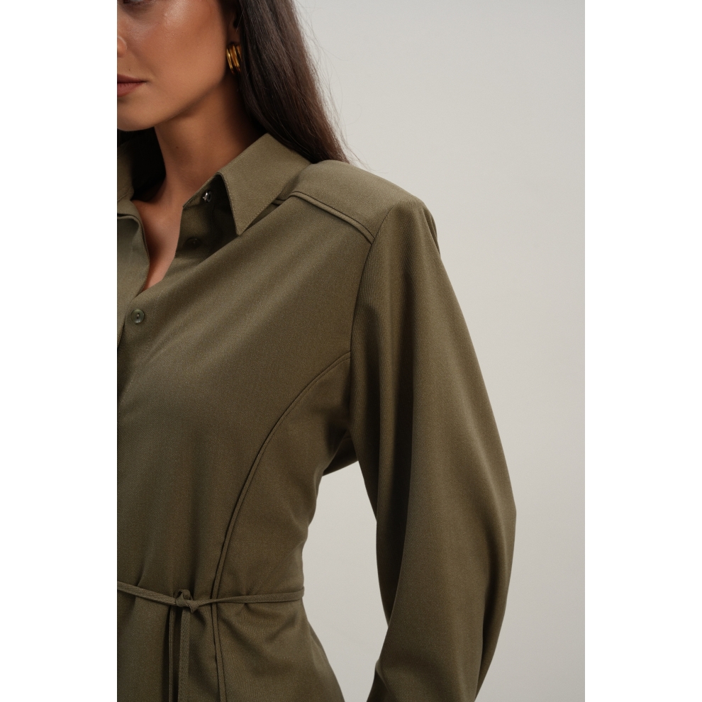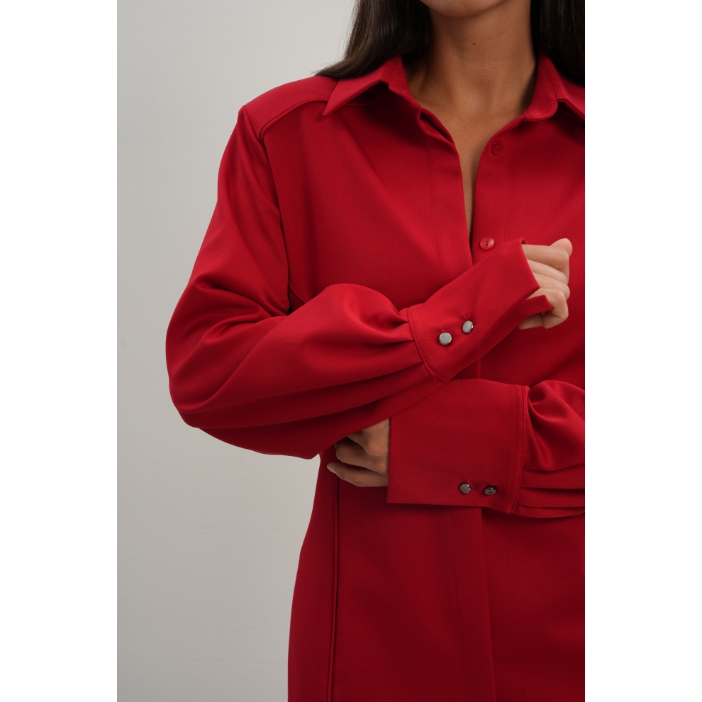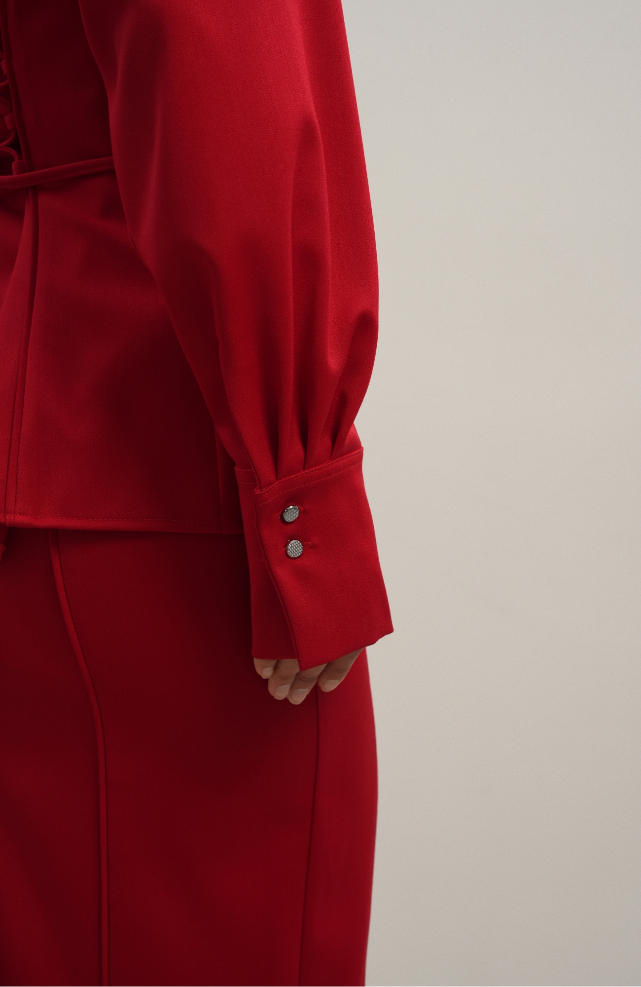 Рубашка с акцентными плечами приталенного силуэта с рельефами. Сзади по спинке расположена шнуровка, которая позволяет регулировать ширину изделия на талии.