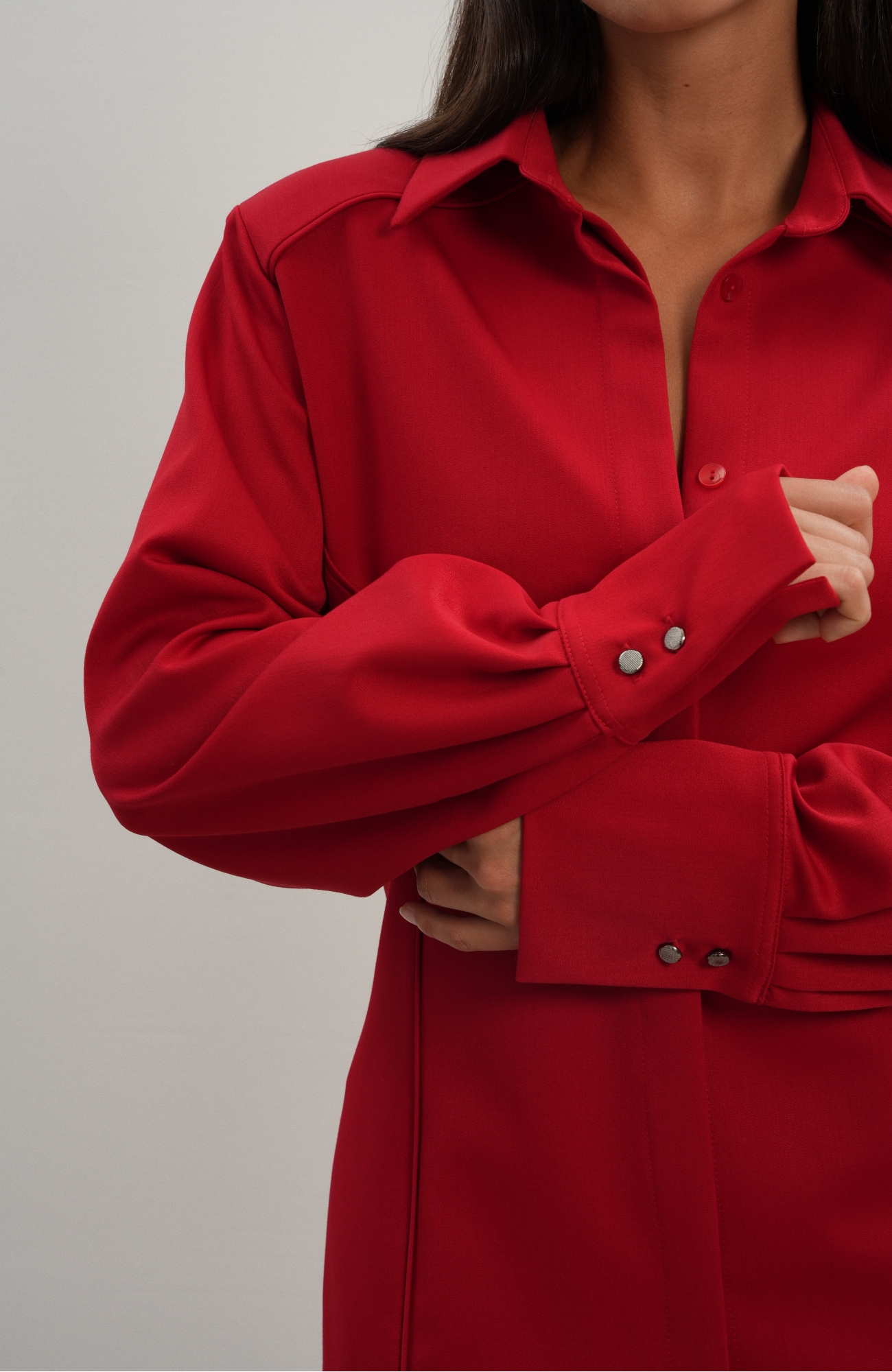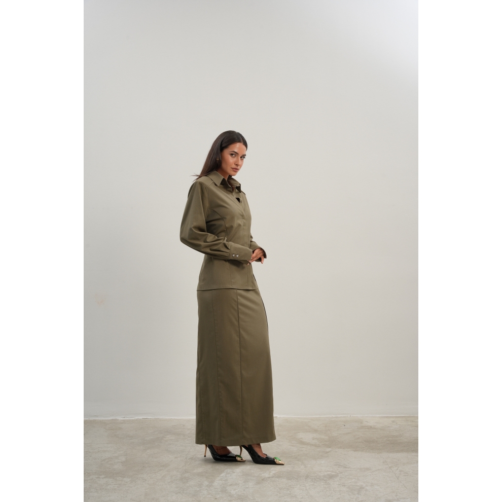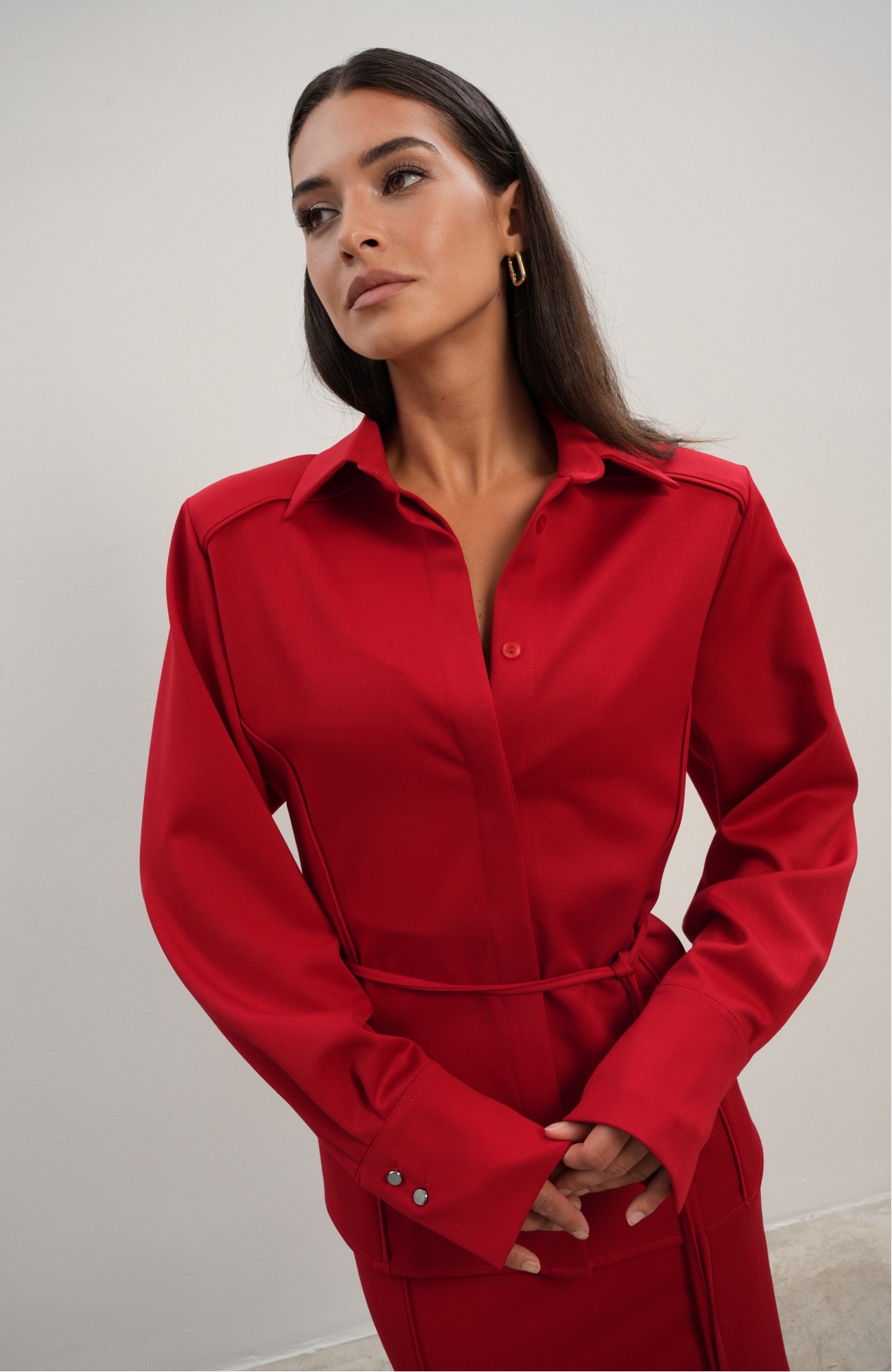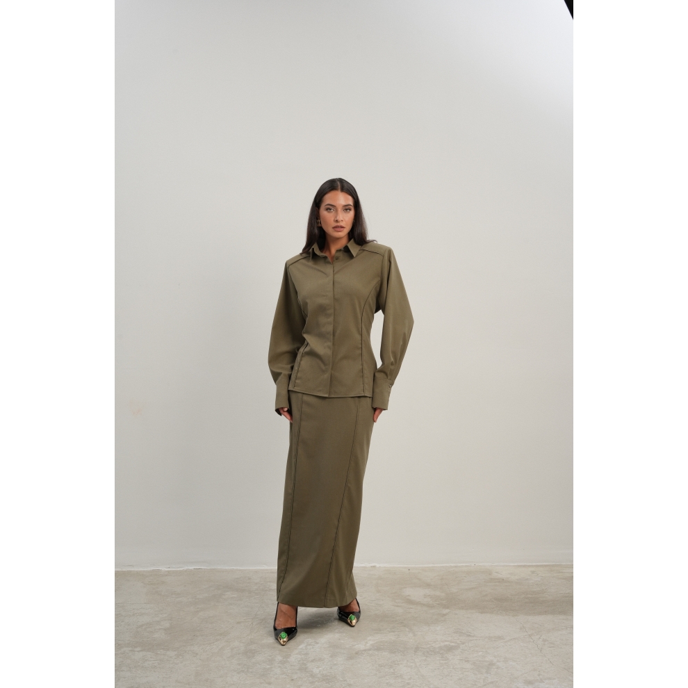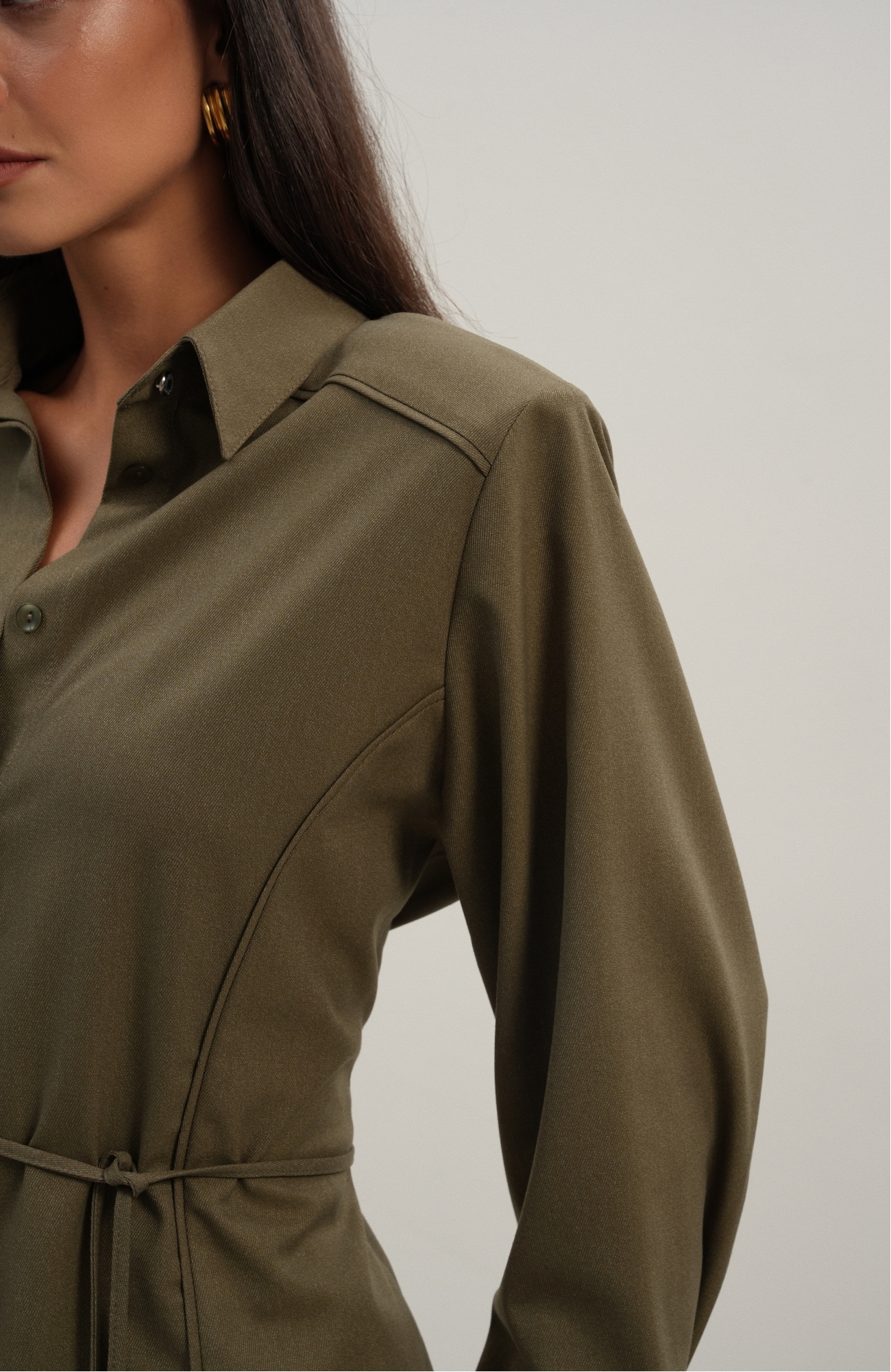 Рубашка с акцентными плечами приталенного силуэта с рельефами. Сзади по спинке расположена шнуровка, которая позволяет регулировать ширину изделия на талии.