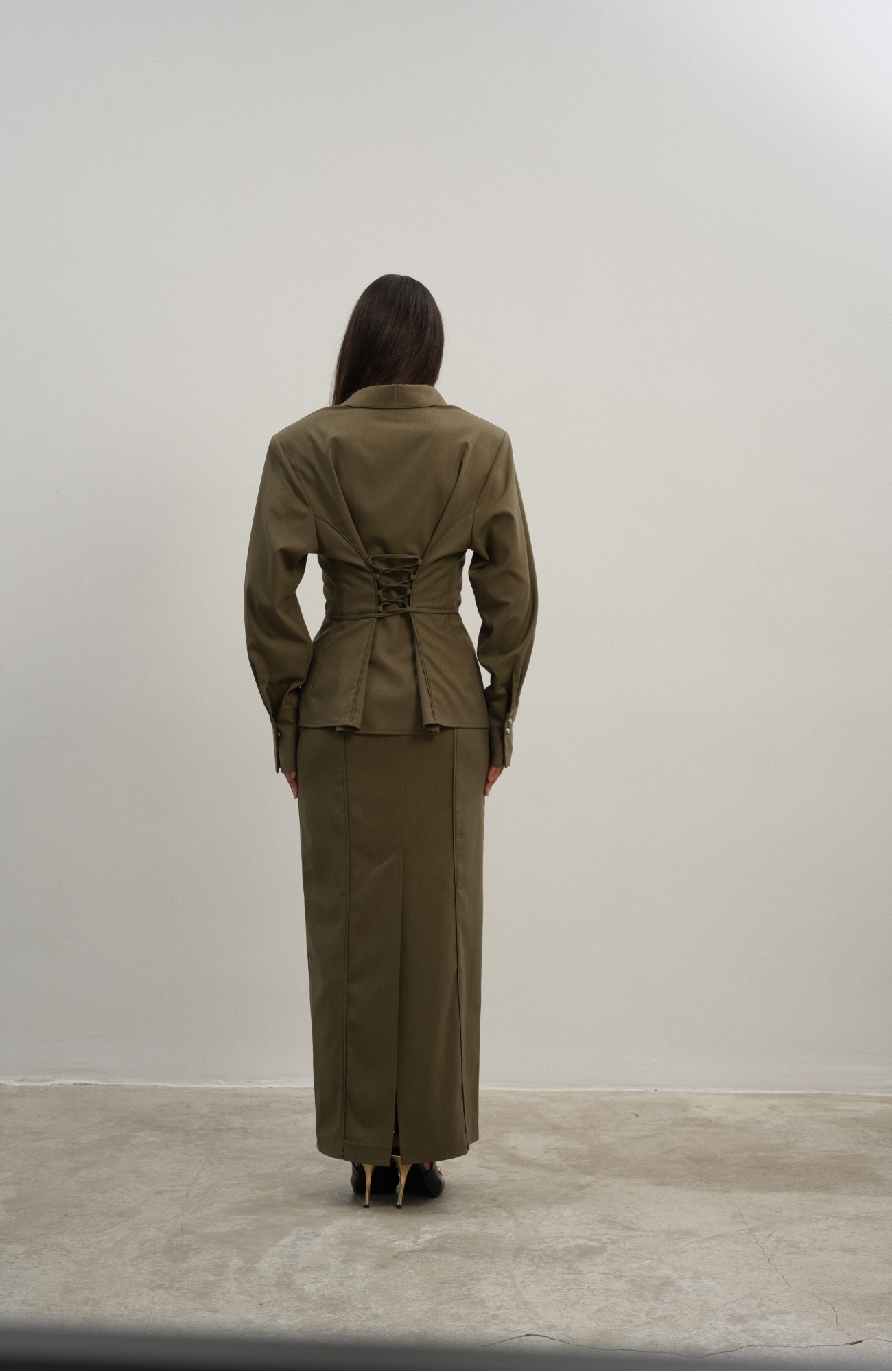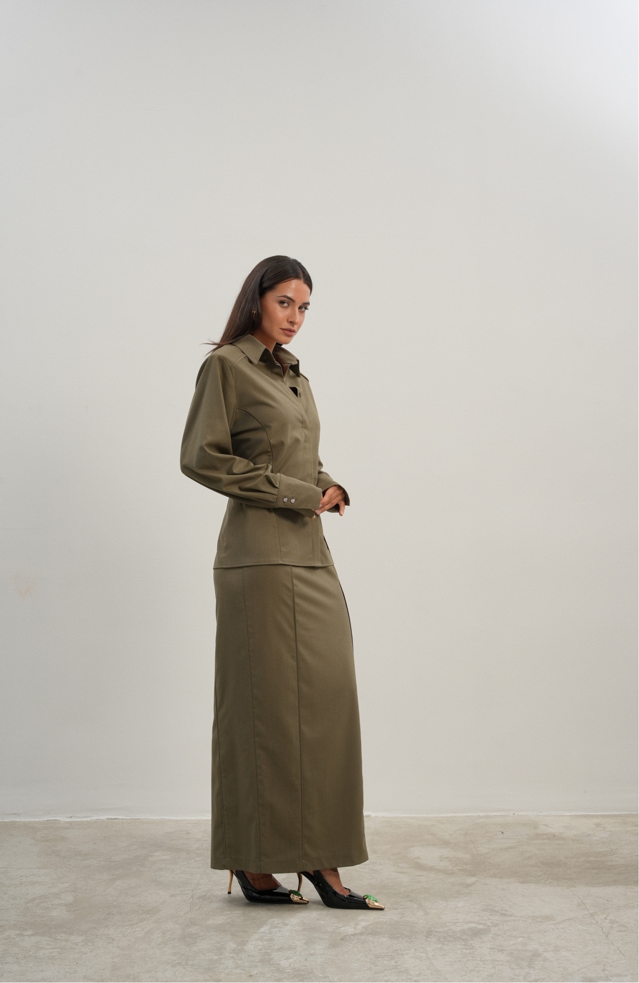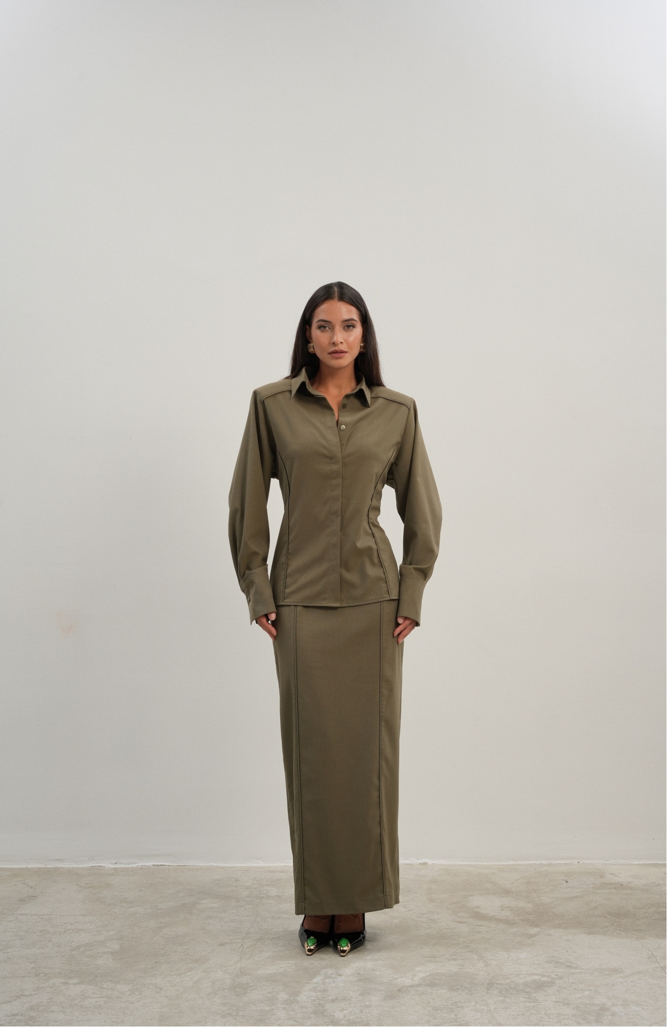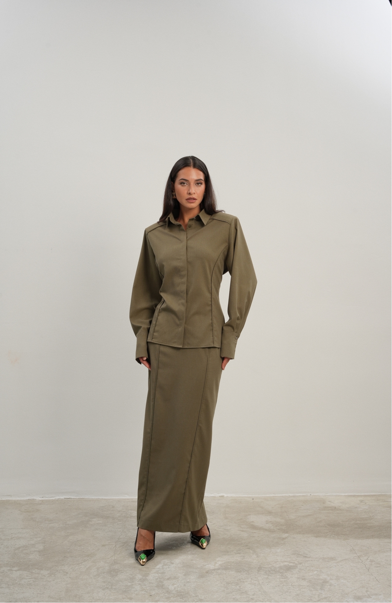 Рубашка с акцентными плечами приталенного силуэта с рельефами. Сзади по спинке расположена шнуровка, которая позволяет регулировать ширину изделия на талии.