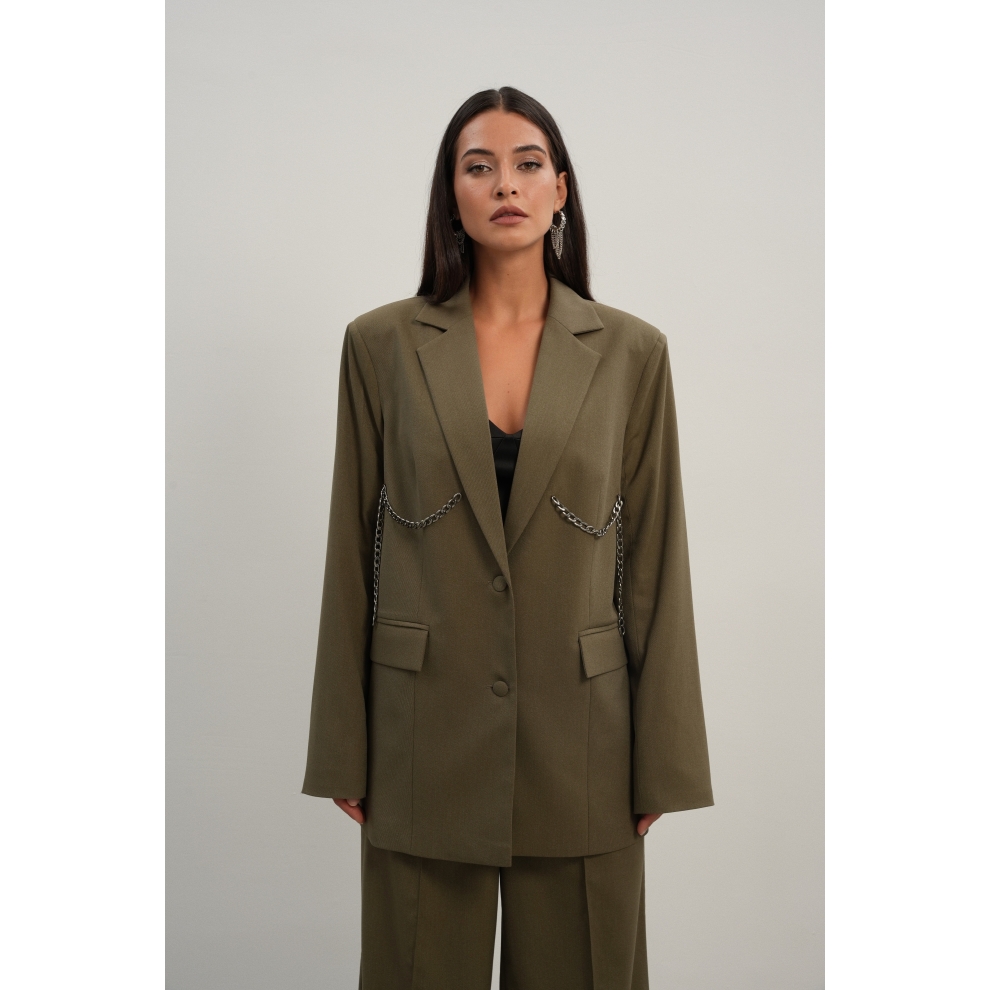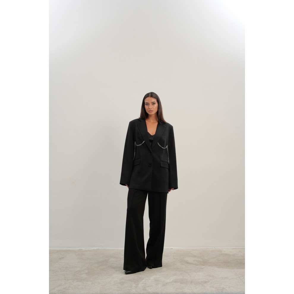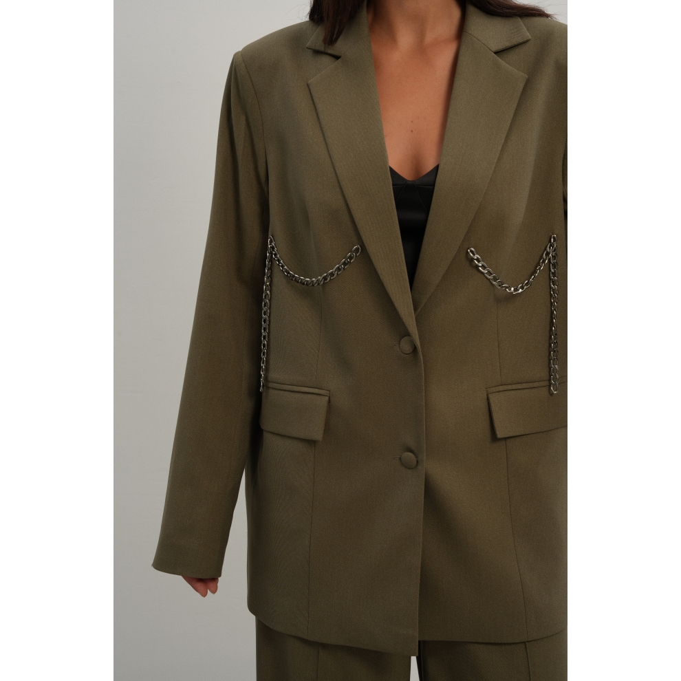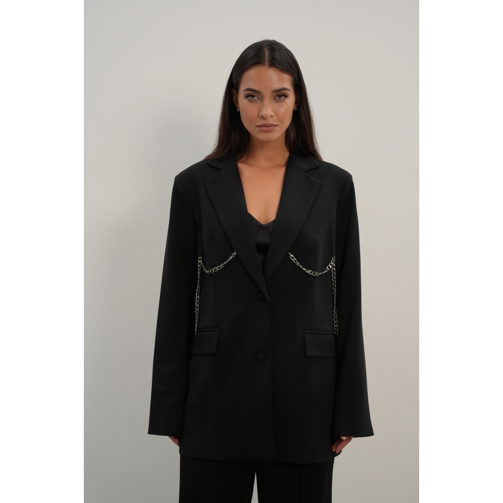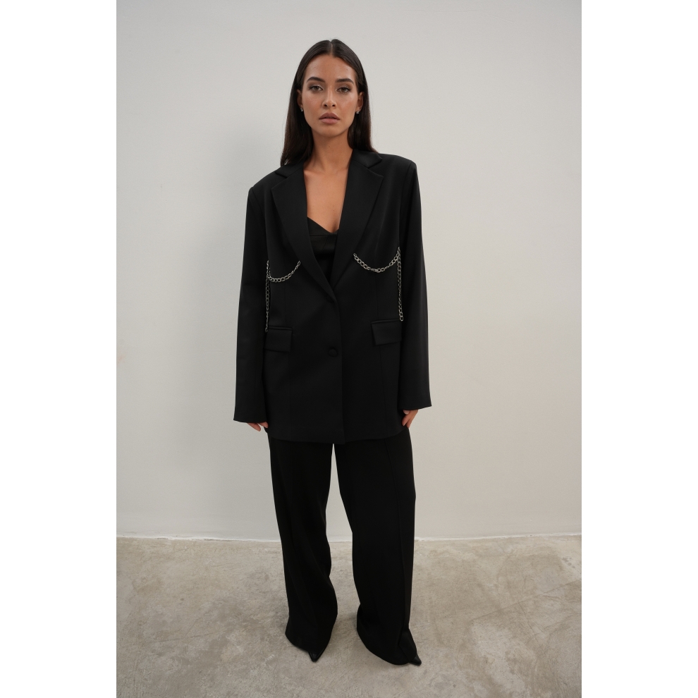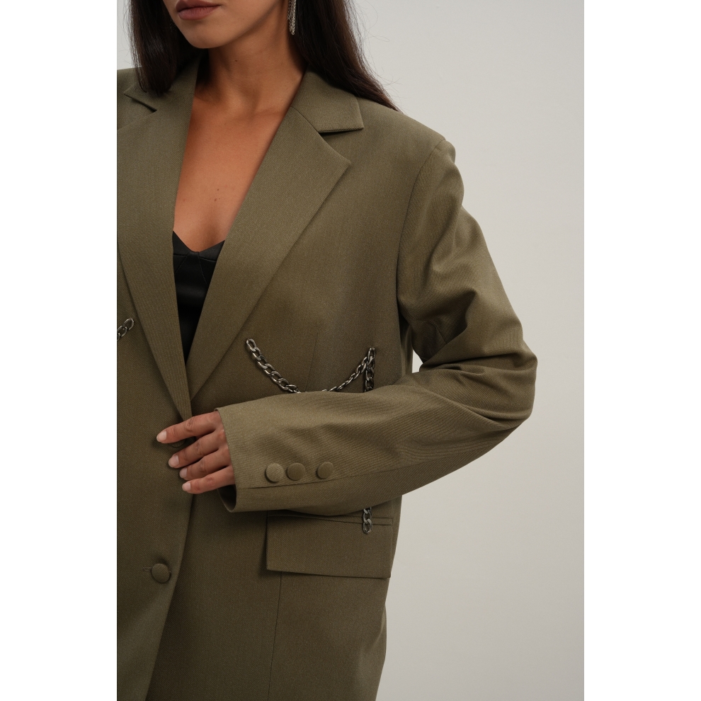 | Двубортный жакет прямого кроя выполнен из поливискозной ткани. На зоне груди расположена несъемная акцентная деталь в виде цепи. |
