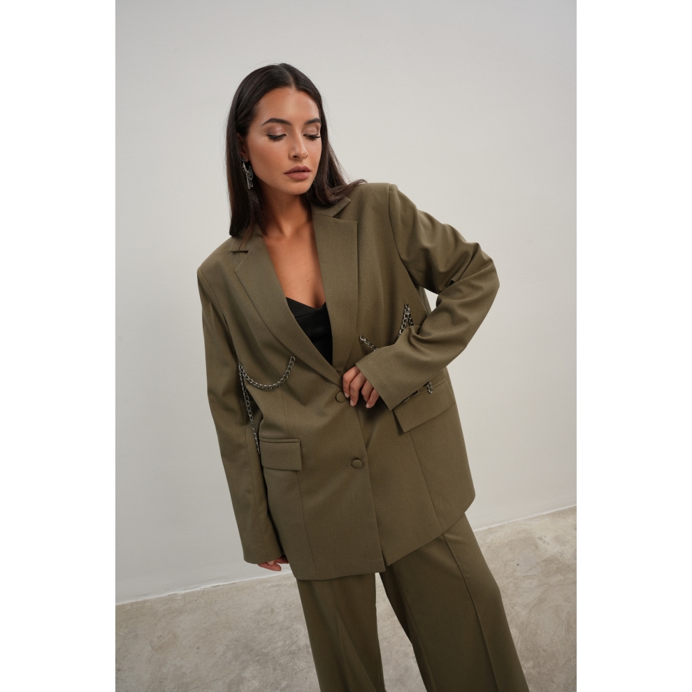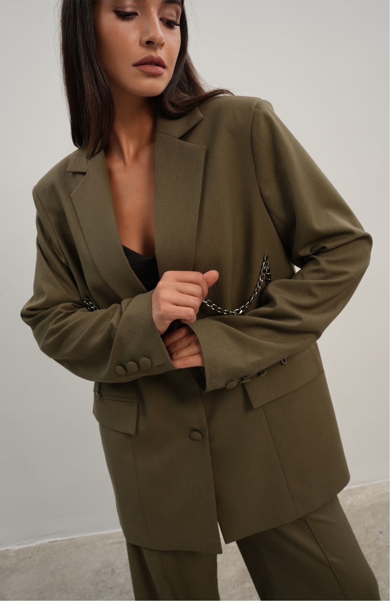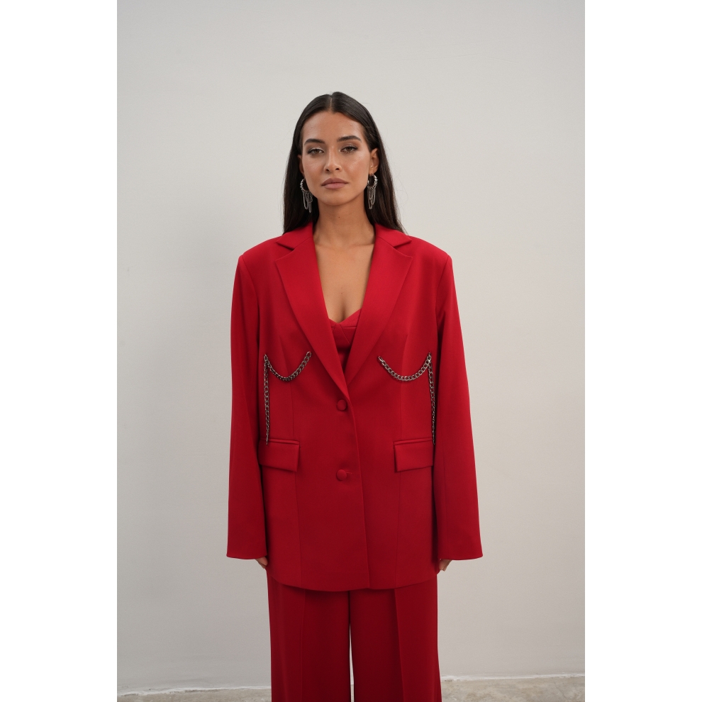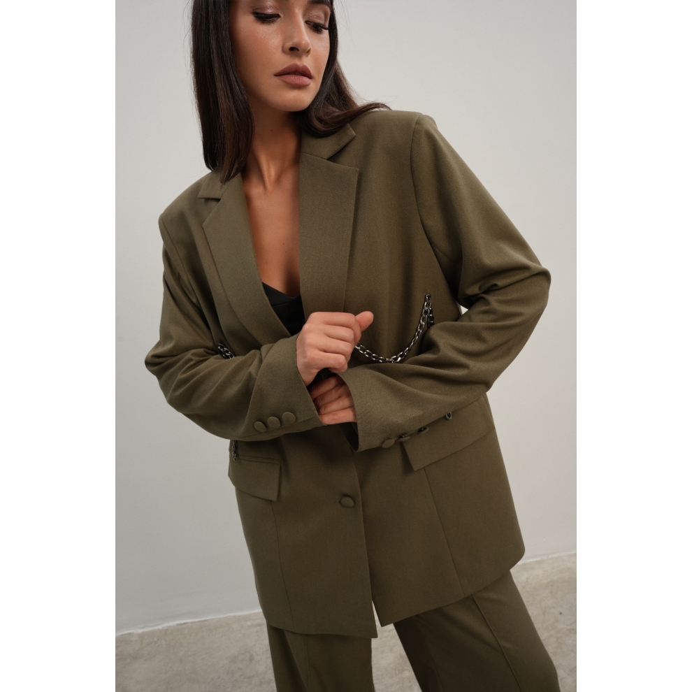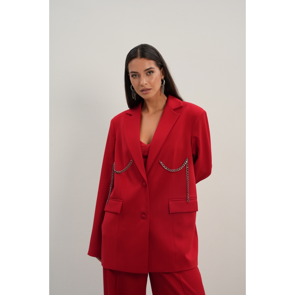 | Двубортный жакет прямого кроя выполнен из поливискозной ткани. На зоне груди расположена несъемная акцентная деталь в виде цепи. |