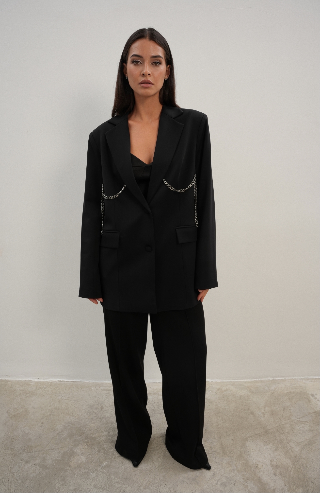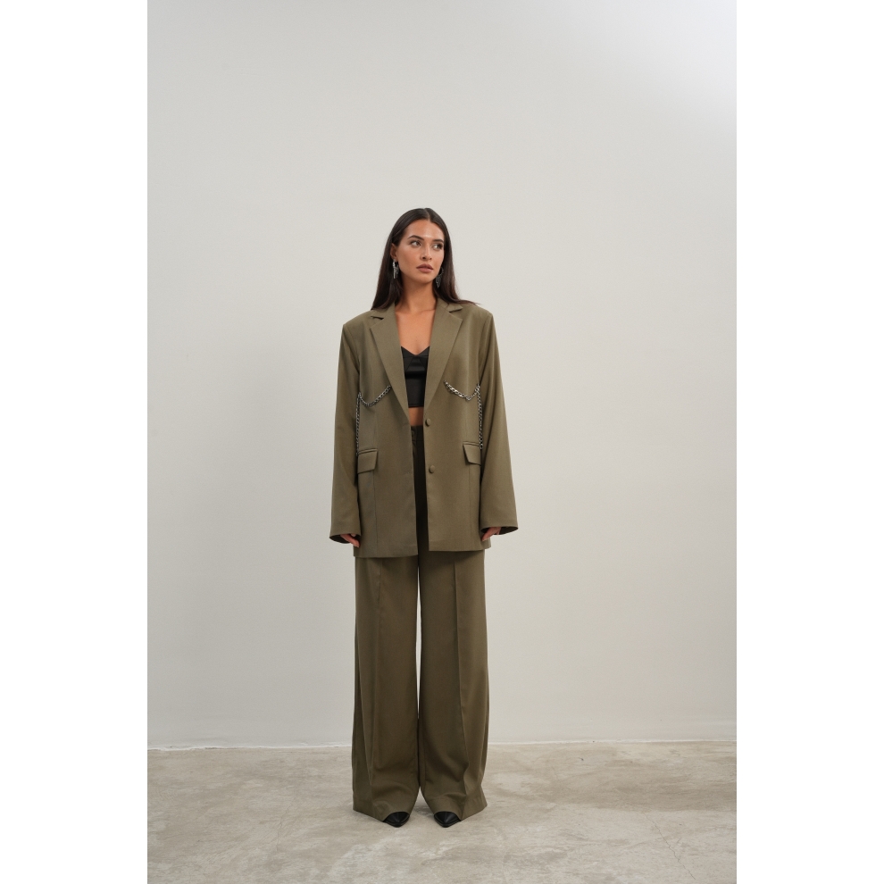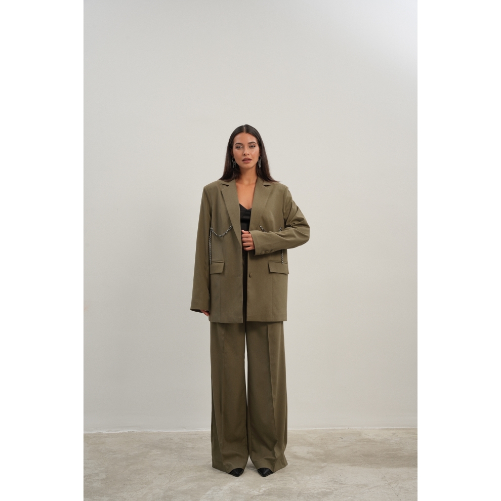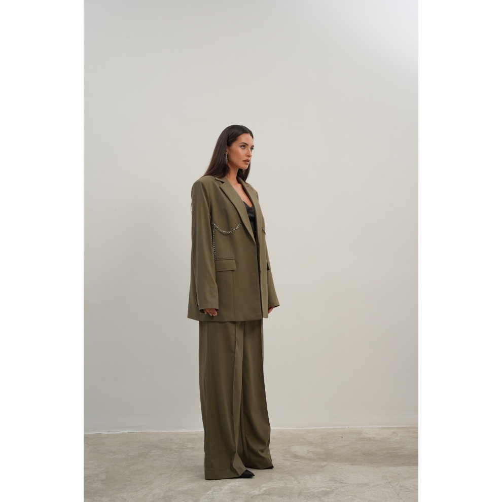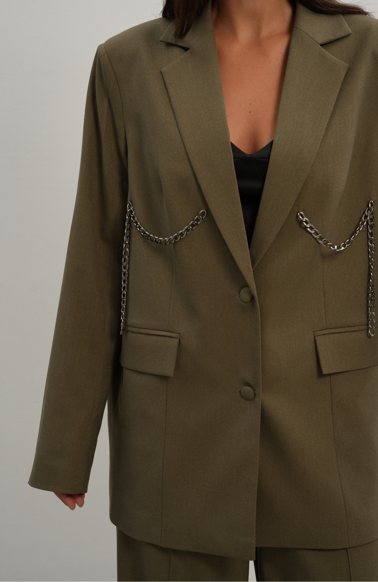 | Двубортный жакет прямого кроя выполнен из поливискозной ткани. На зоне груди расположена несъемная акцентная деталь в виде цепи. |