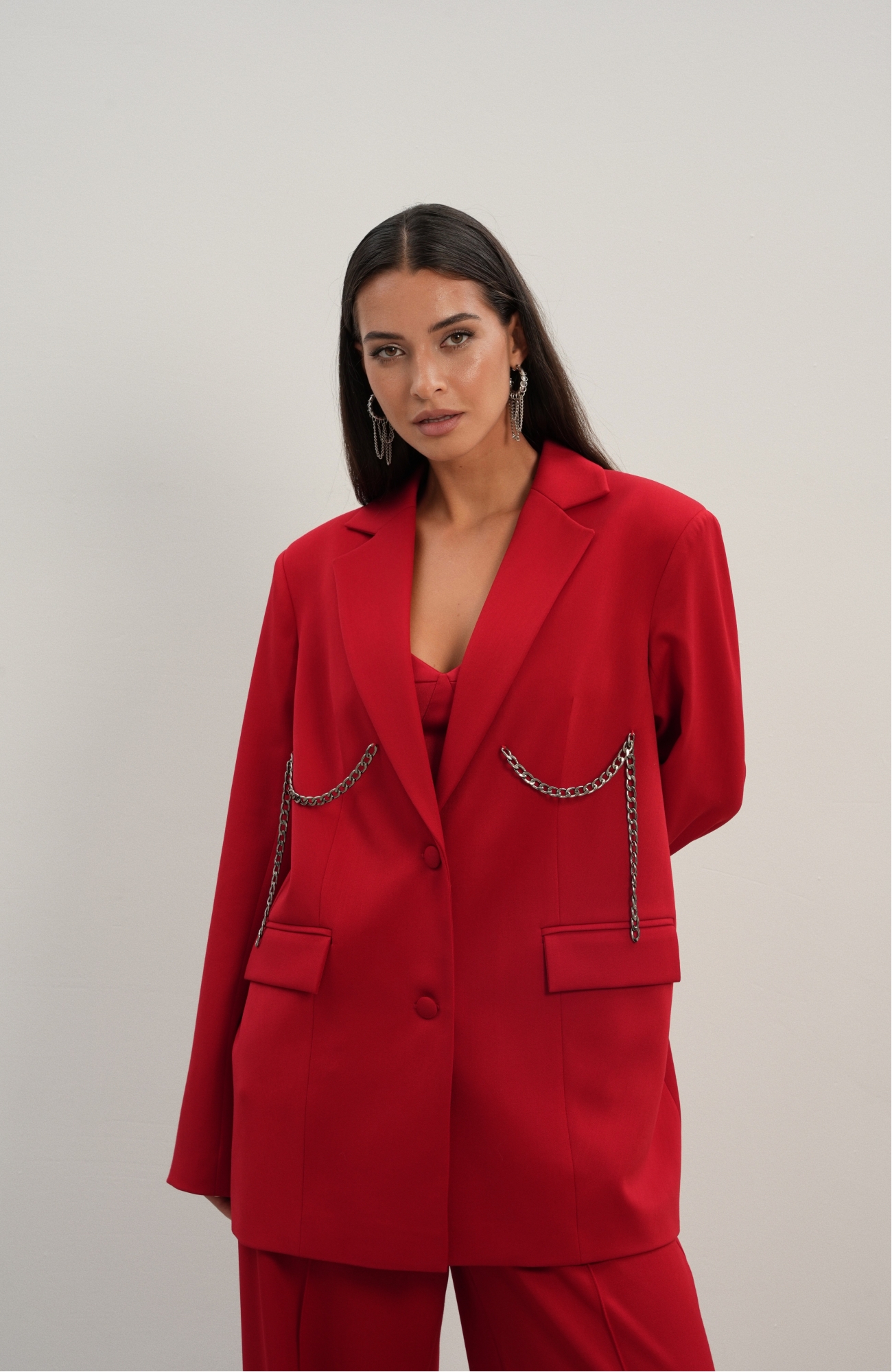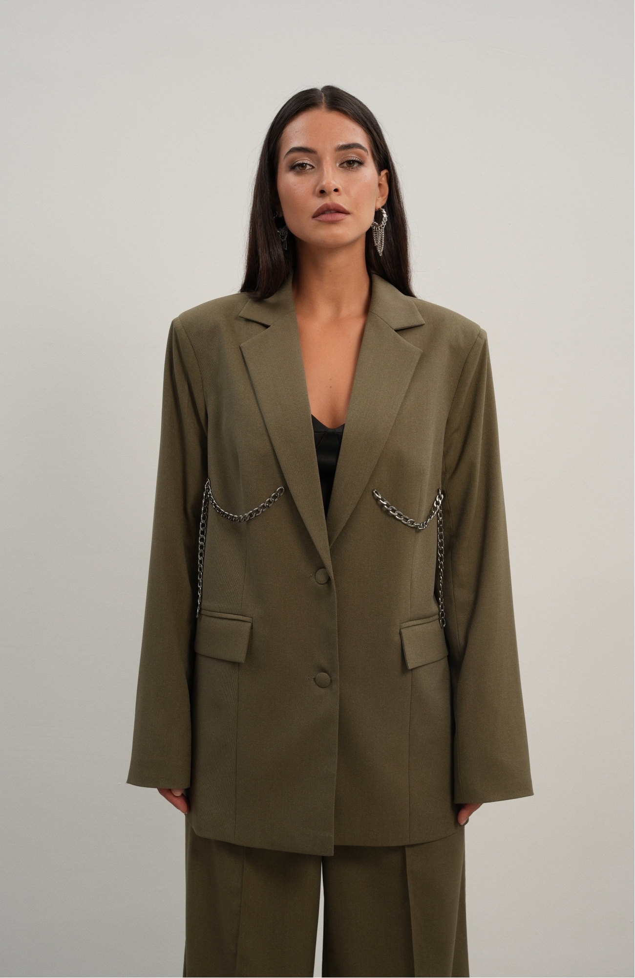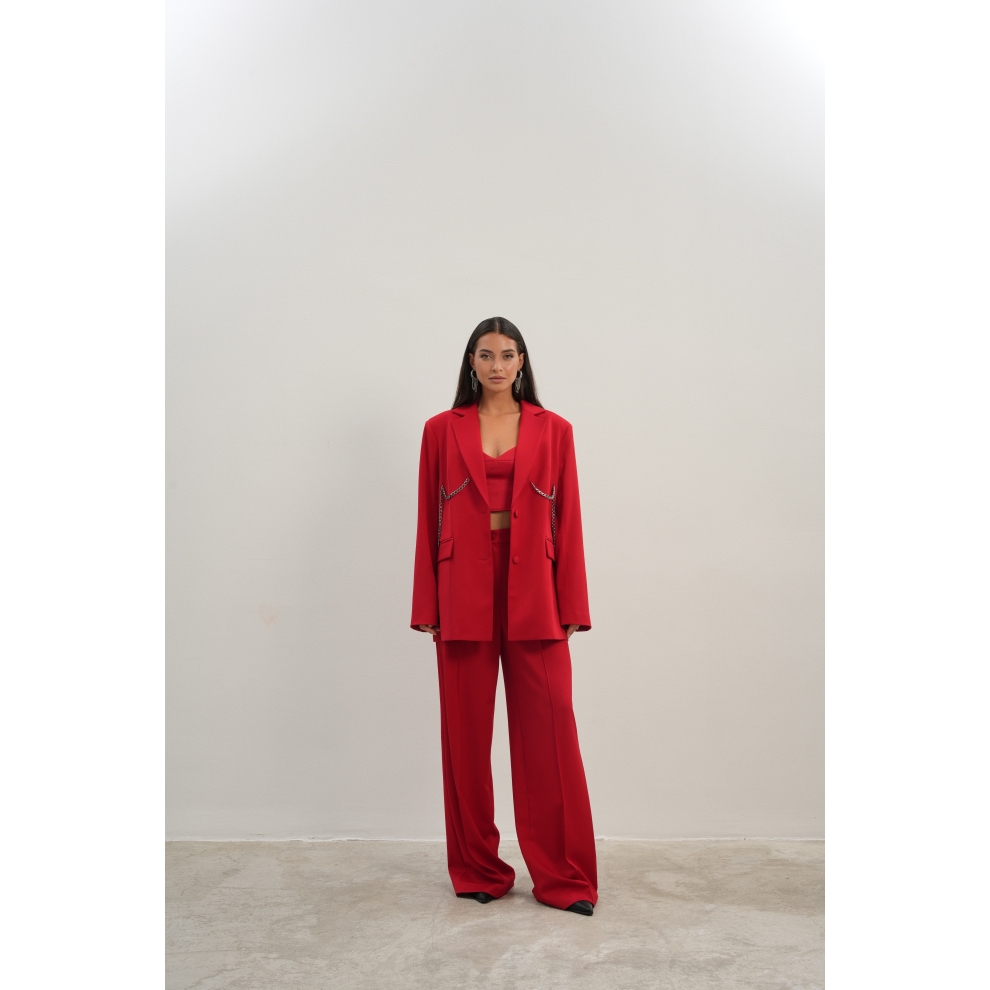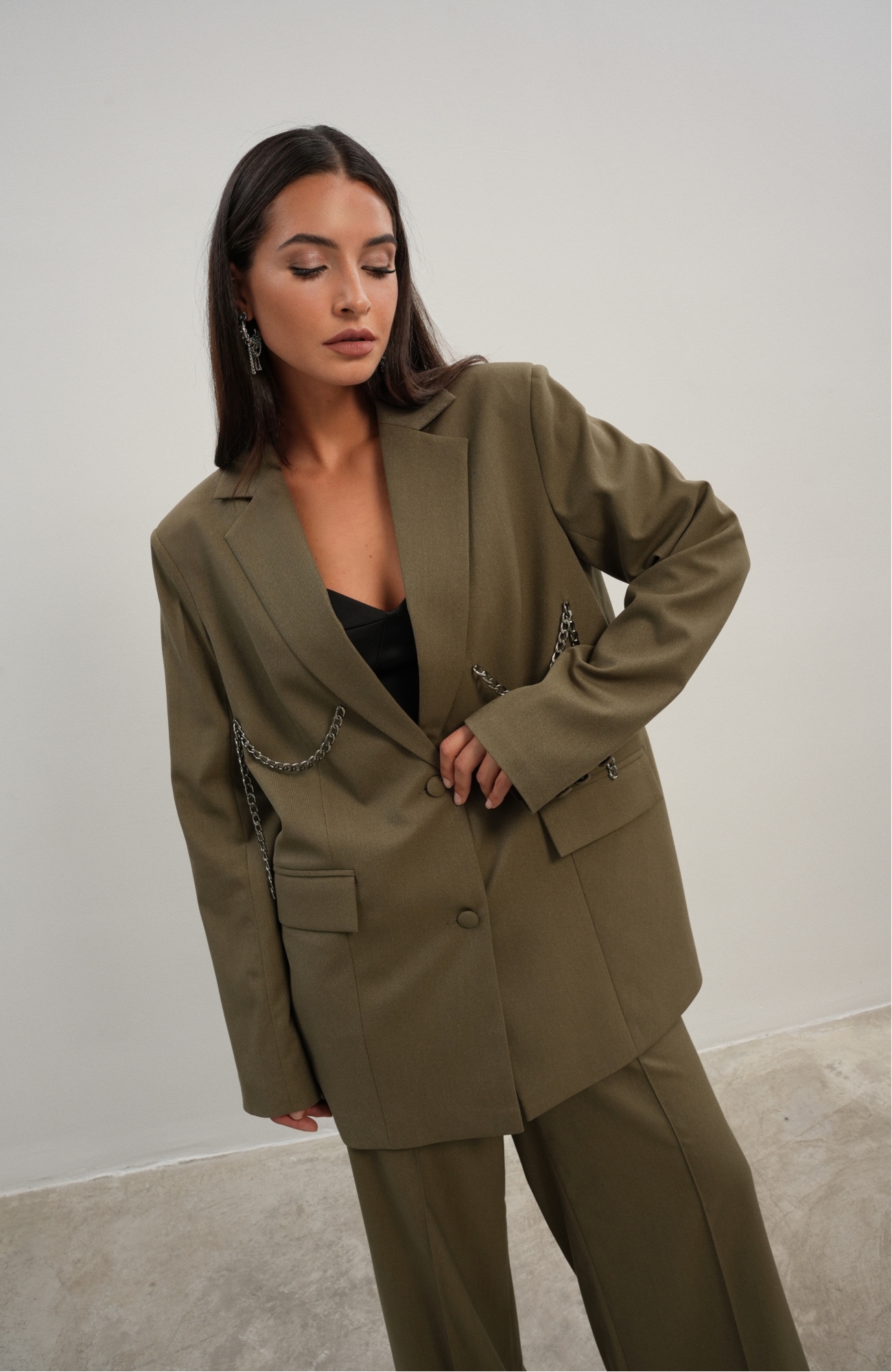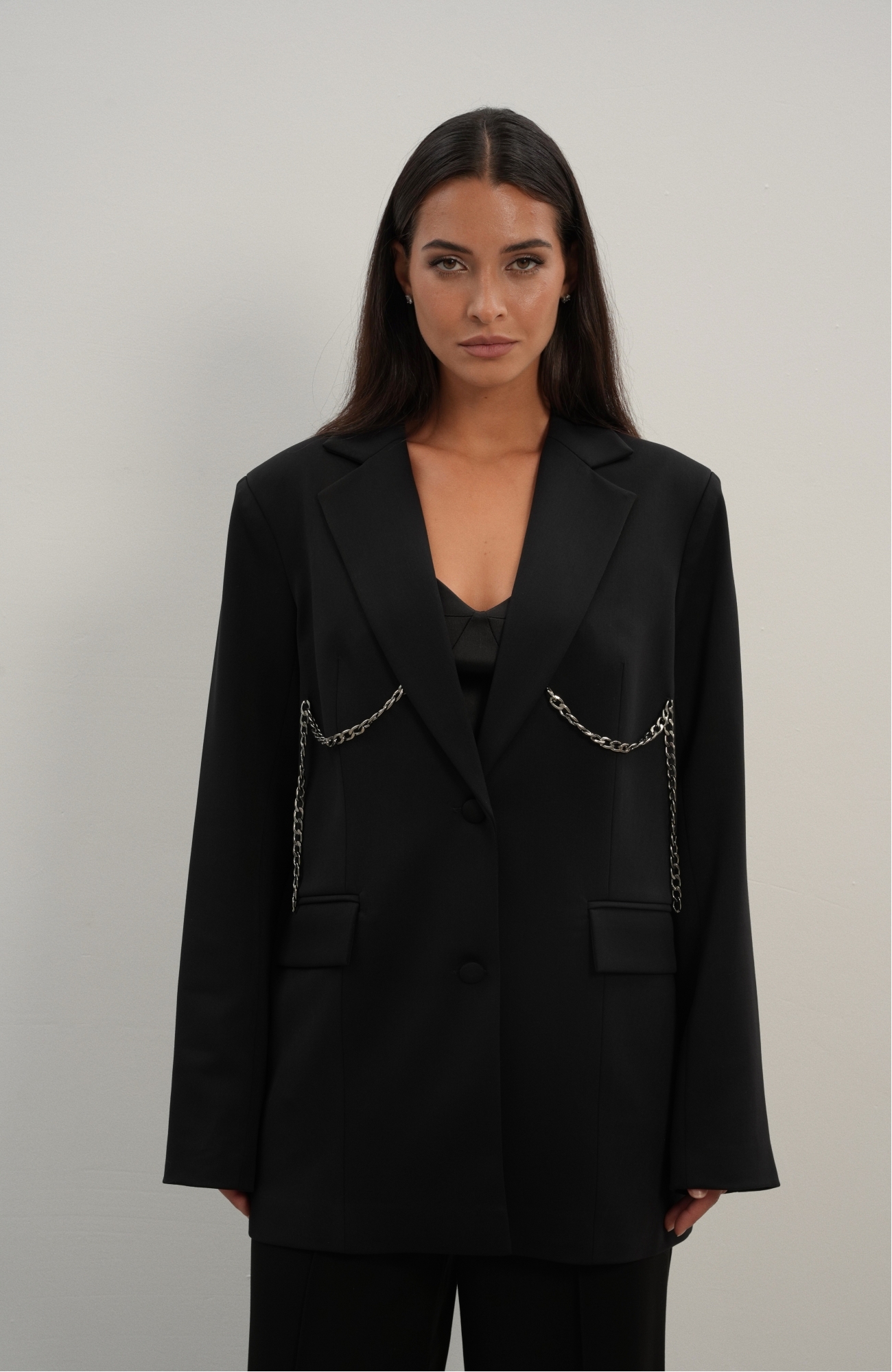 | Двубортный жакет прямого кроя выполнен из поливискозной ткани. На зоне груди расположена несъемная акцентная деталь в виде цепи. |