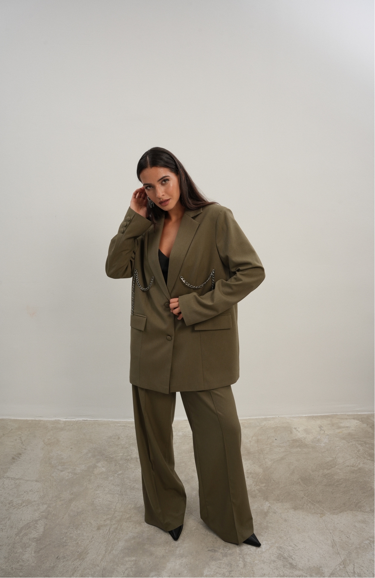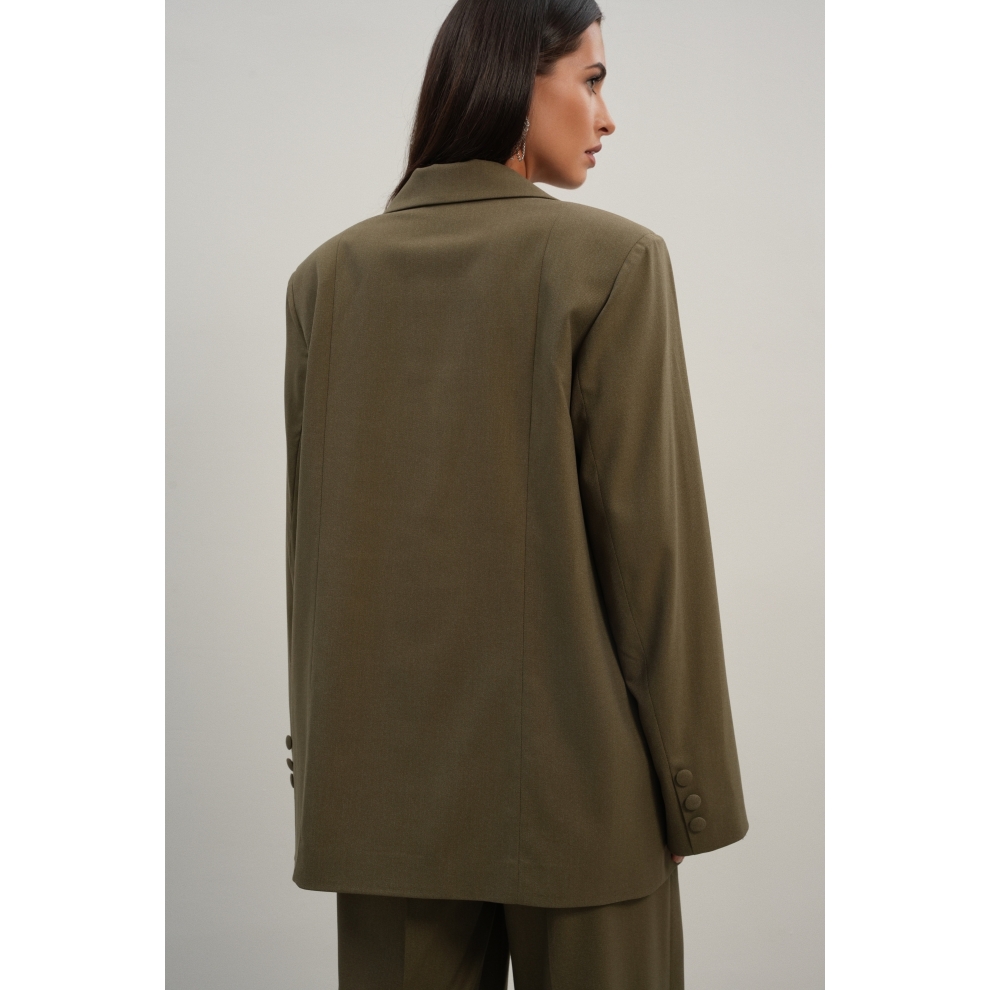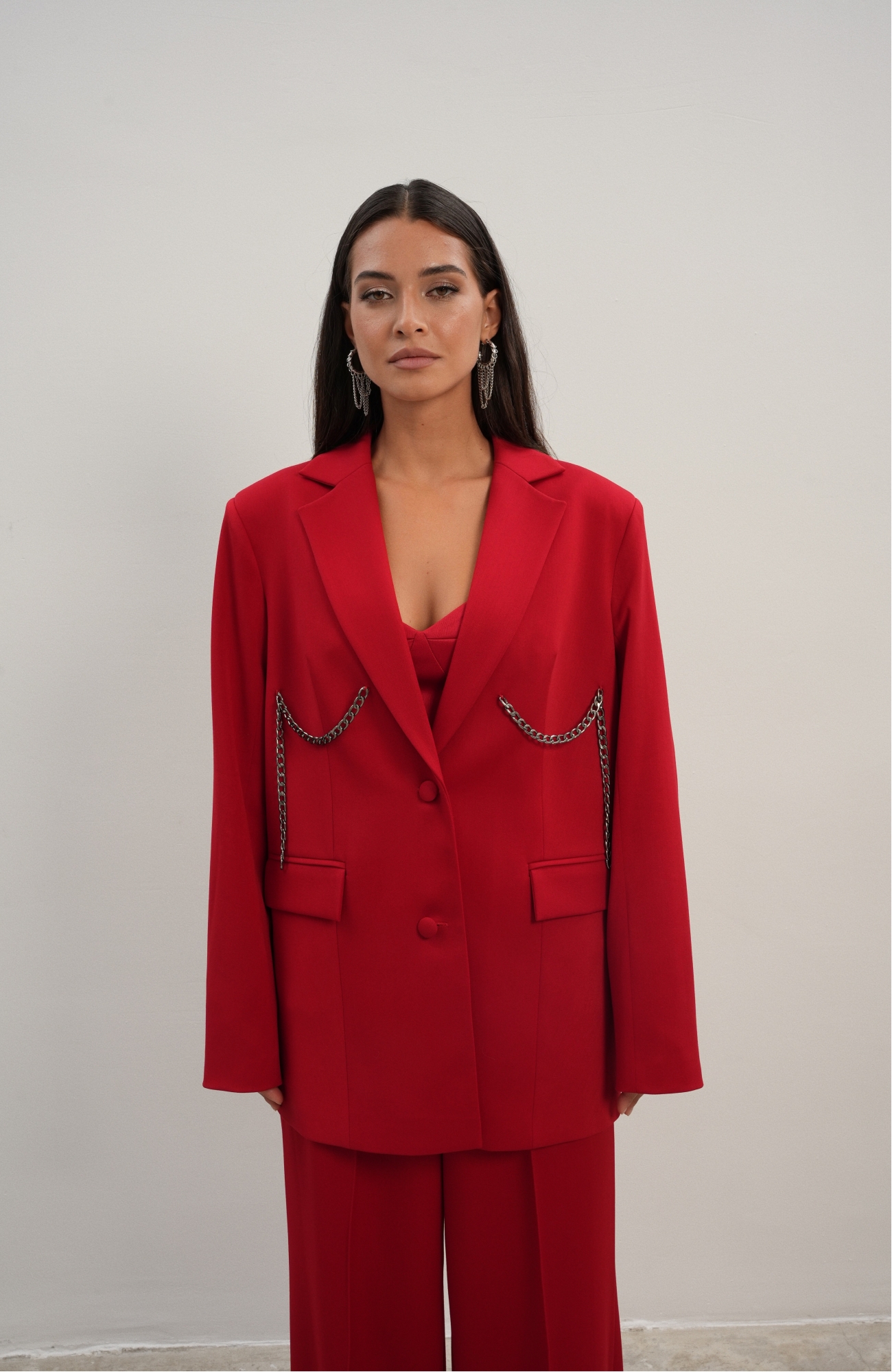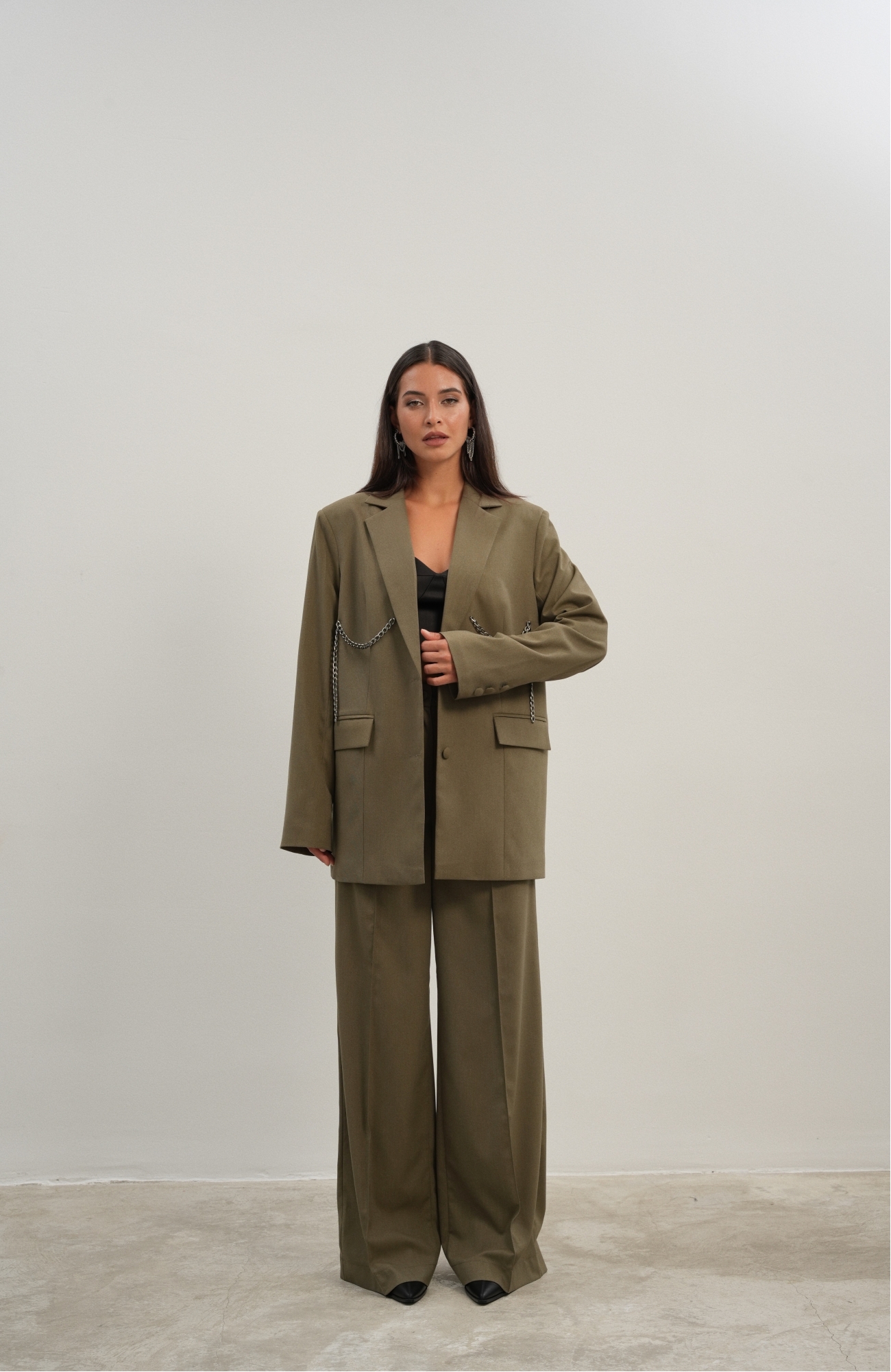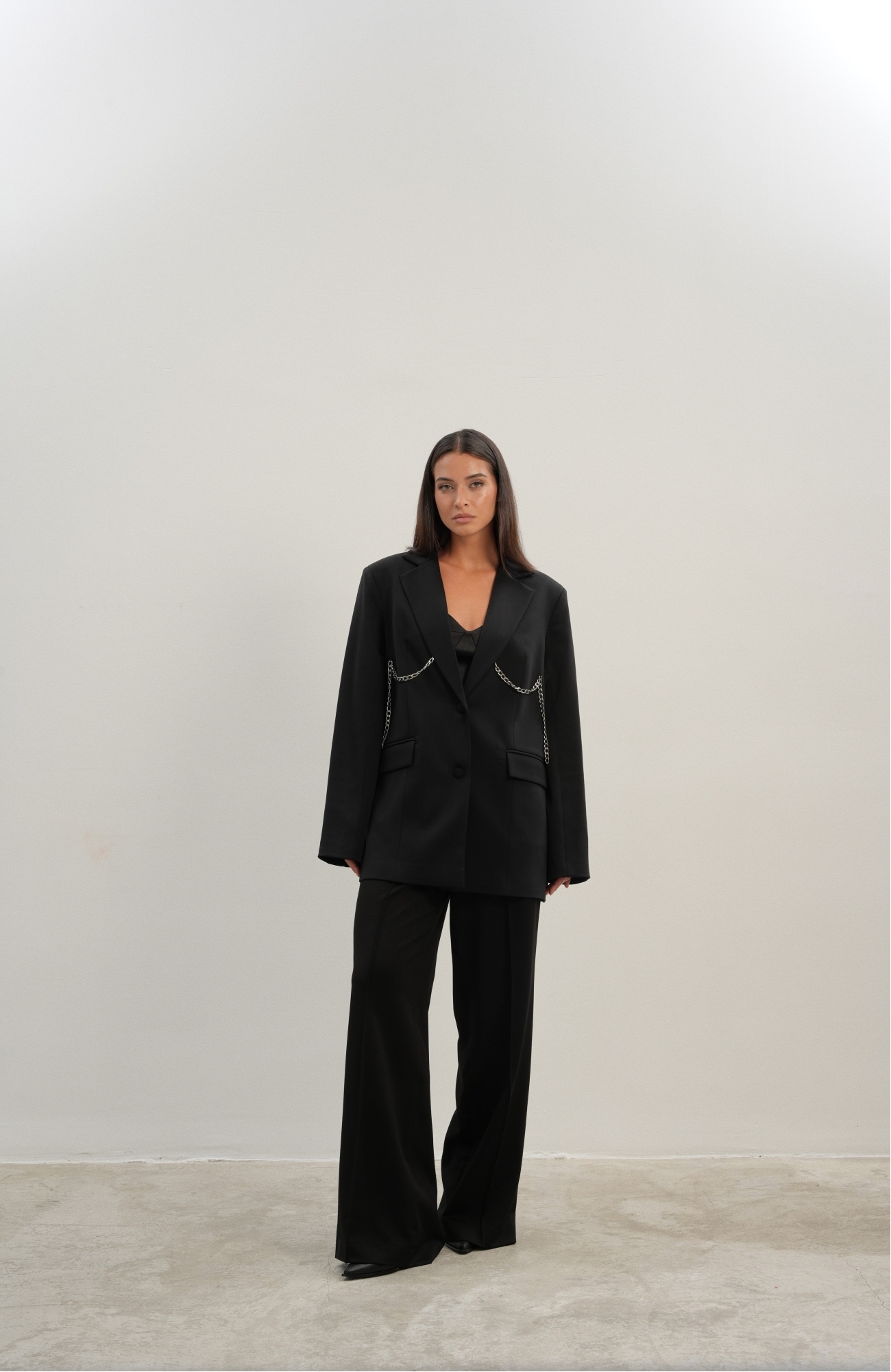 | Двубортный жакет прямого кроя выполнен из поливискозной ткани. На зоне груди расположена несъемная акцентная деталь в виде цепи. |