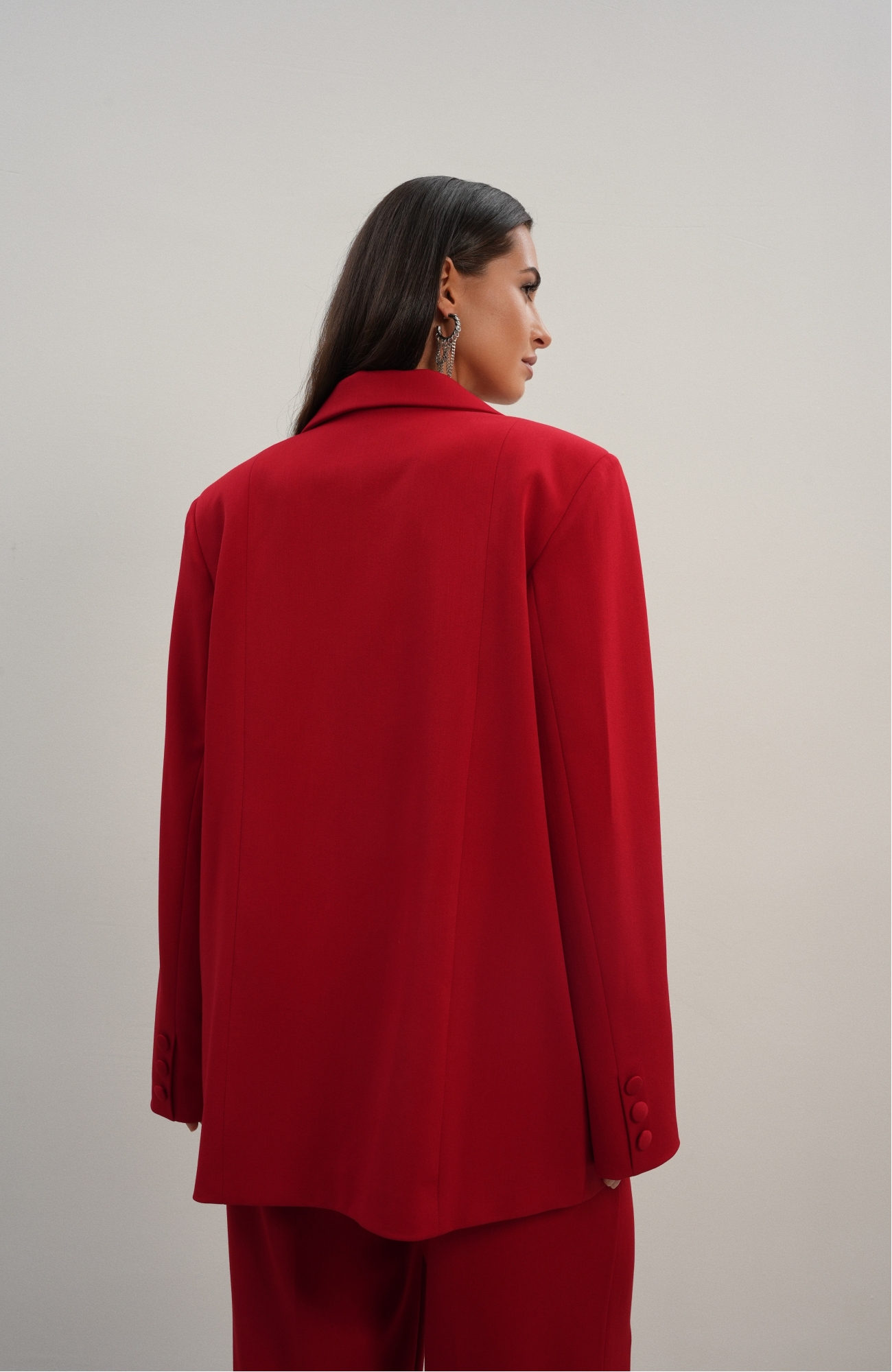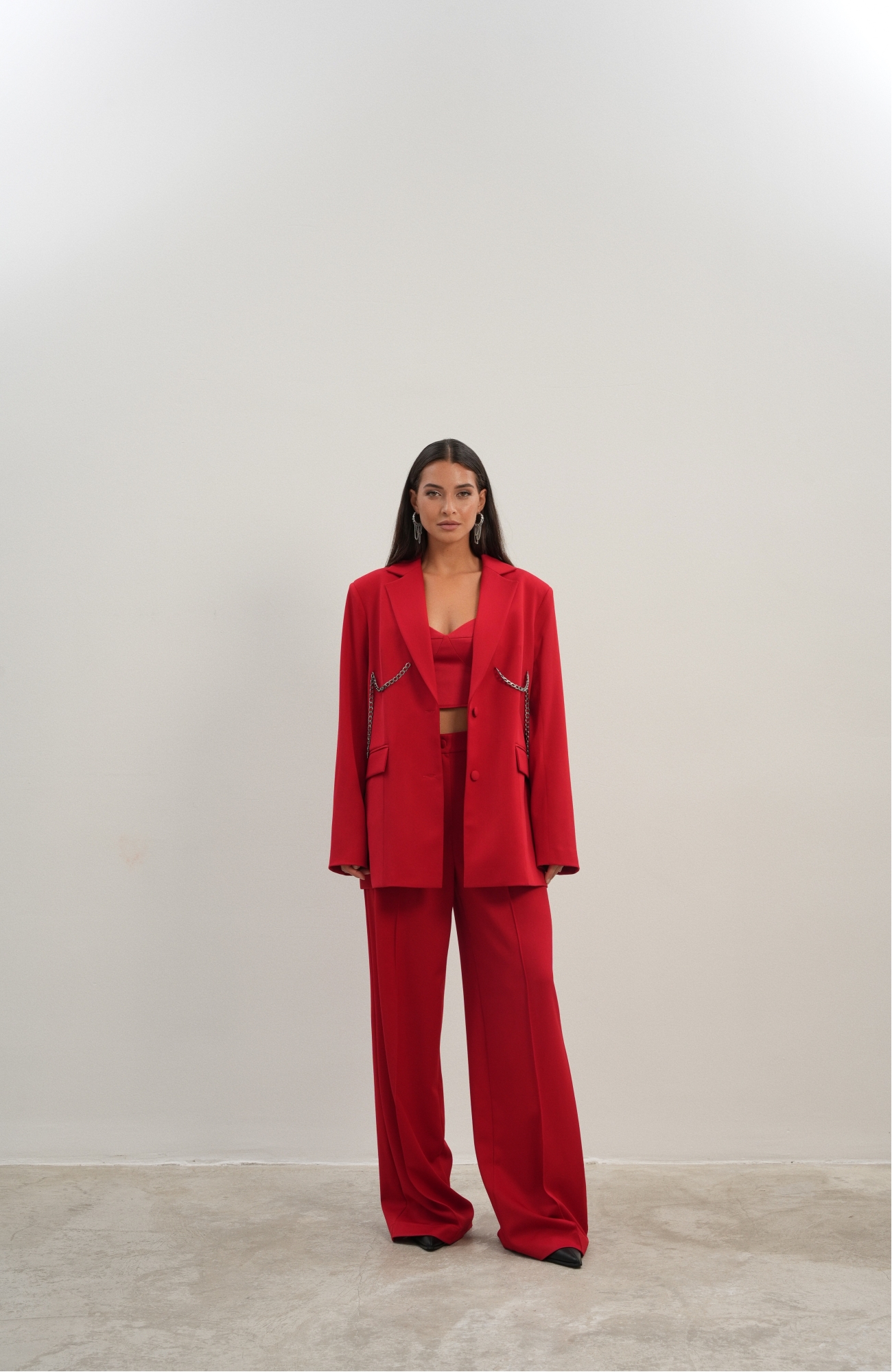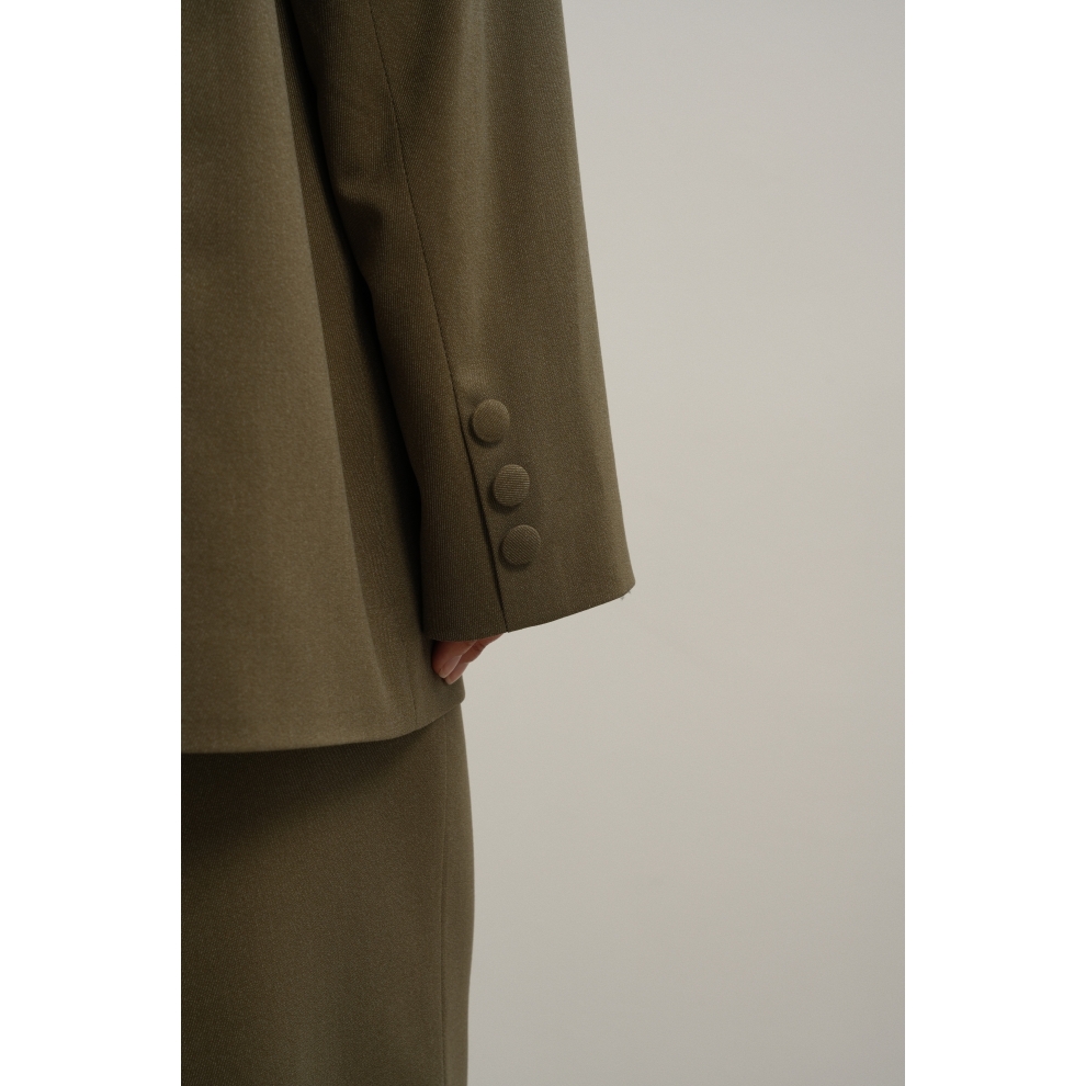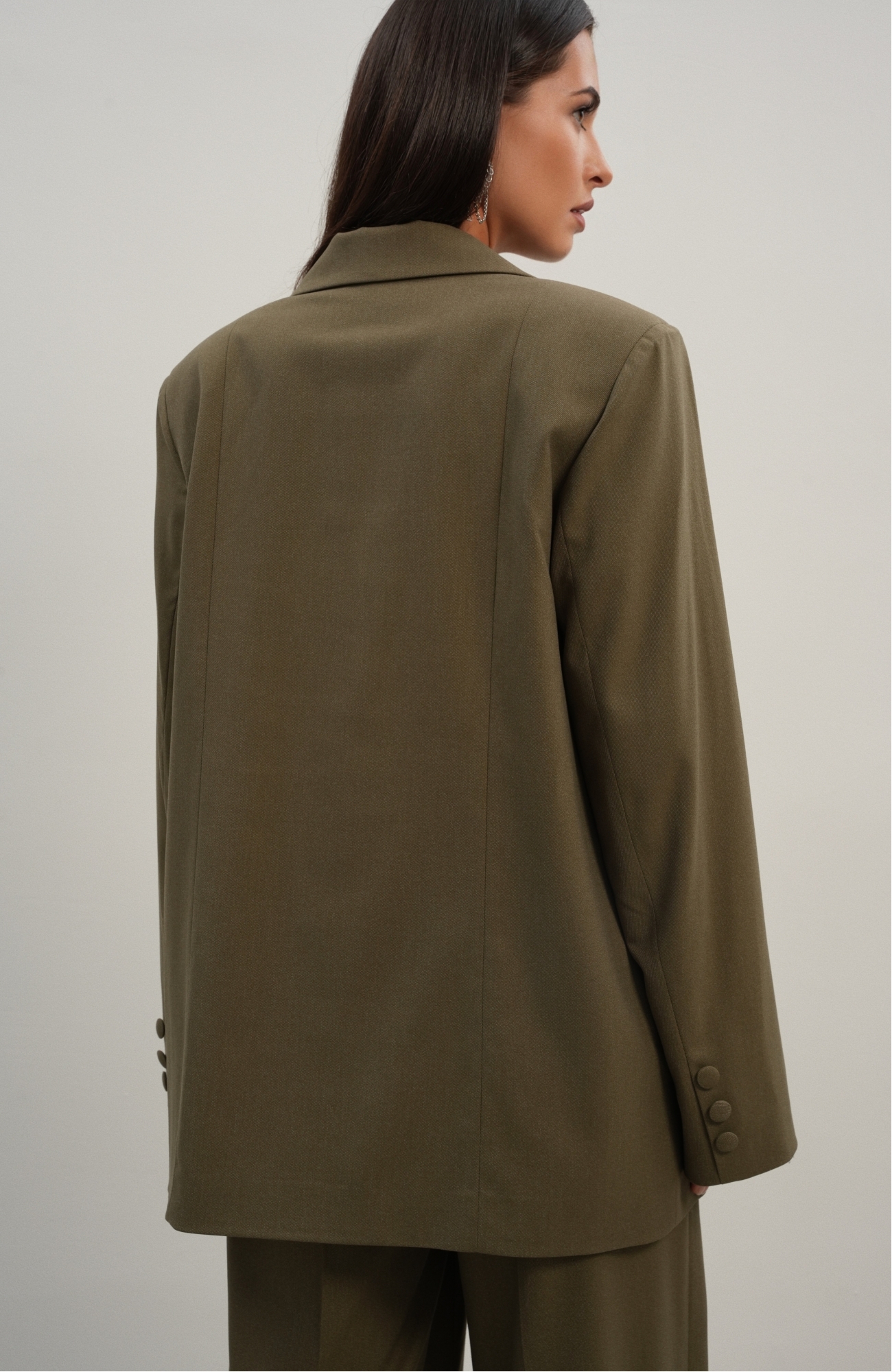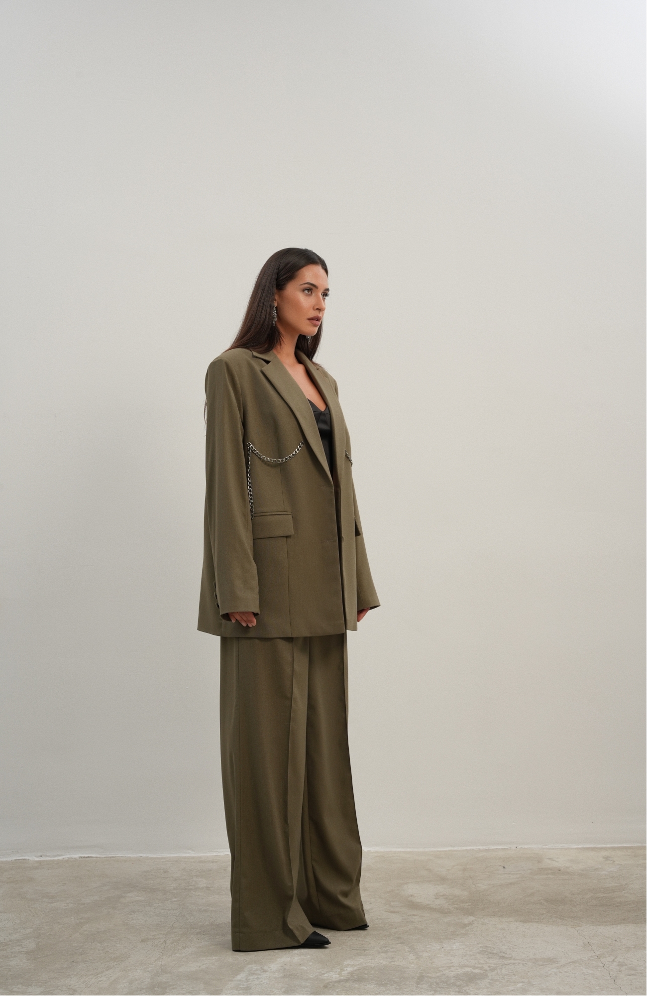 | Двубортный жакет прямого кроя выполнен из поливискозной ткани. На зоне груди расположена несъемная акцентная деталь в виде цепи. |