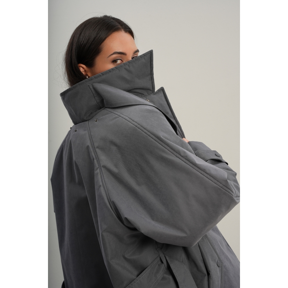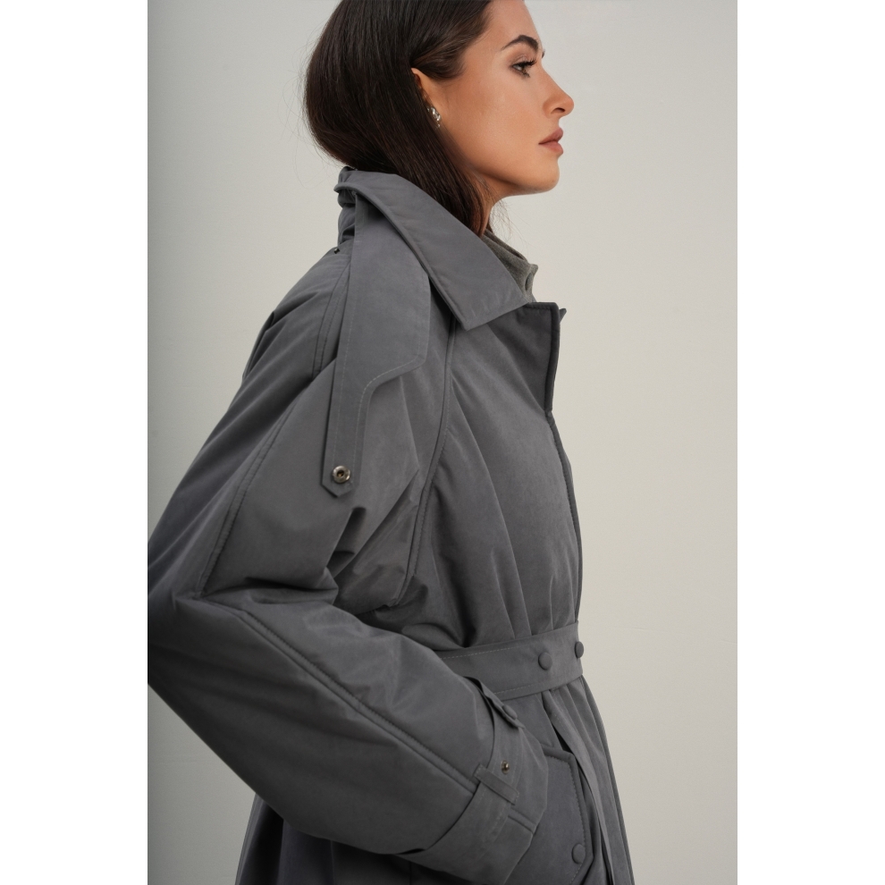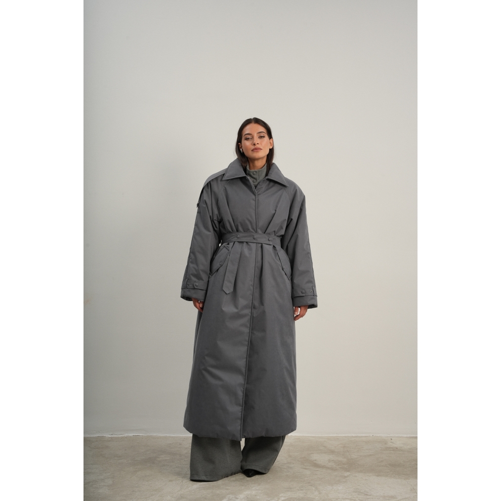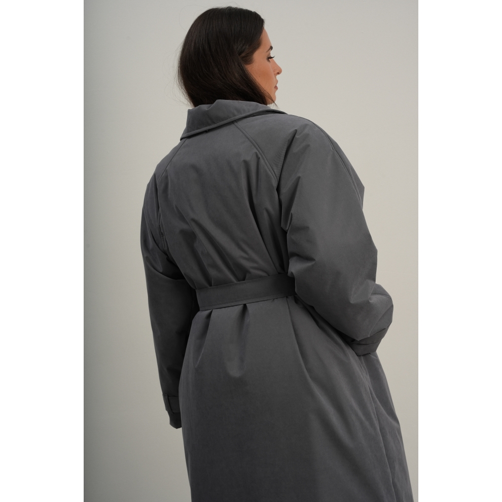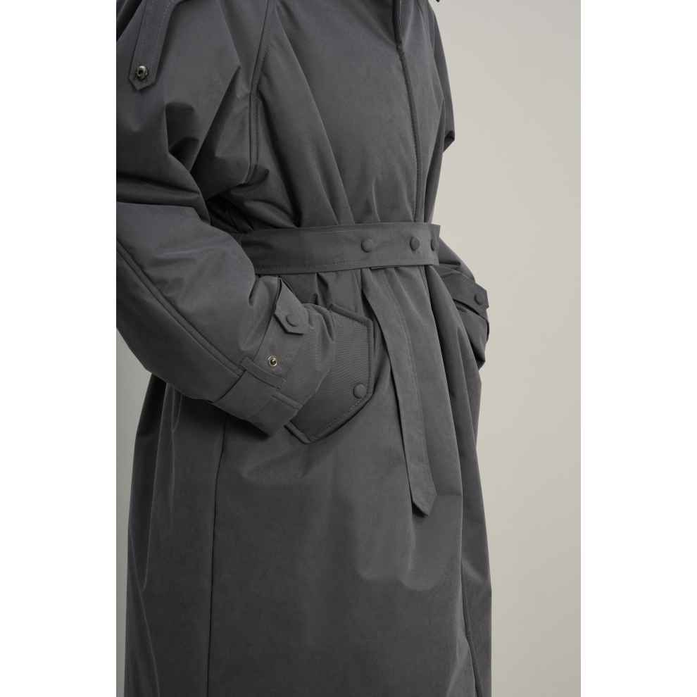 Утеплённая куртка прямого кроя в длине макси со съемной пелериной выполнена из современного ветронепродуваемого материала с водоотталкивающей пропиткой. Ткань имеет легкую фактуру в виде мелких полосок и слегка бархатистую на ощупь поверхность. Застежка в виде кнопок под обтяжку. Пояс застегивается также на кнопки. Паты по низу рукава служат для регулировки. Температурный режим до -15.