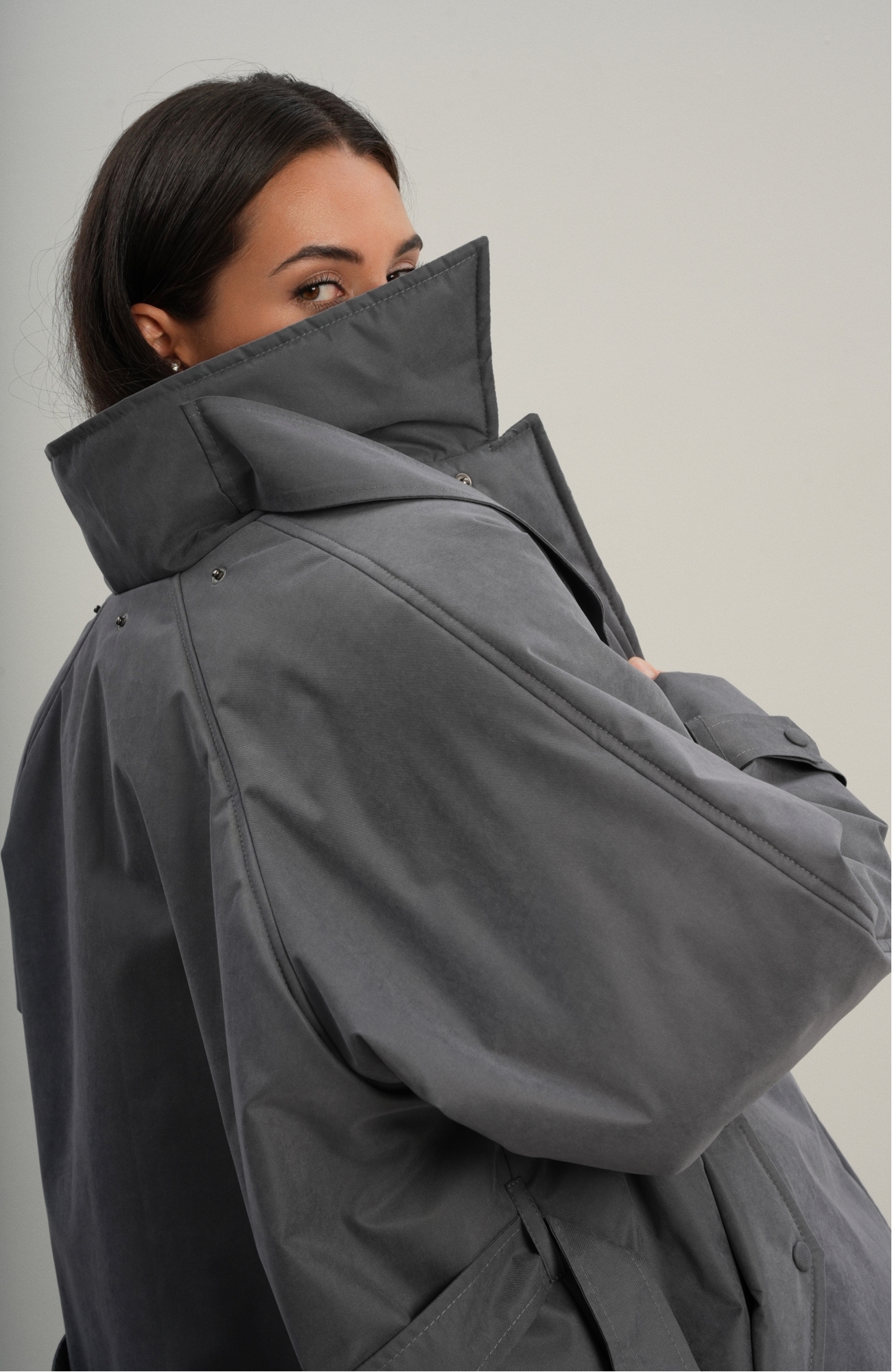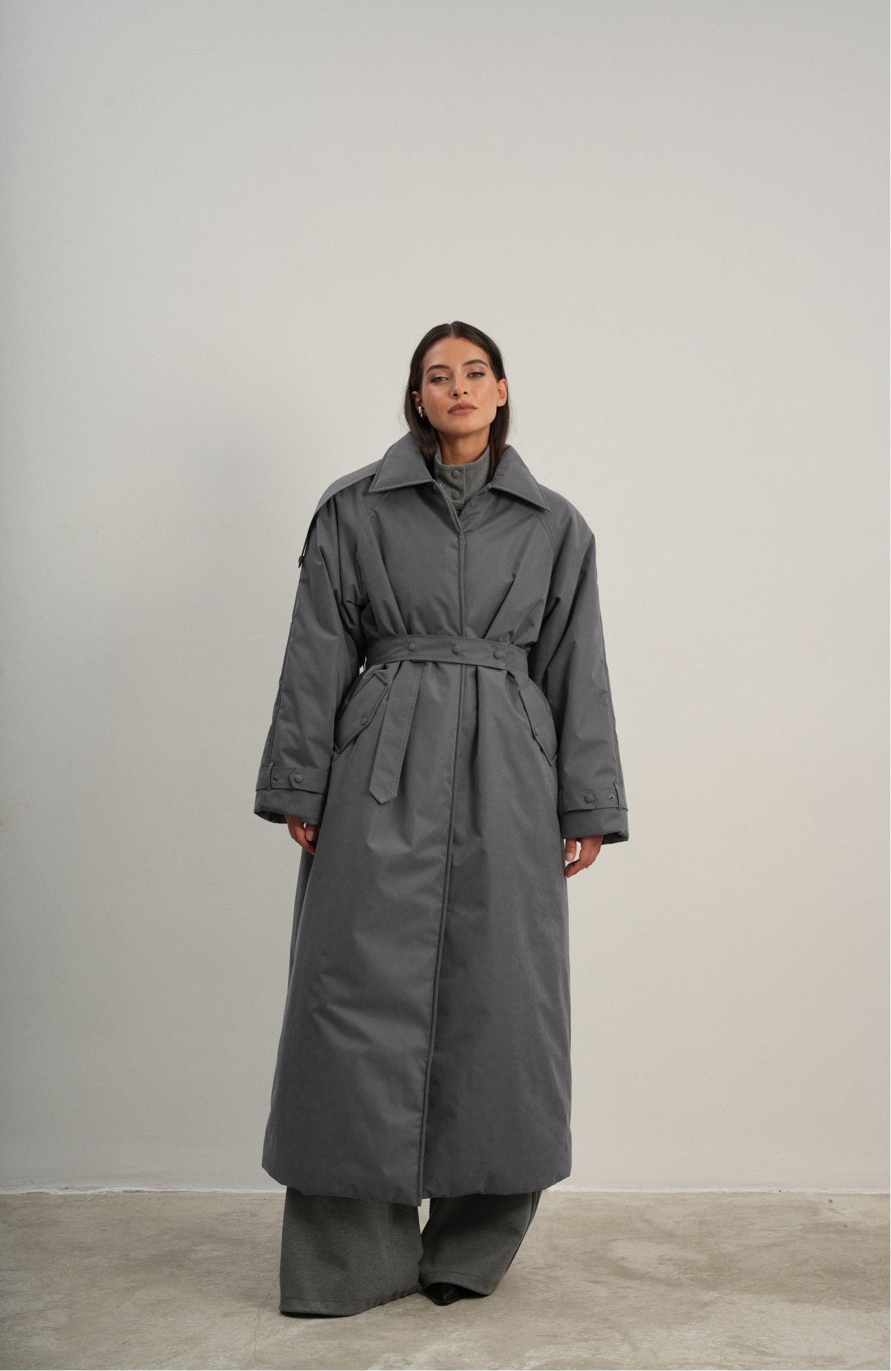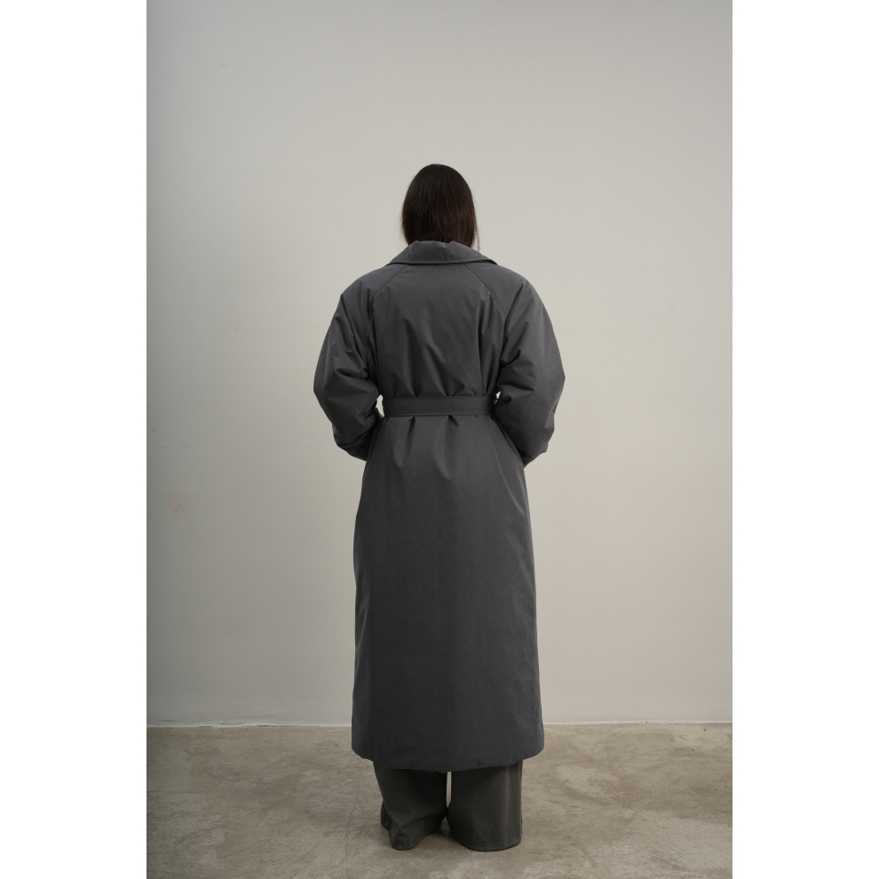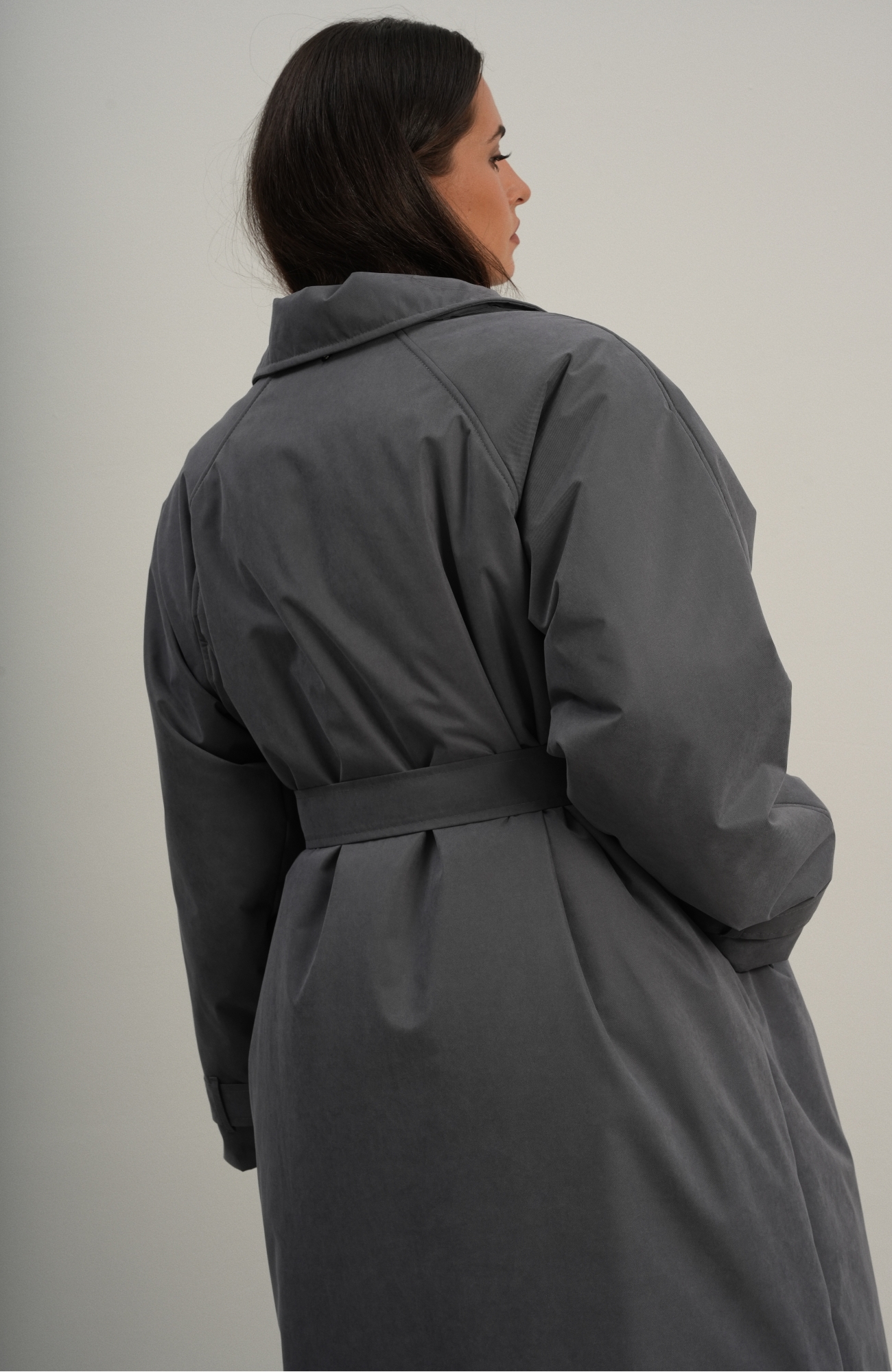 Утеплённая куртка прямого кроя в длине макси со съемной пелериной выполнена из современного ветронепродуваемого материала с водоотталкивающей пропиткой. Ткань имеет легкую фактуру в виде мелких полосок и слегка бархатистую на ощупь поверхность. Застежка в виде кнопок под обтяжку. Пояс застегивается также на кнопки. Паты по низу рукава служат для регулировки. Температурный режим до -15.