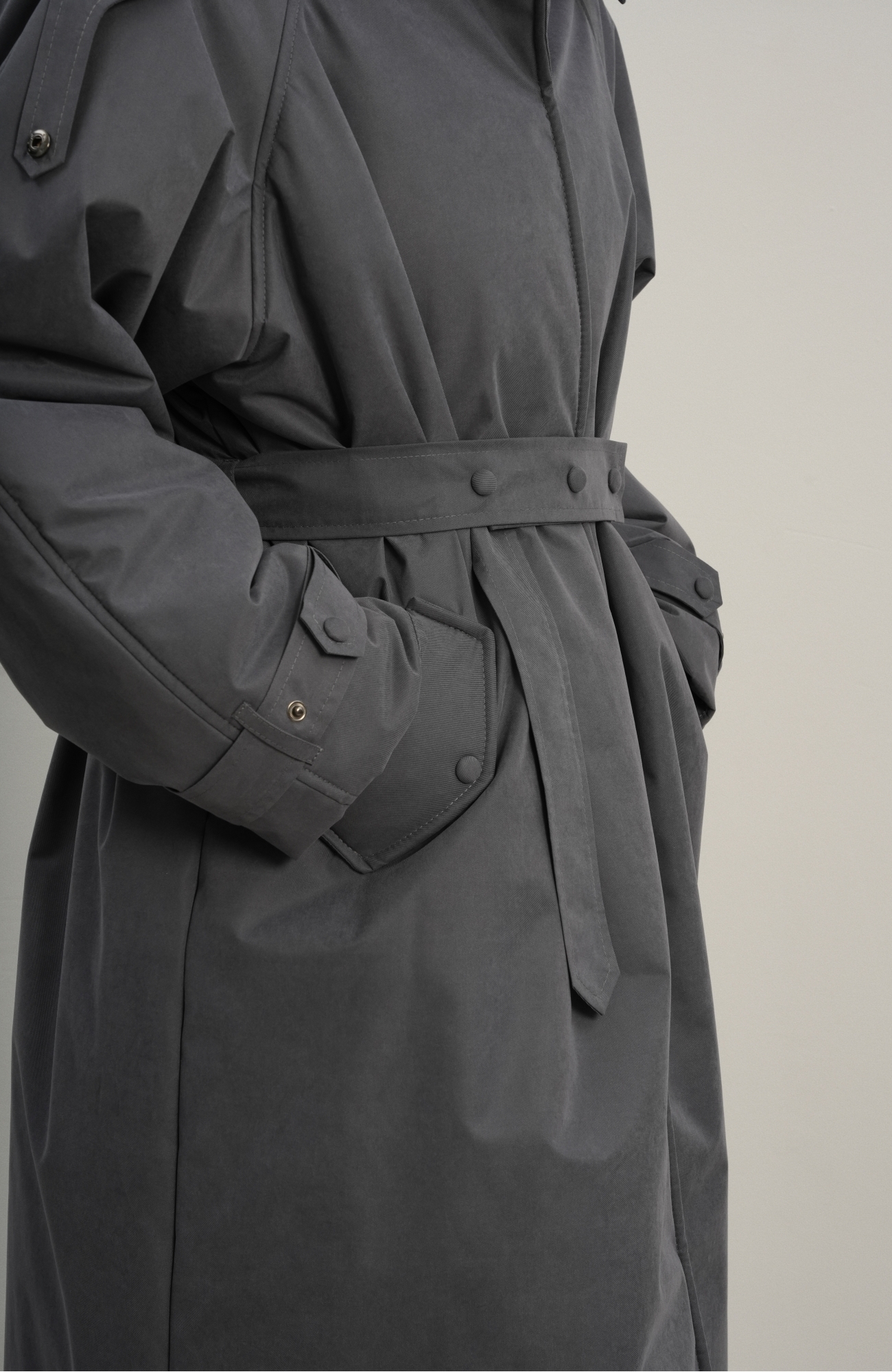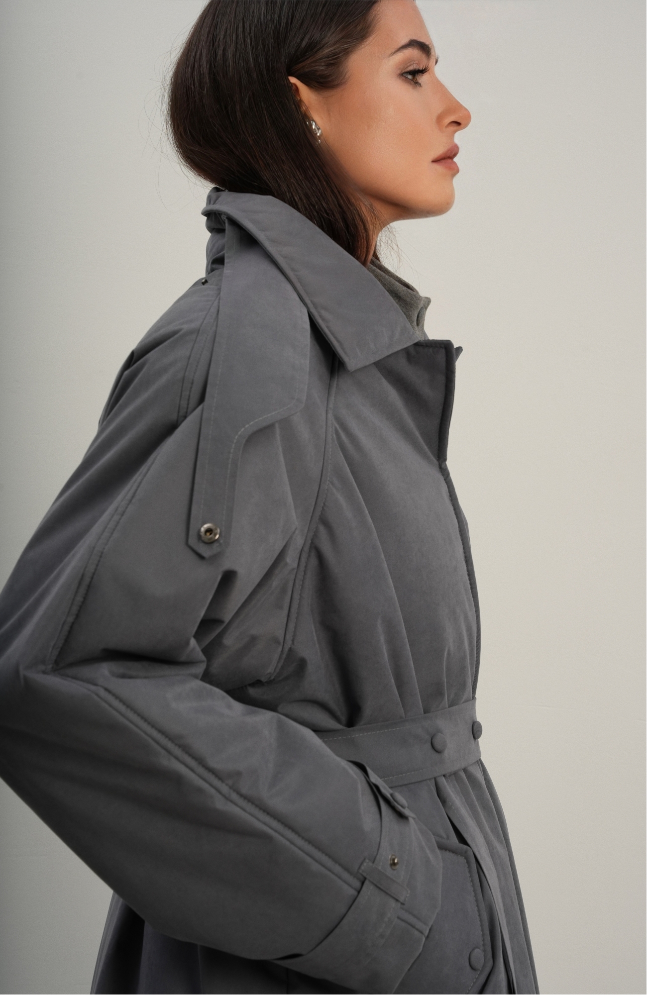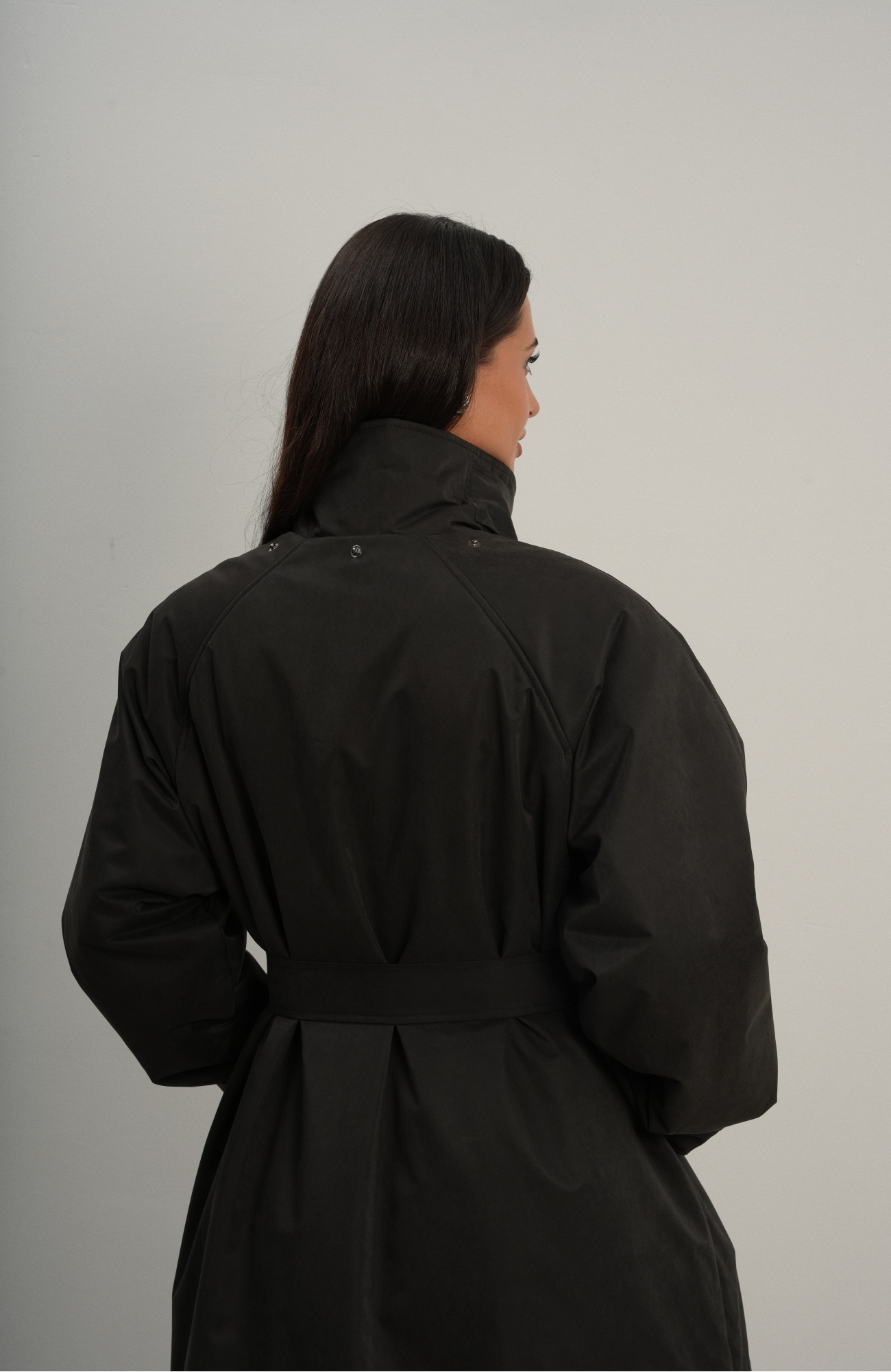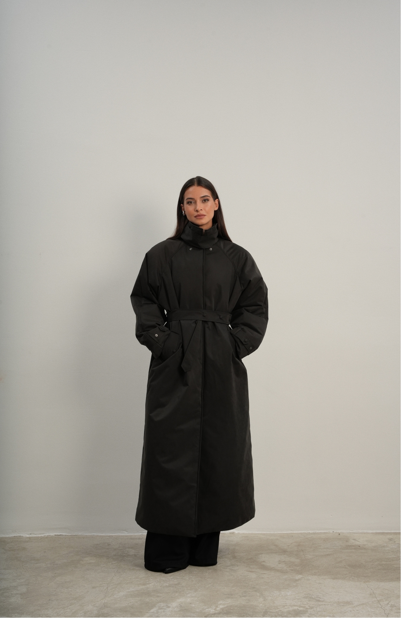 Утеплённая куртка прямого кроя в длине макси со съемной пелериной выполнена из современного ветронепродуваемого материала с водоотталкивающей пропиткой. Ткань имеет легкую фактуру в виде мелких полосок и слегка бархатистую на ощупь поверхность. Застежка в виде кнопок под обтяжку. Пояс застегивается также на кнопки. Паты по низу рукава служат для регулировки. Температурный режим до -15.