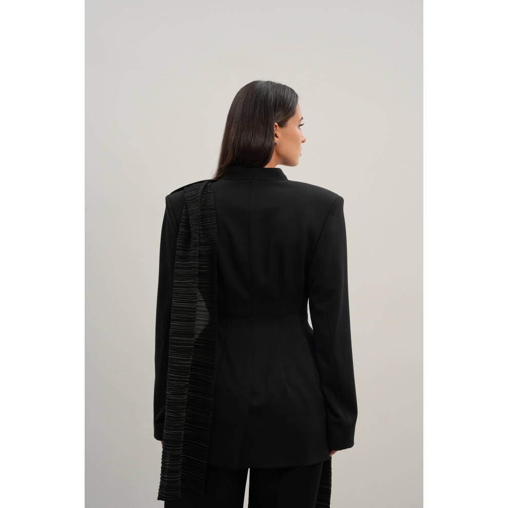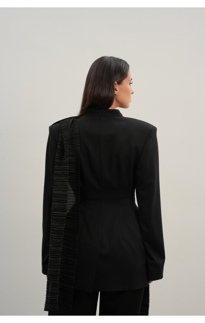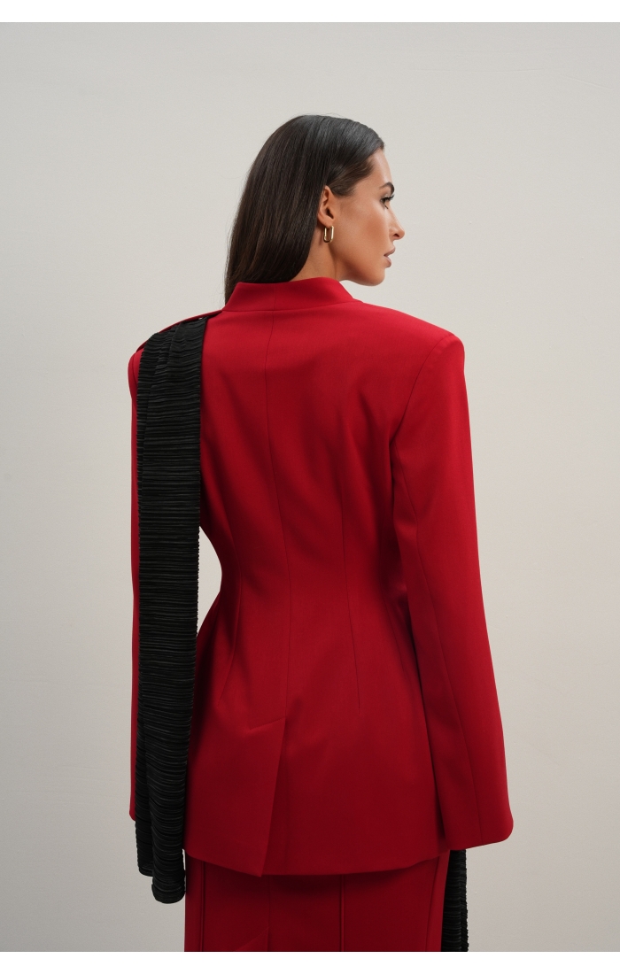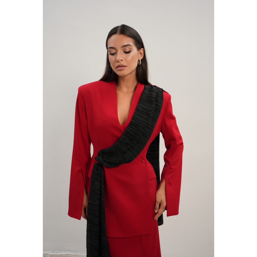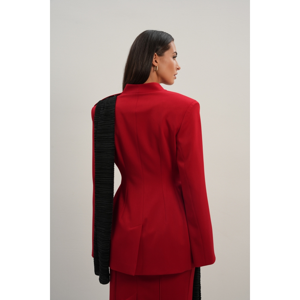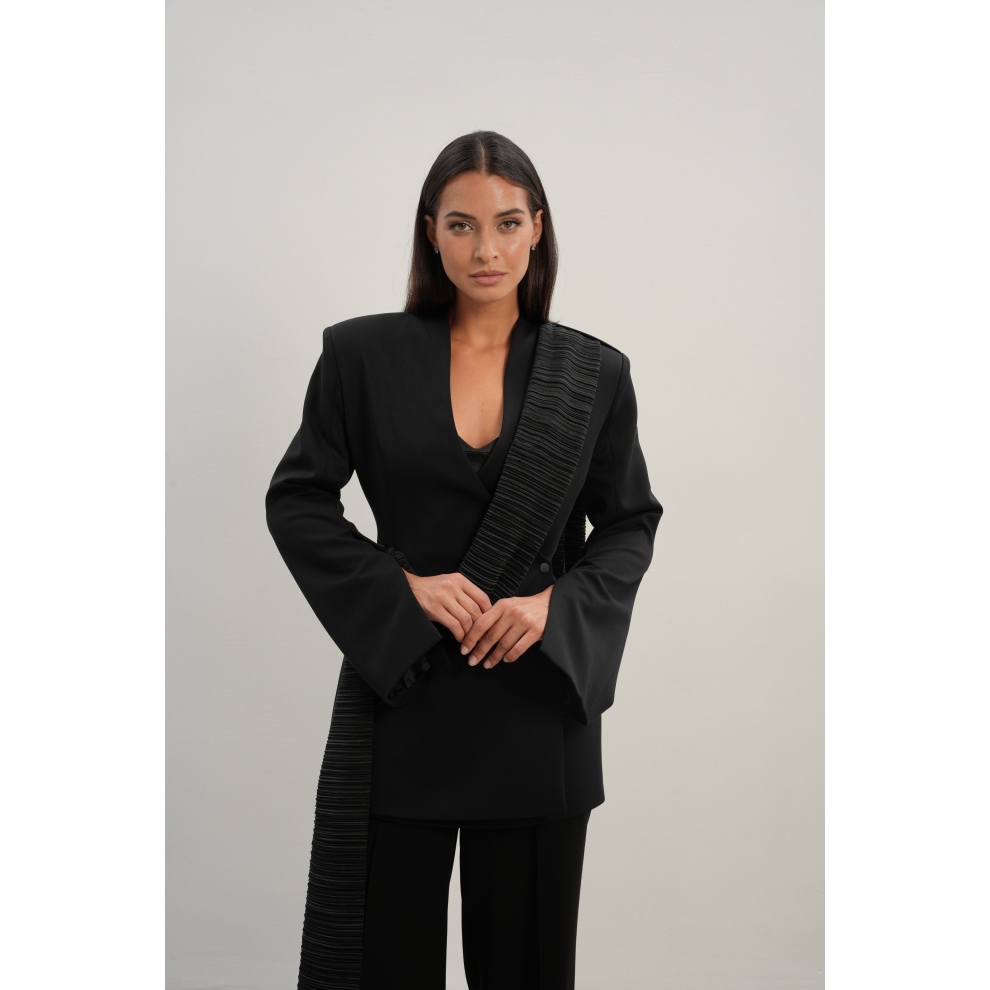 | Жакет приталенного кроя выполнен из поливискозной ткани. Имеет акцентные плечи и выраженную талию, тем самым создает силуэт песочных часов. На жакете расположены кнопки, которыми можно регулировать объем талии. В комплекте идет съемная декоративная деталь в виде ткани гофре, которая крепится на хлястик в районе плечевого шва и талии. Дополните образ брюками палаццо |