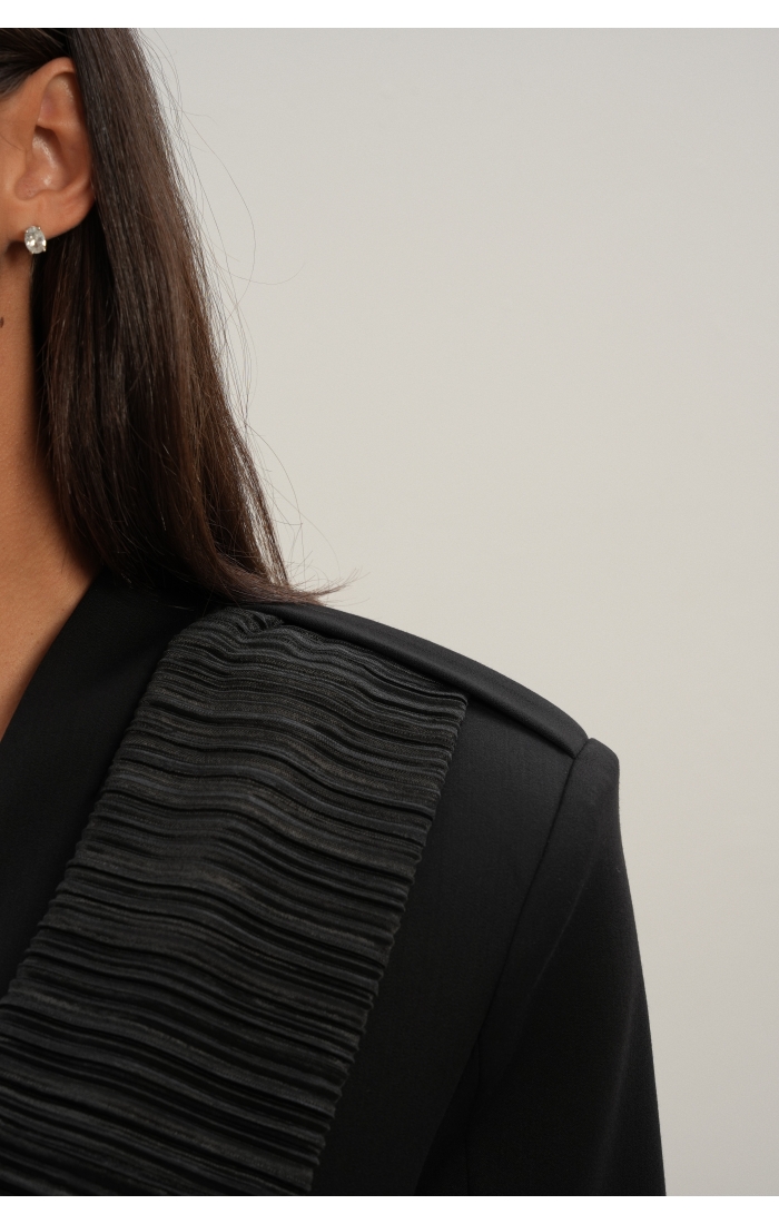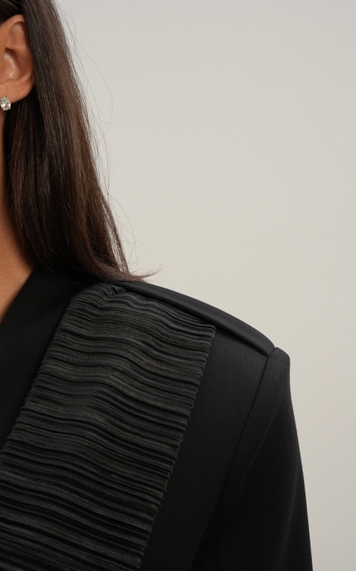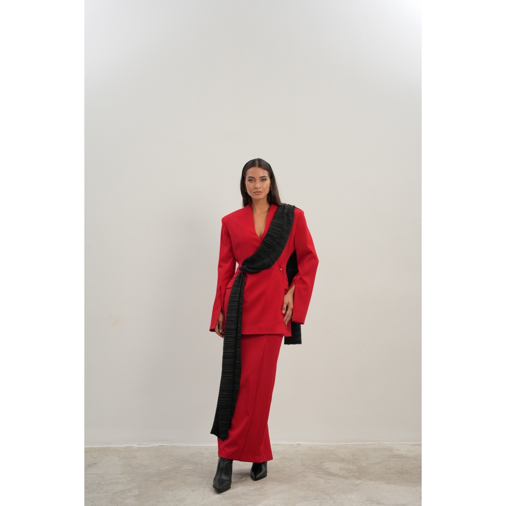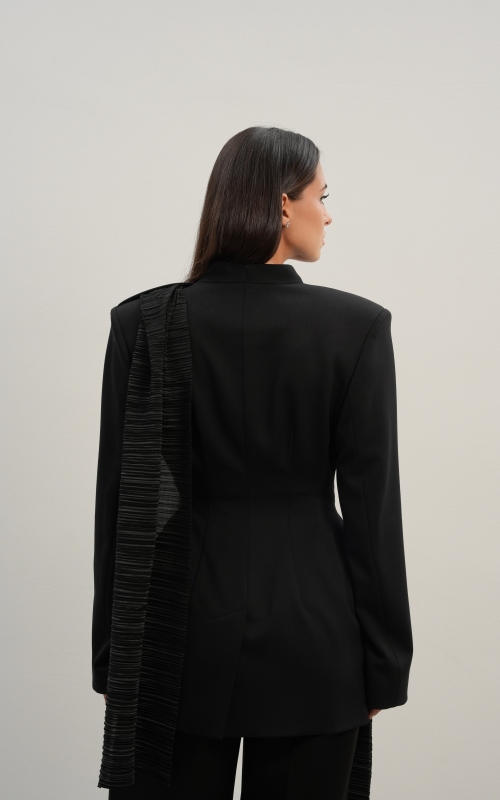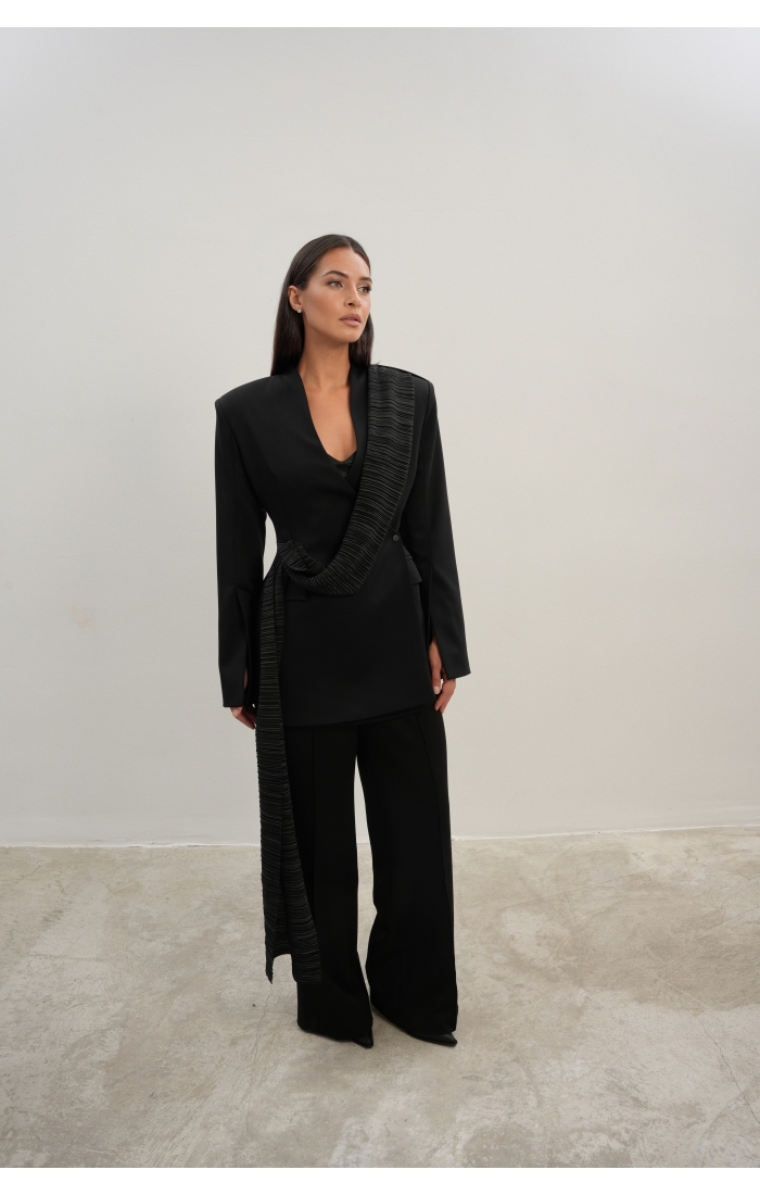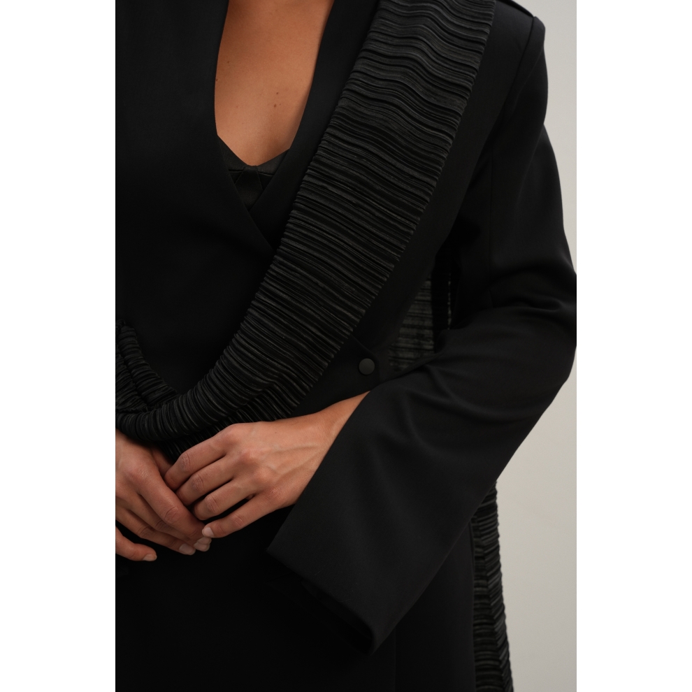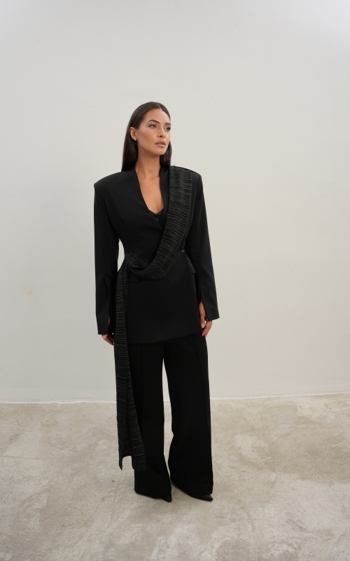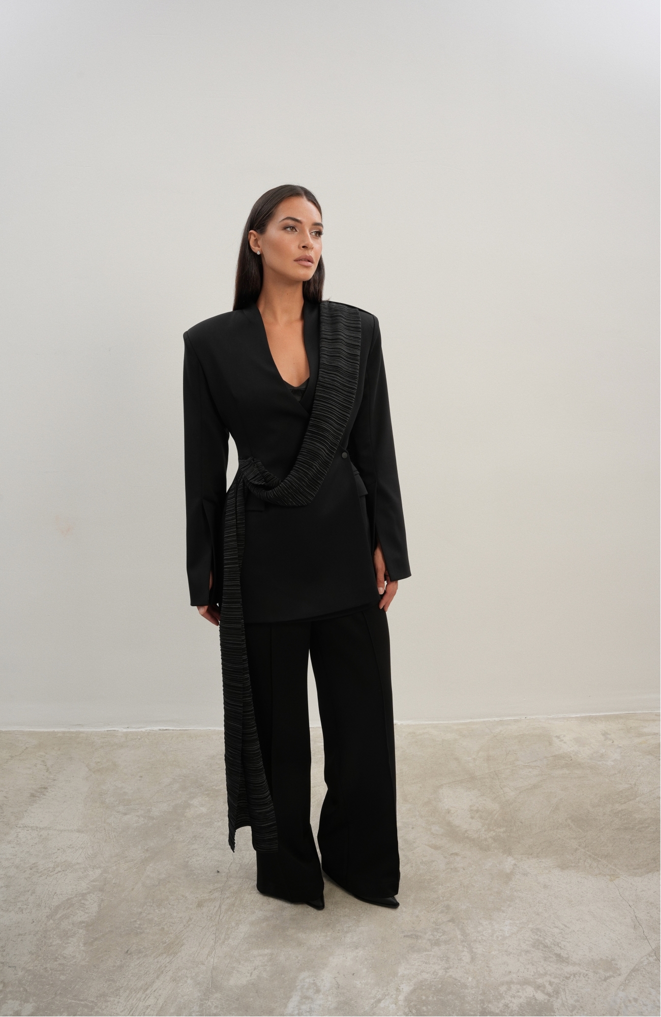 | Жакет приталенного кроя выполнен из поливискозной ткани. Имеет акцентные плечи и выраженную талию, тем самым создает силуэт песочных часов. На жакете расположены кнопки, которыми можно регулировать объем талии. В комплекте идет съемная декоративная деталь в виде ткани гофре, которая крепится на хлястик в районе плечевого шва и талии. Дополните образ брюками палаццо |