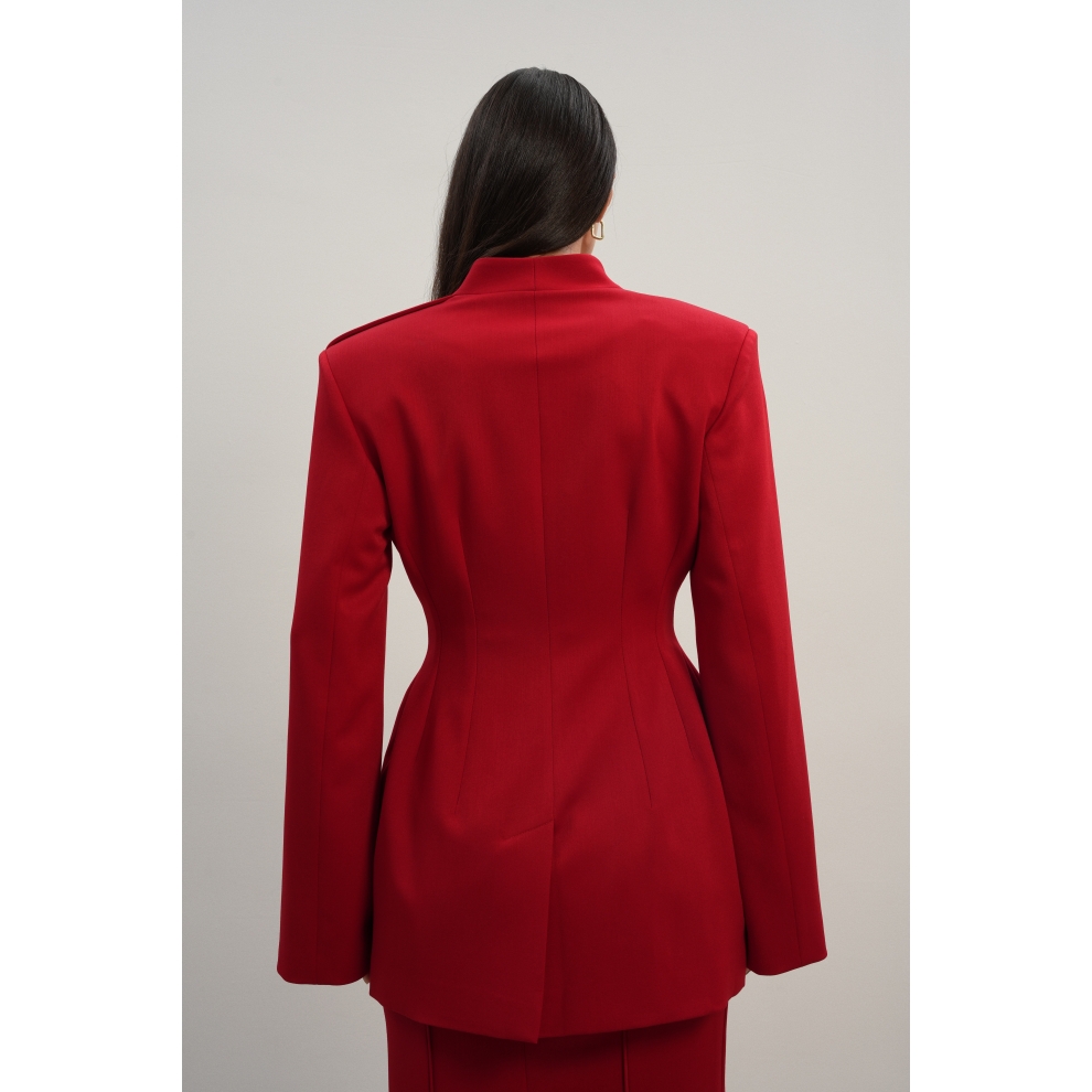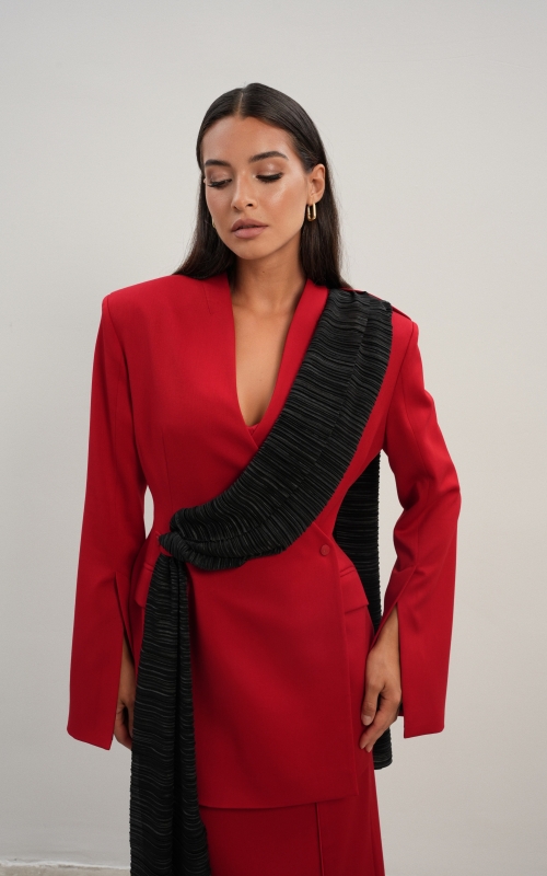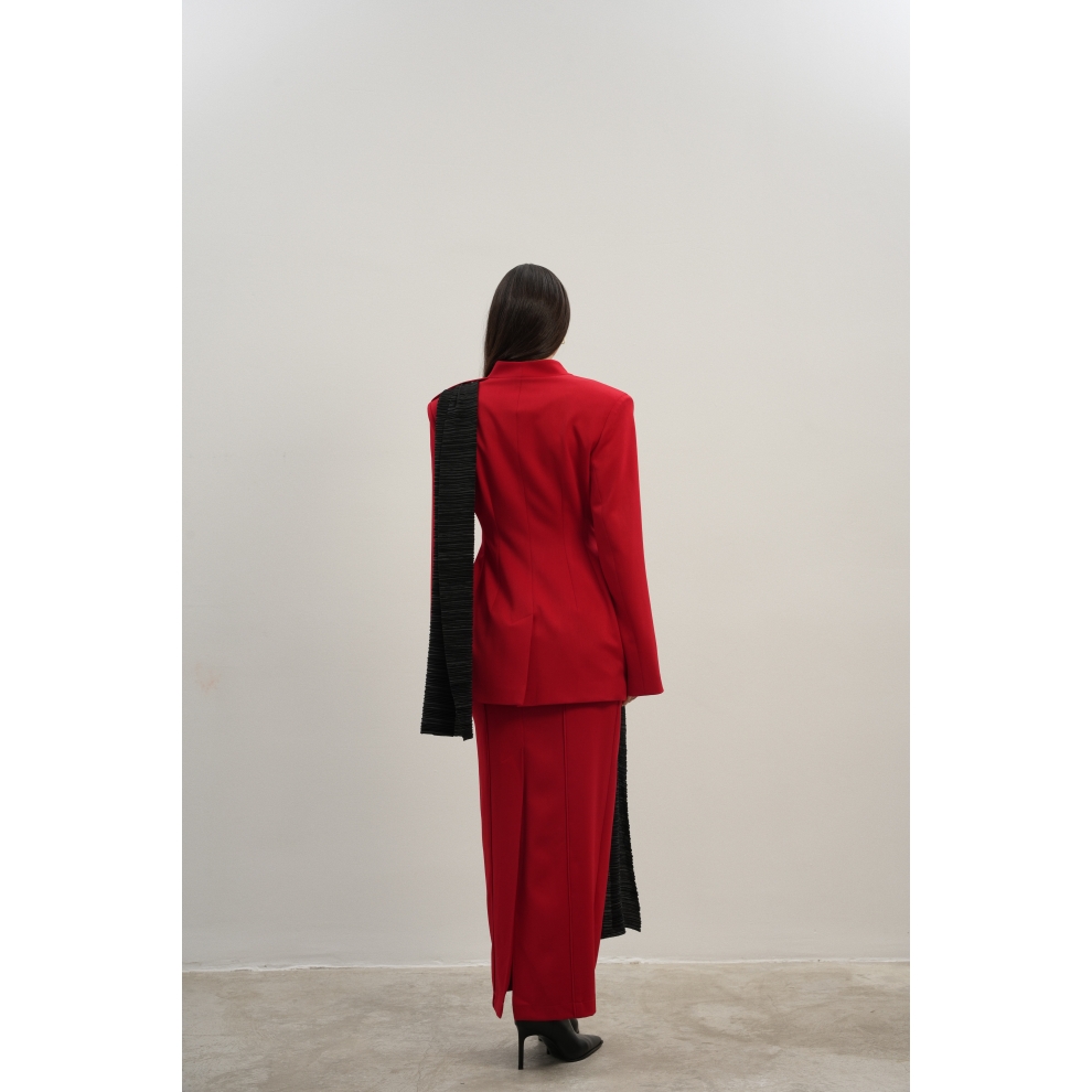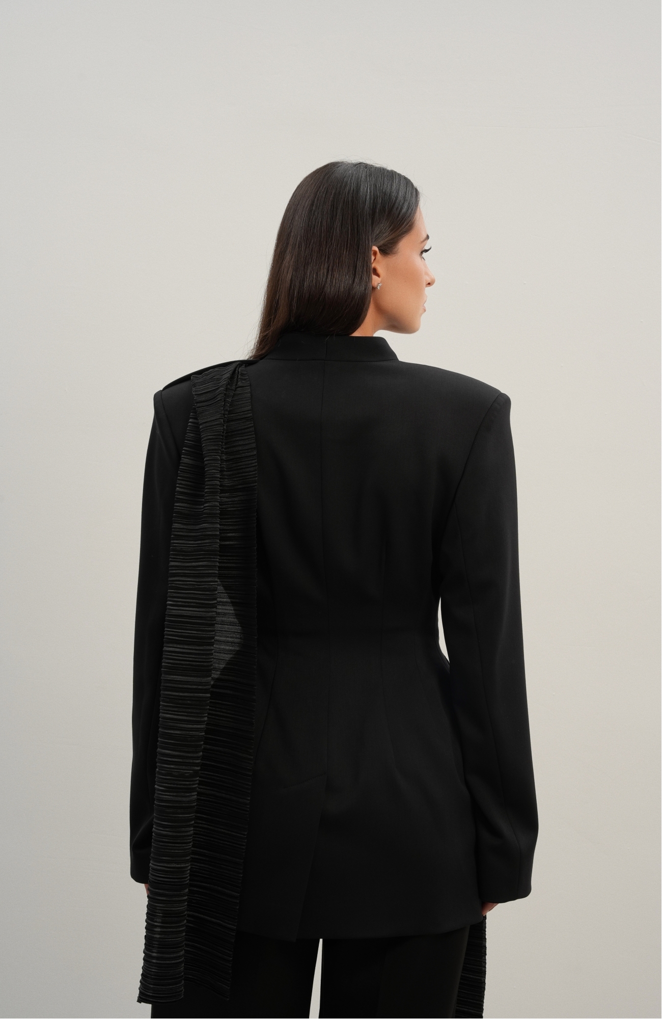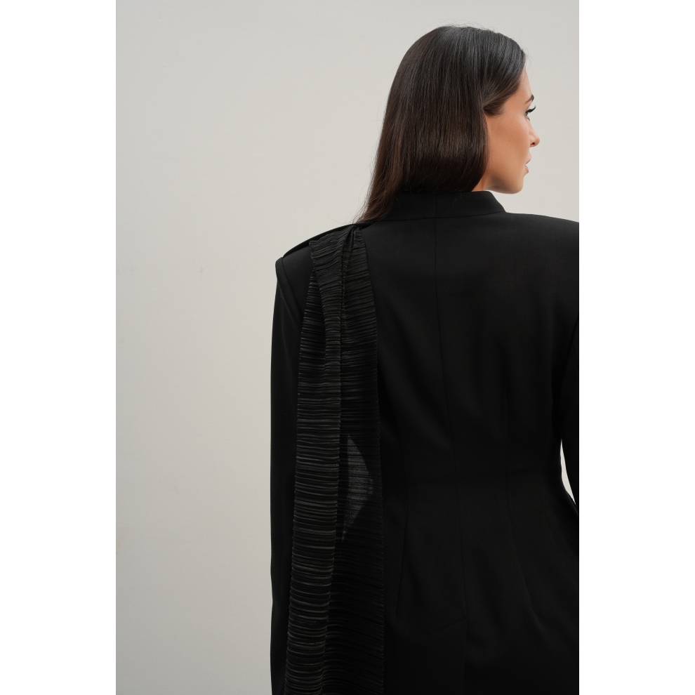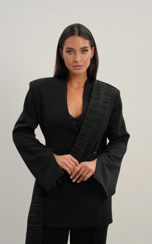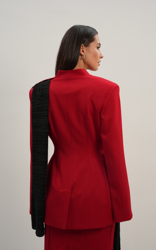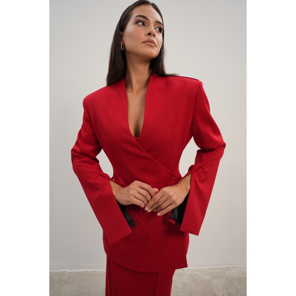| Жакет приталенного кроя выполнен из поливискозной ткани. Имеет акцентные плечи и выраженную талию, тем самым создает силуэт песочных часов. На жакете расположены кнопки, которыми можно регулировать объем талии. В комплекте идет съемная декоративная деталь в виде ткани гофре, которая крепится на хлястик в районе плечевого шва и талии. Дополните образ брюками палаццо |