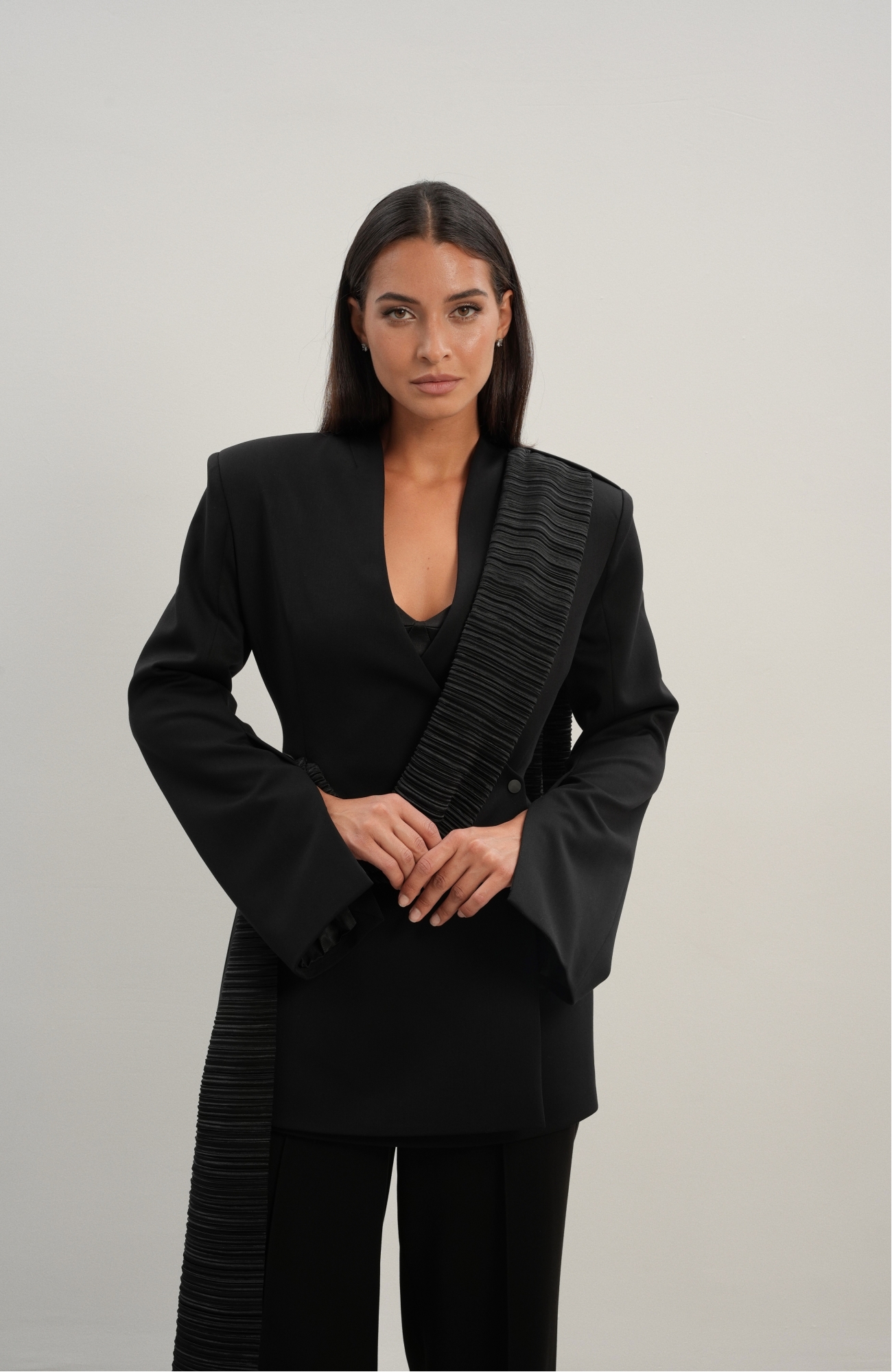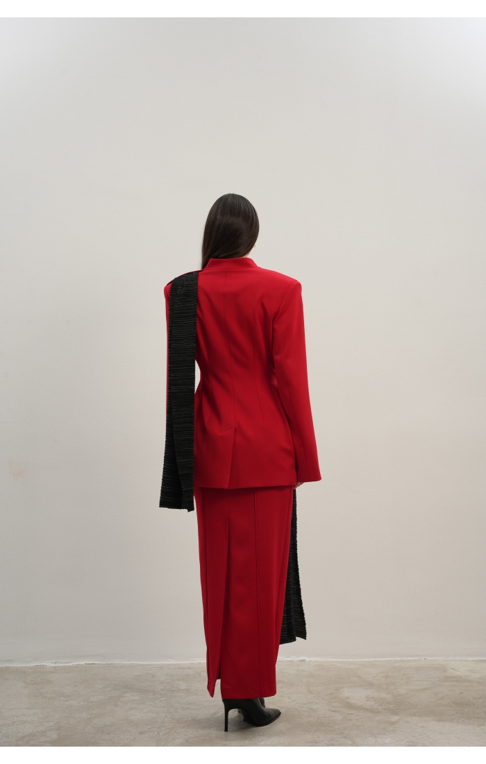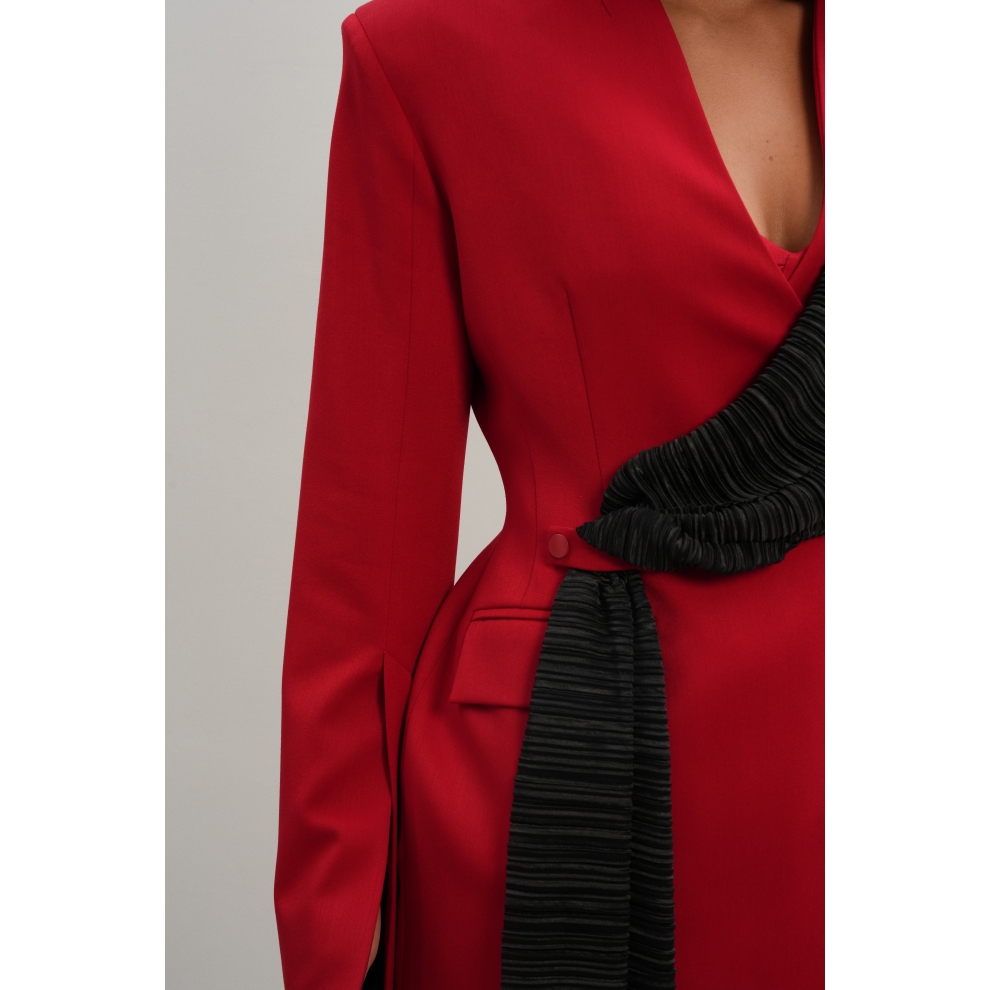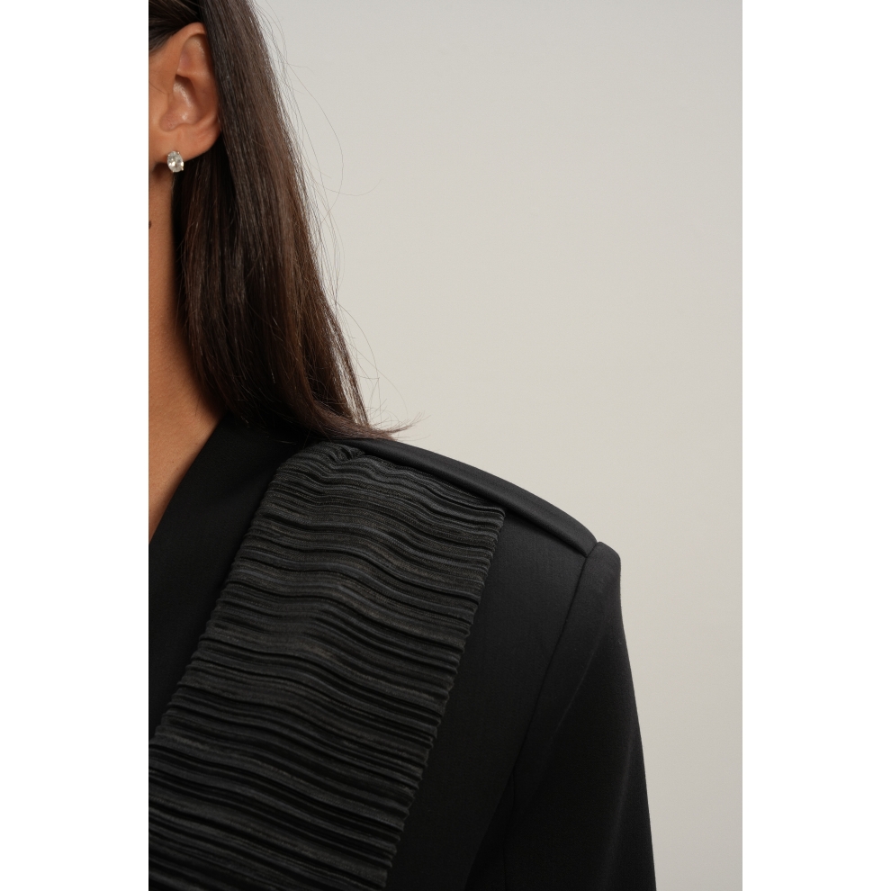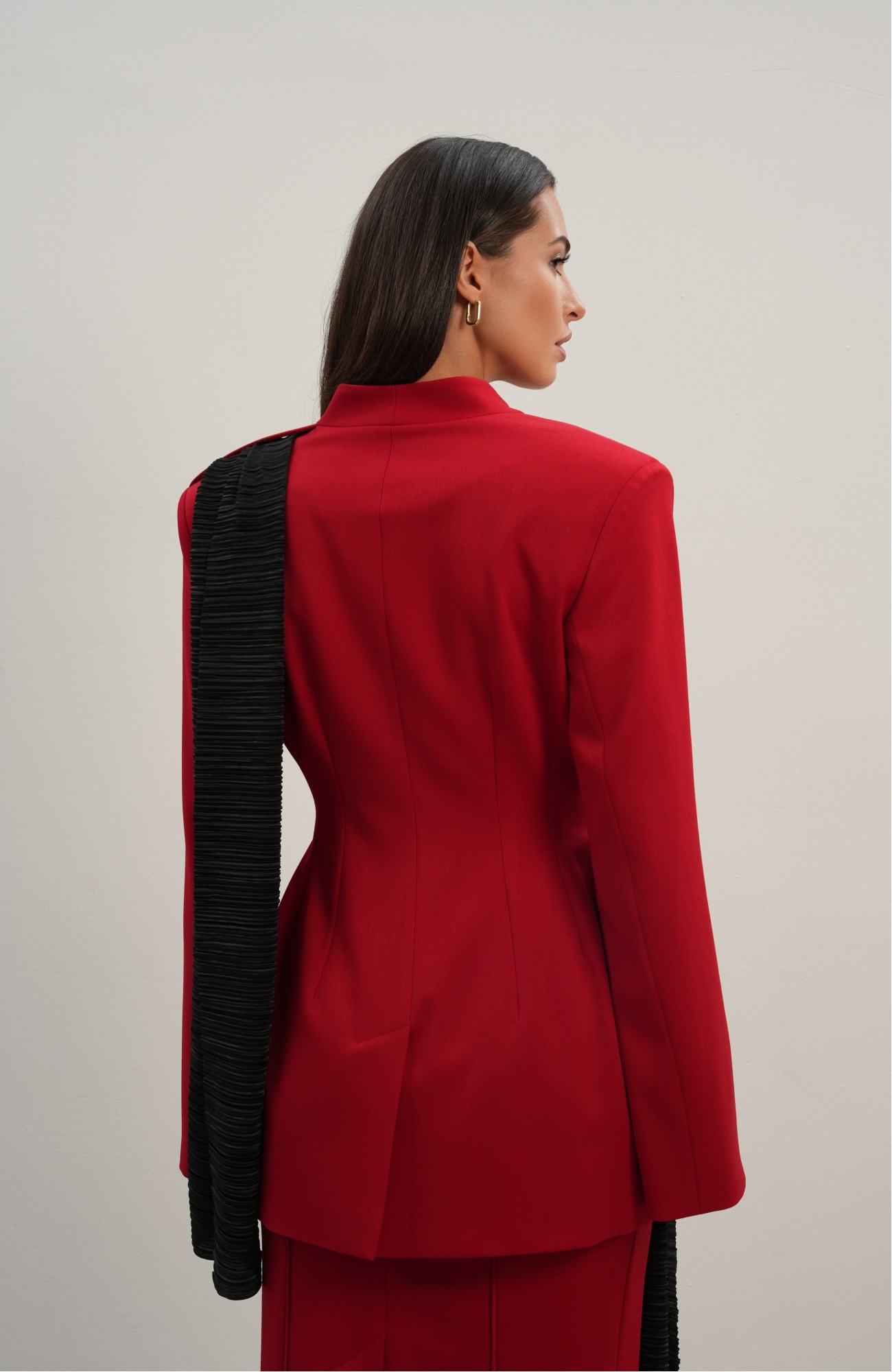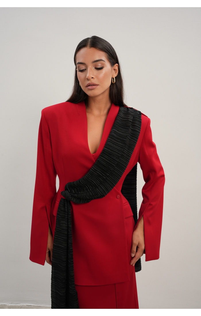 | Жакет приталенного кроя выполнен из поливискозной ткани. Имеет акцентные плечи и выраженную талию, тем самым создает силуэт песочных часов. На жакете расположены кнопки, которыми можно регулировать объем талии. В комплекте идет съемная декоративная деталь в виде ткани гофре, которая крепится на хлястик в районе плечевого шва и талии. Дополните образ брюками палаццо |