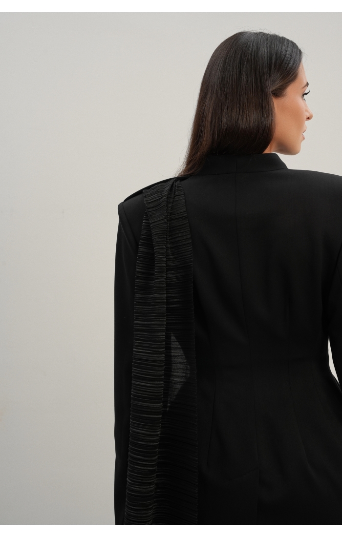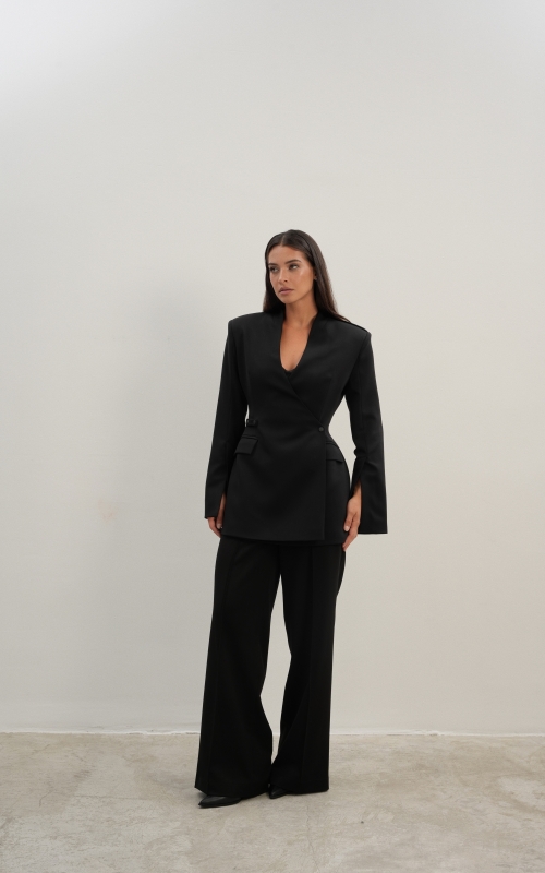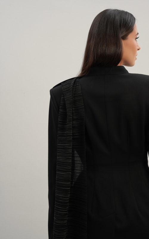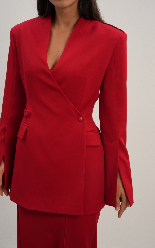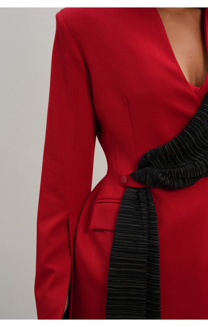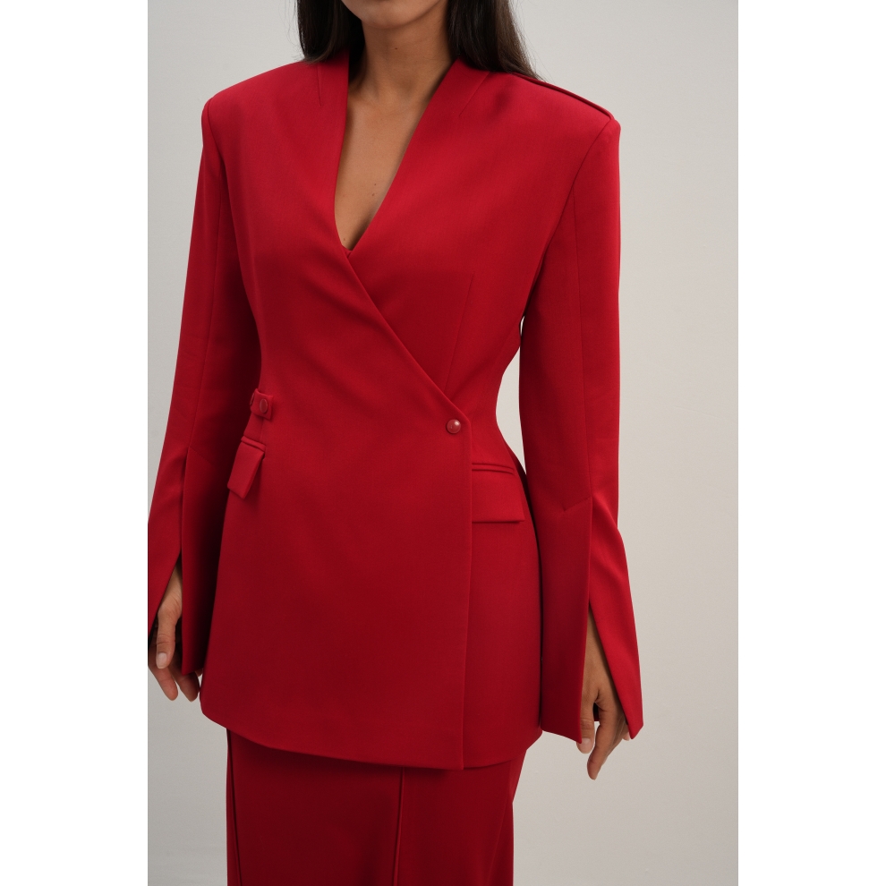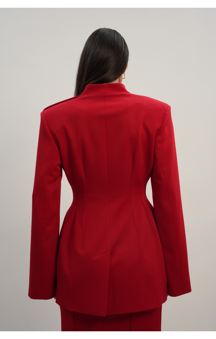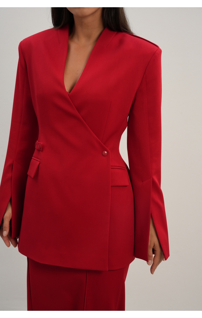| Жакет приталенного кроя выполнен из поливискозной ткани. Имеет акцентные плечи и выраженную талию, тем самым создает силуэт песочных часов. На жакете расположены кнопки, которыми можно регулировать объем талии. В комплекте идет съемная декоративная деталь в виде ткани гофре, которая крепится на хлястик в районе плечевого шва и талии. Дополните образ брюками палаццо |