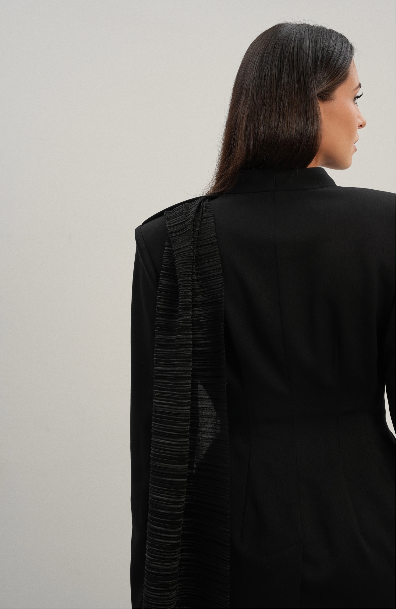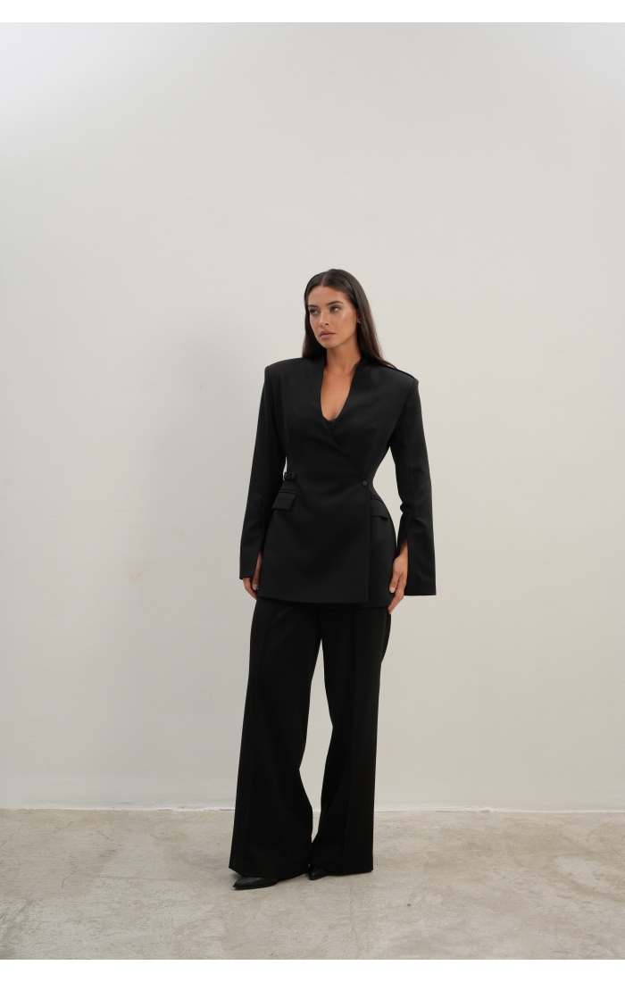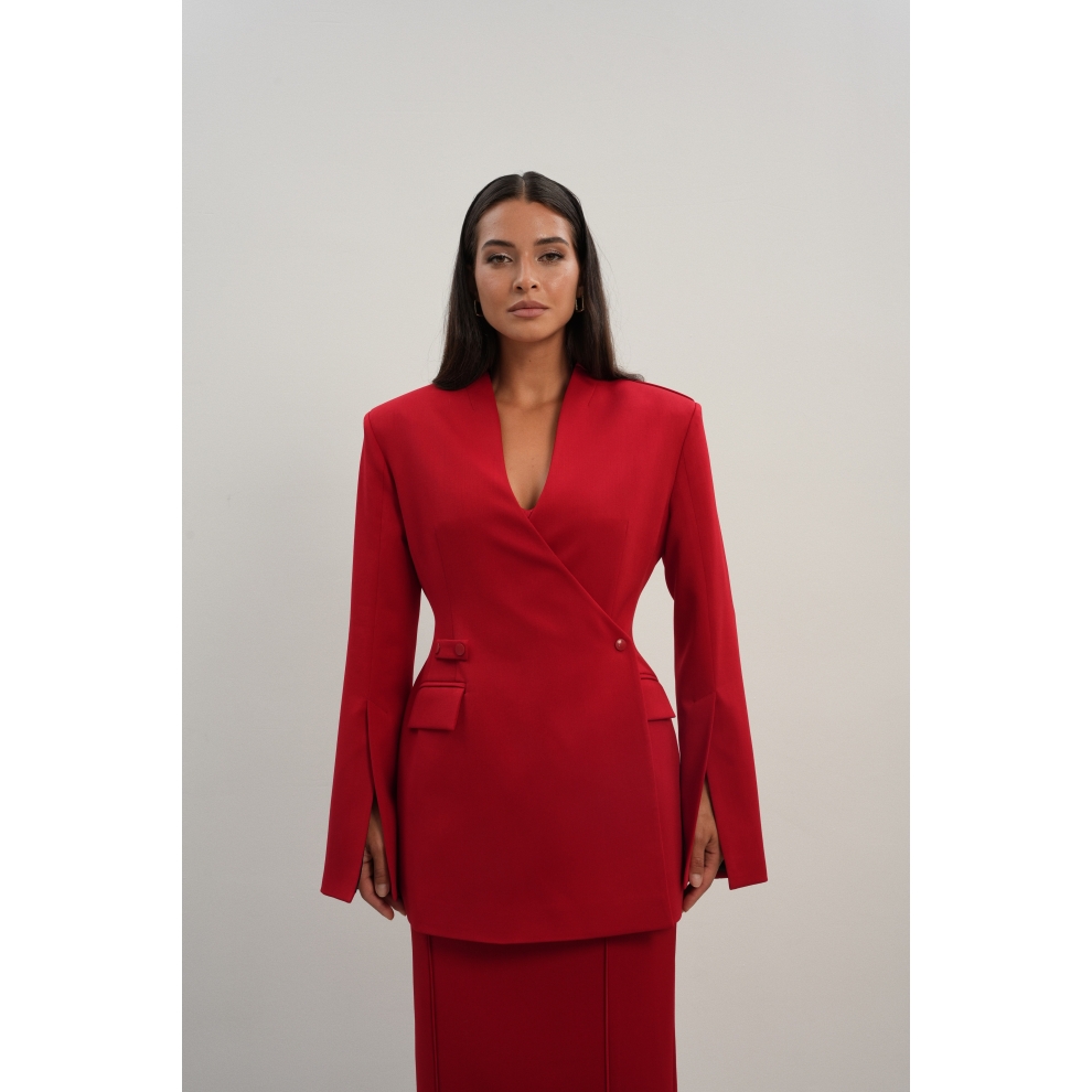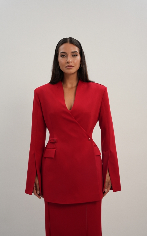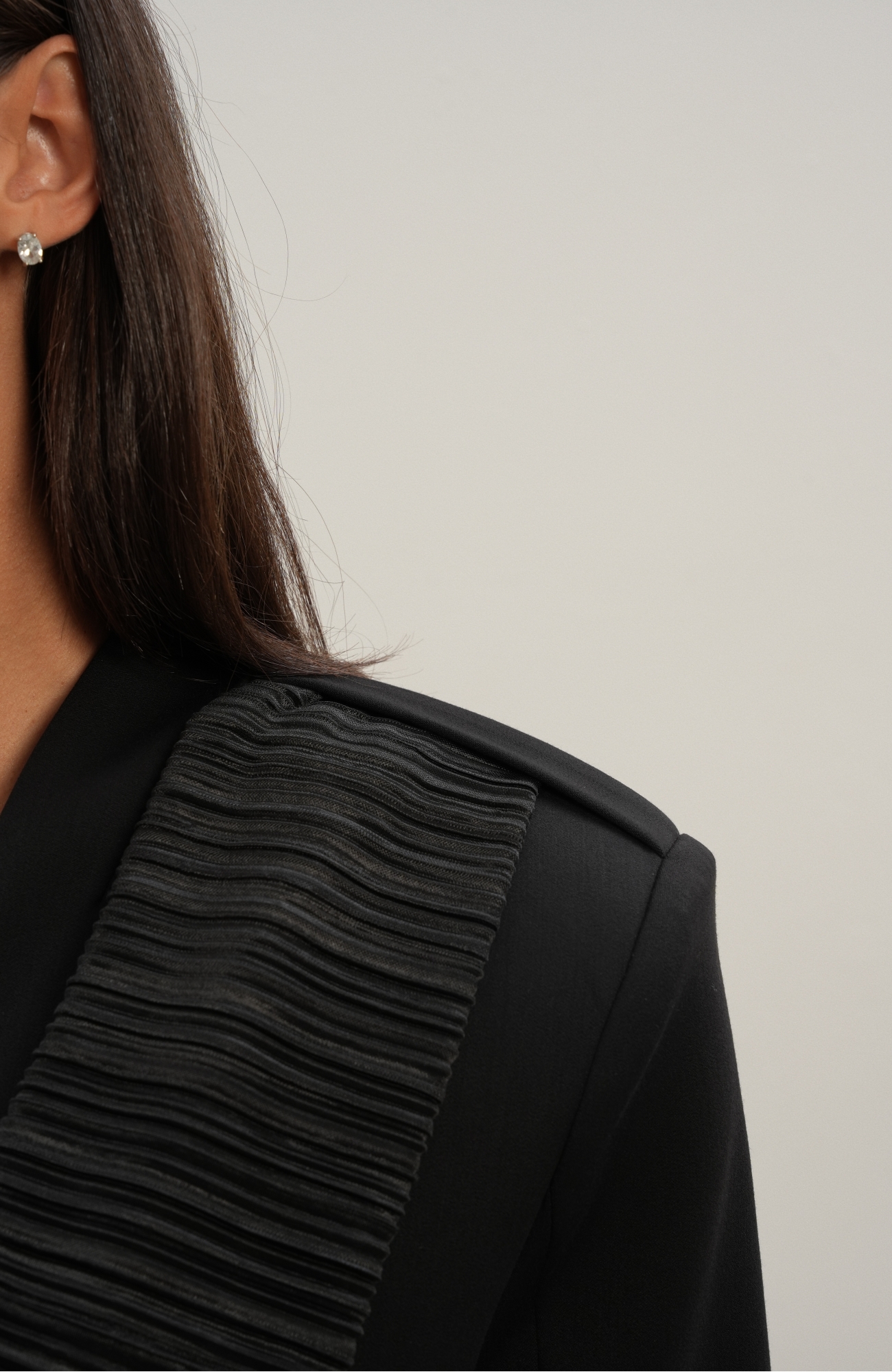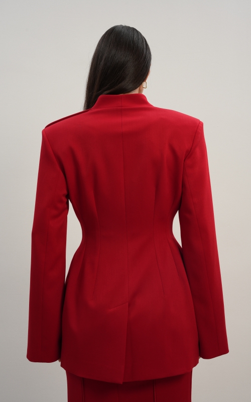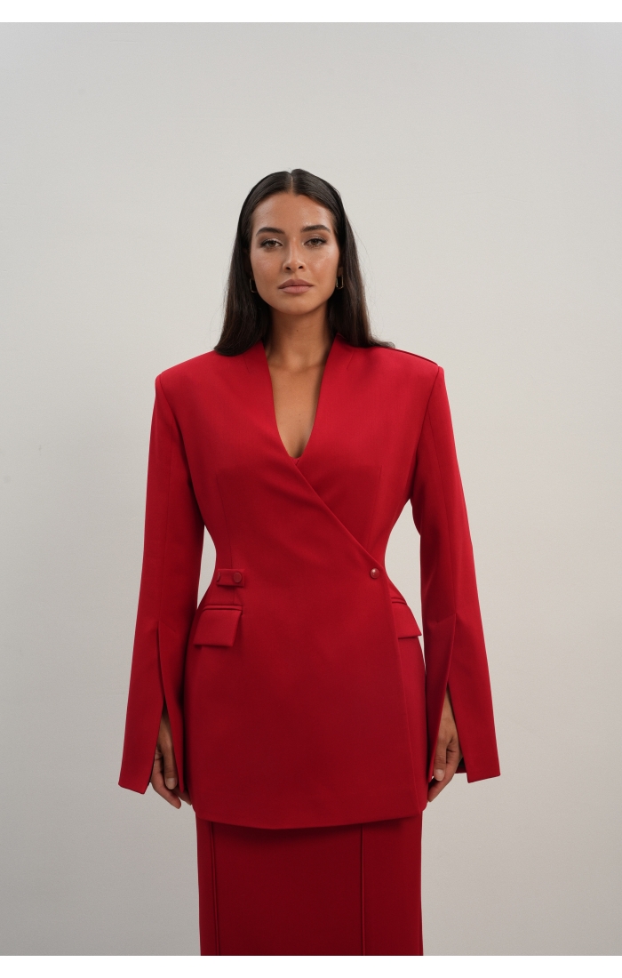 | Жакет приталенного кроя выполнен из поливискозной ткани. Имеет акцентные плечи и выраженную талию, тем самым создает силуэт песочных часов. На жакете расположены кнопки, которыми можно регулировать объем талии. В комплекте идет съемная декоративная деталь в виде ткани гофре, которая крепится на хлястик в районе плечевого шва и талии. Дополните образ брюками палаццо |