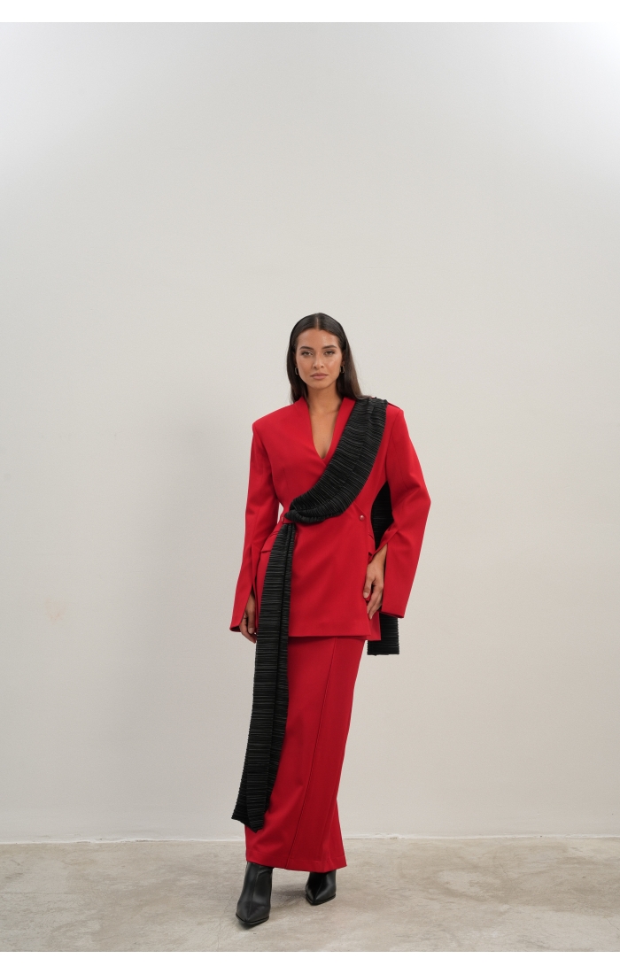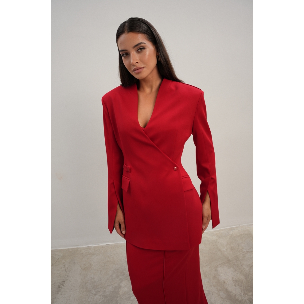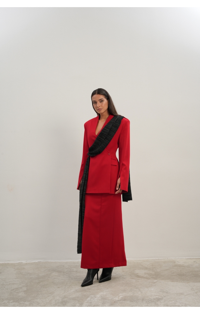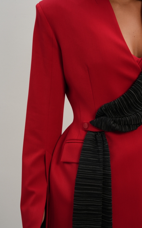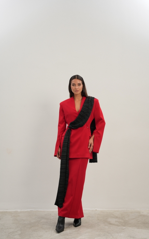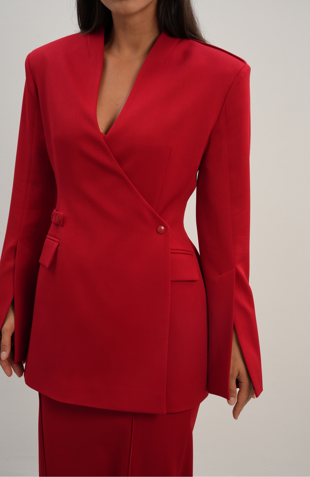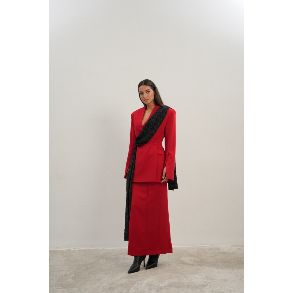 | Жакет приталенного кроя выполнен из поливискозной ткани. Имеет акцентные плечи и выраженную талию, тем самым создает силуэт песочных часов. На жакете расположены кнопки, которыми можно регулировать объем талии. В комплекте идет съемная декоративная деталь в виде ткани гофре, которая крепится на хлястик в районе плечевого шва и талии. Дополните образ брюками палаццо |