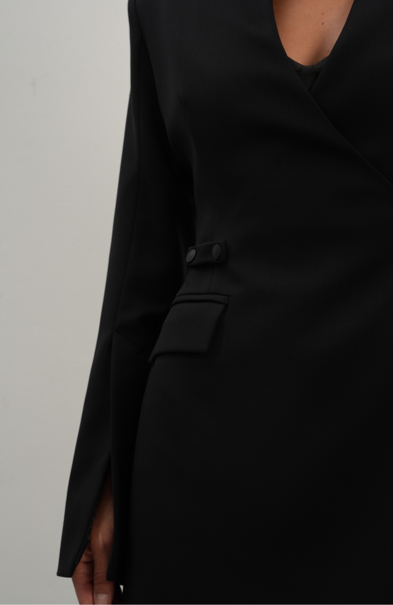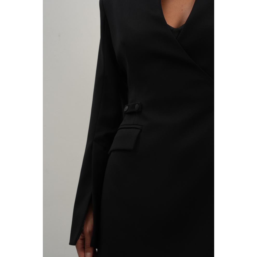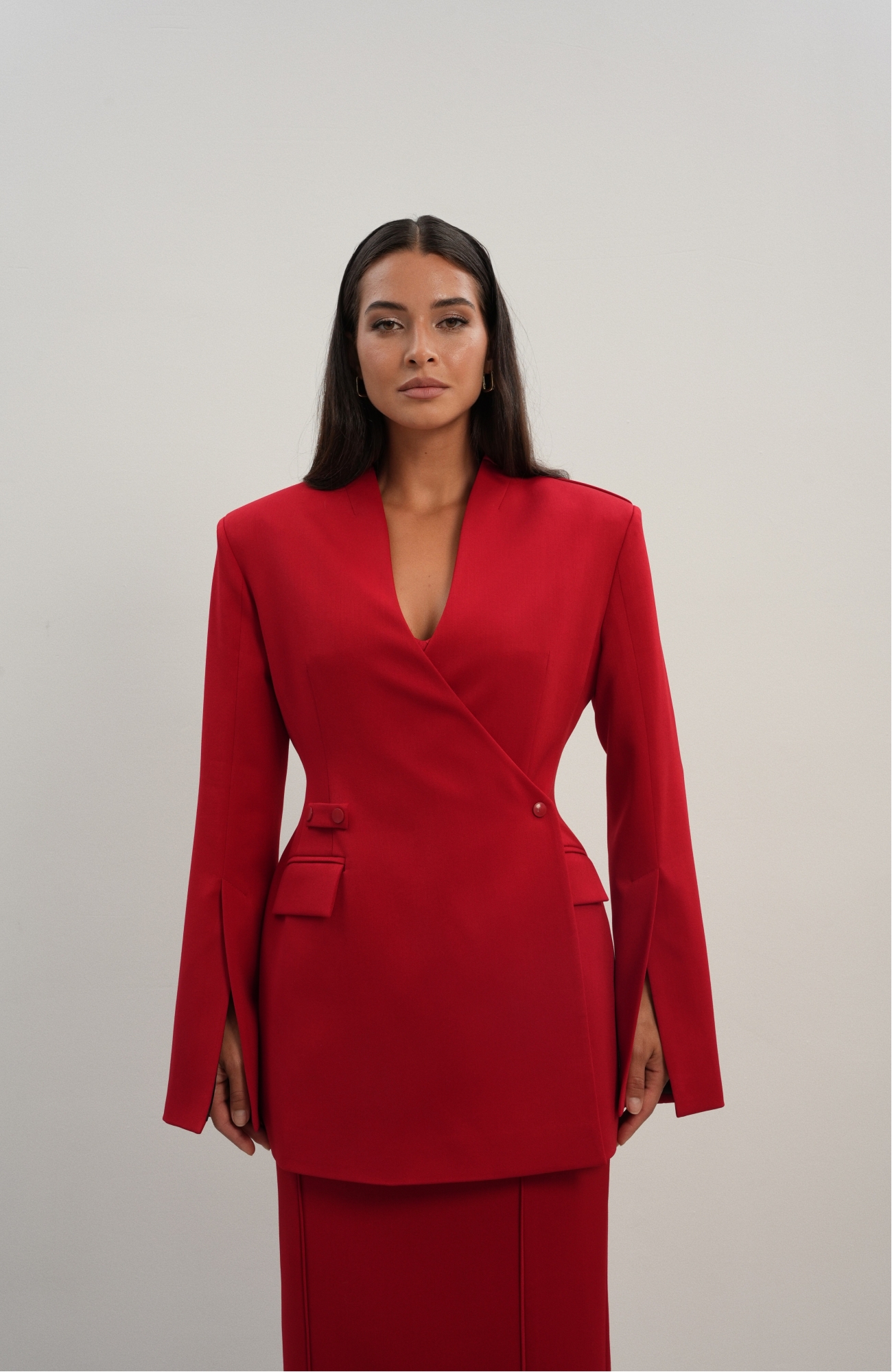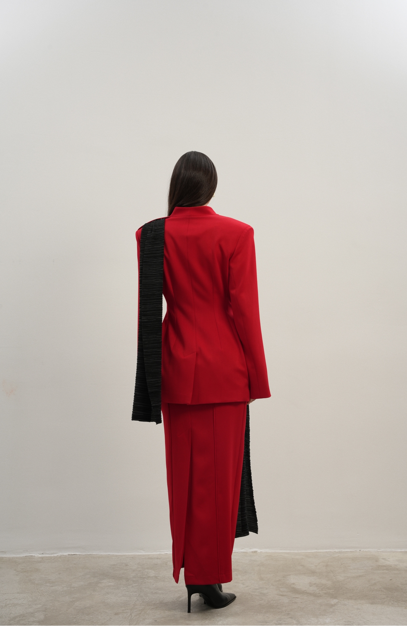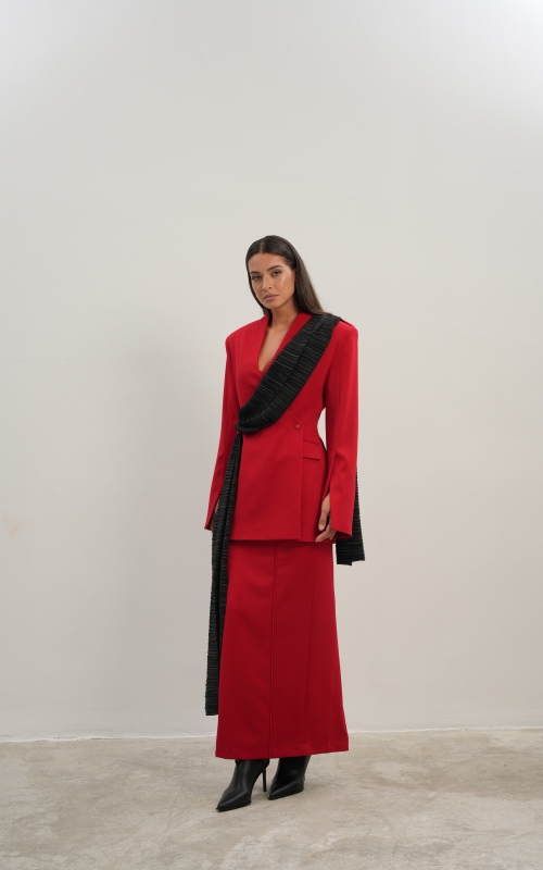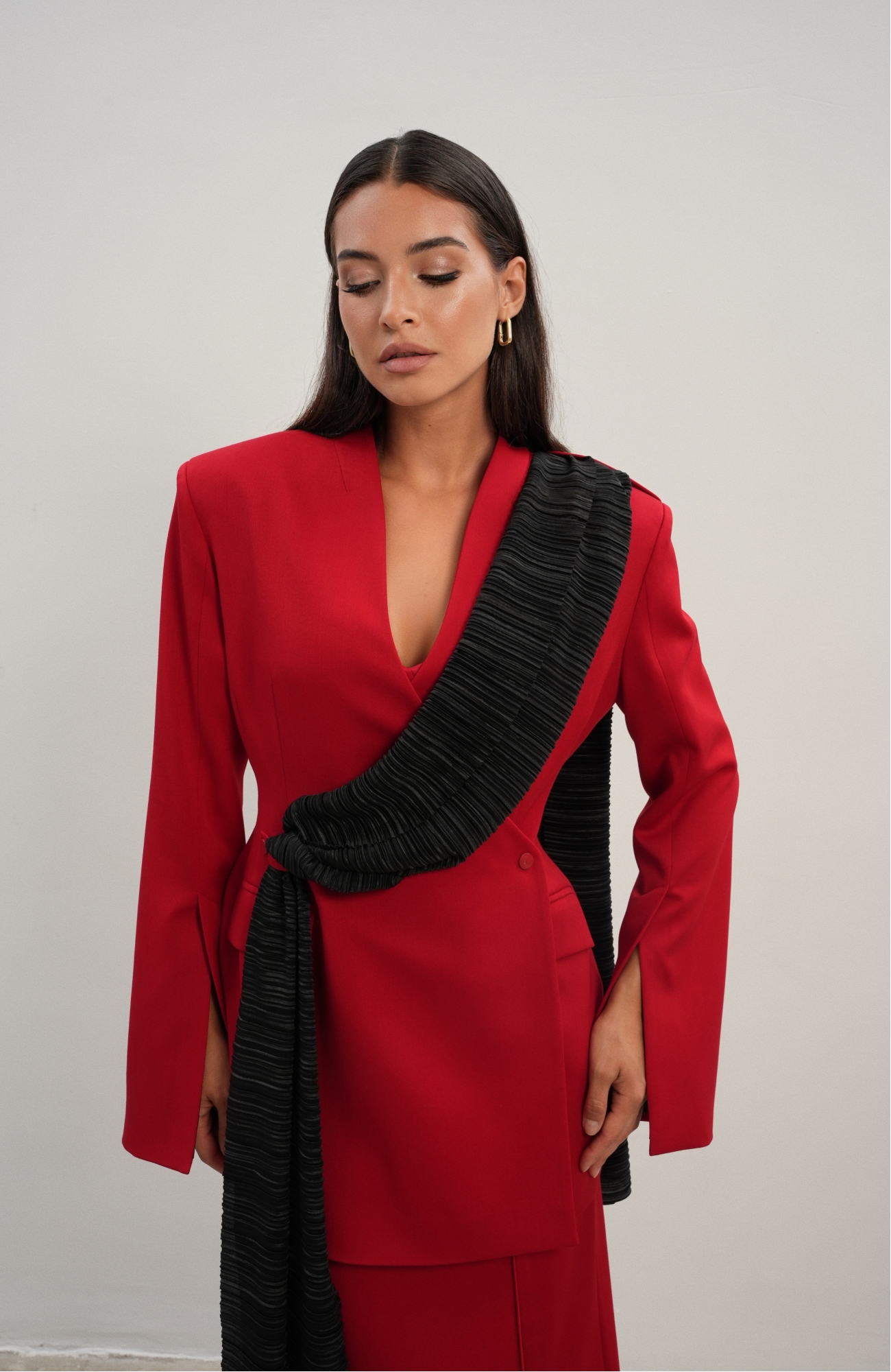 | Жакет приталенного кроя выполнен из поливискозной ткани. Имеет акцентные плечи и выраженную талию, тем самым создает силуэт песочных часов. На жакете расположены кнопки, которыми можно регулировать объем талии. В комплекте идет съемная декоративная деталь в виде ткани гофре, которая крепится на хлястик в районе плечевого шва и талии. Дополните образ брюками палаццо |