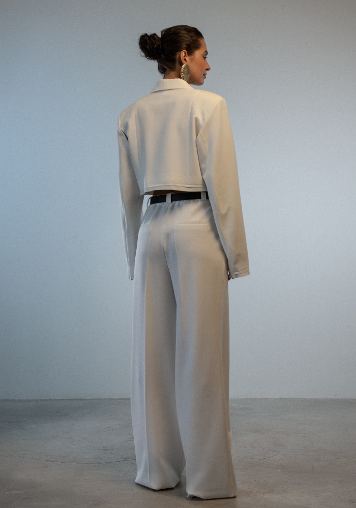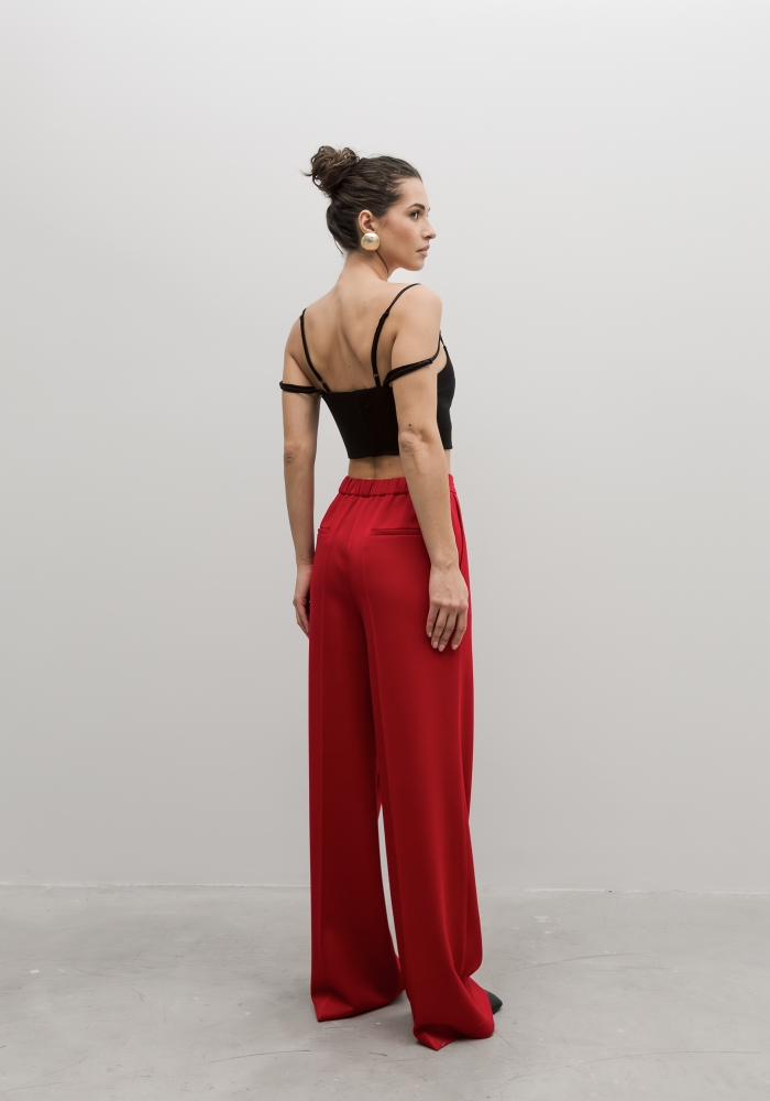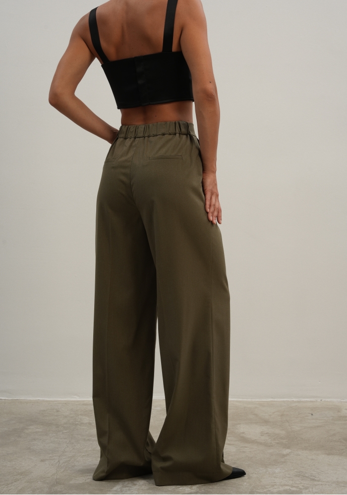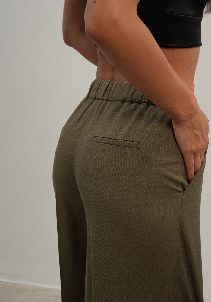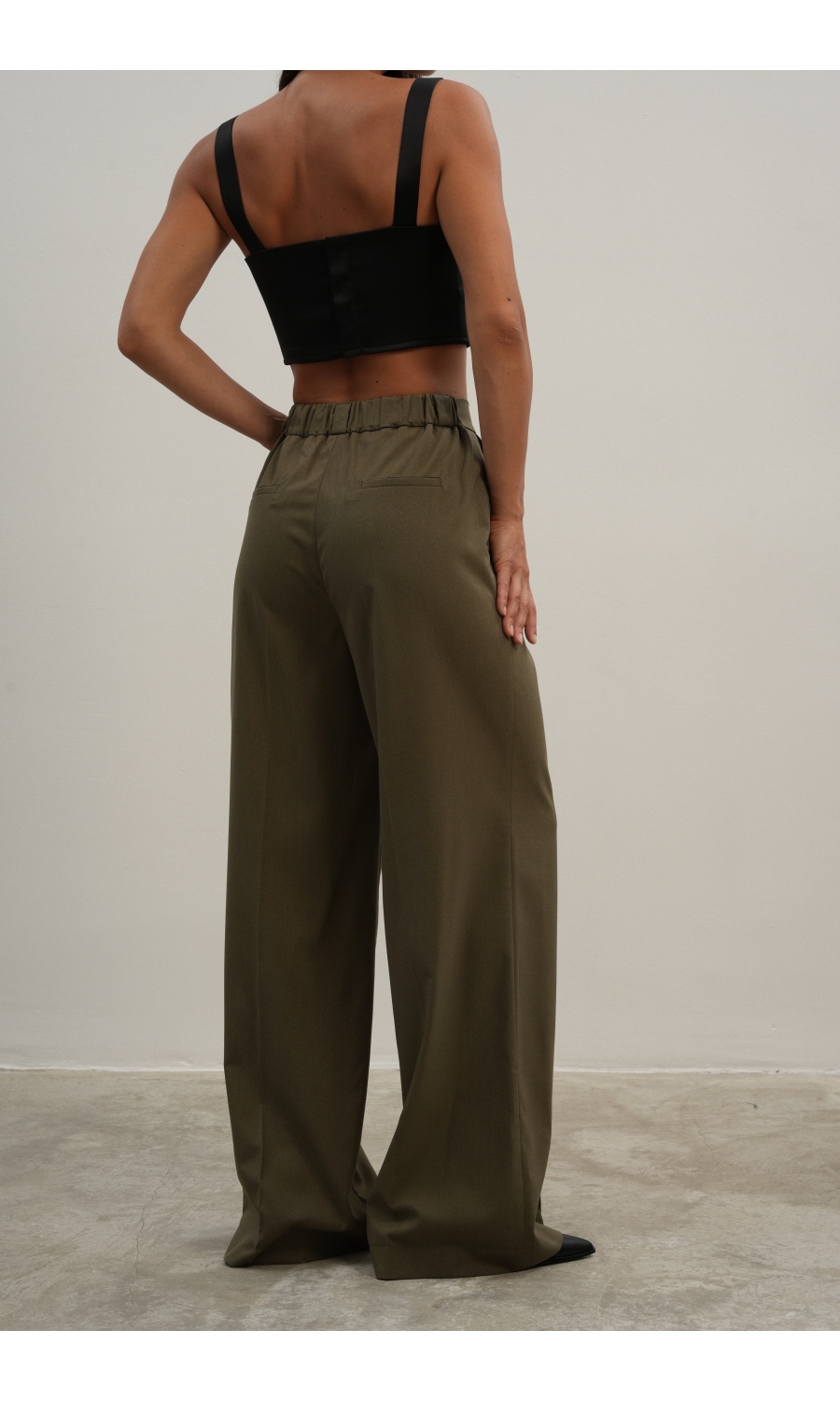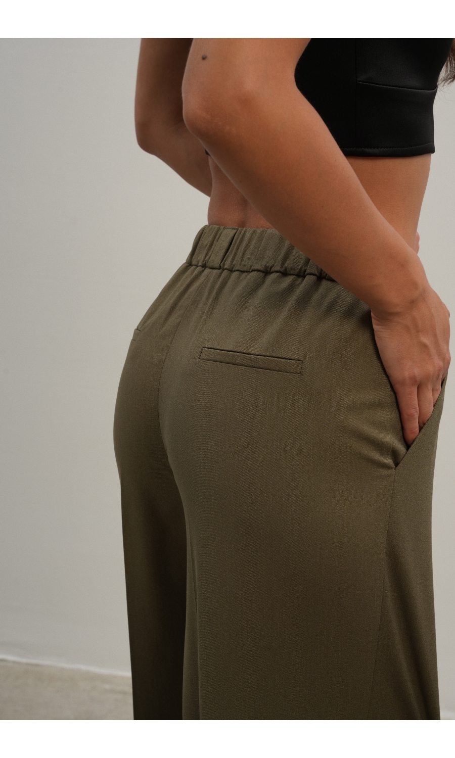 Брюки палаццо выполнены из поливискозной мягкой костюмной ткани. Модель имеет застроченную стрелку. Застегиваются на молнию и пуговицу. Сзади на линии талии расположена резинка для комфортной посадки. В боковых швах имеют два глубоких боковых кармана и два декоративных кармана-обманки на спинке изделия.
