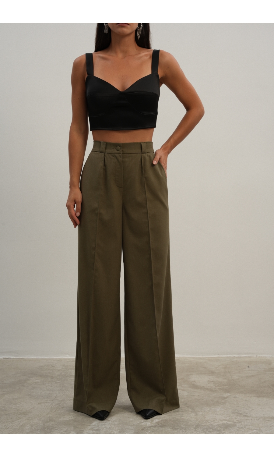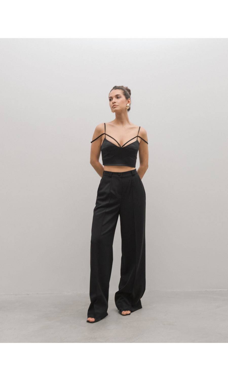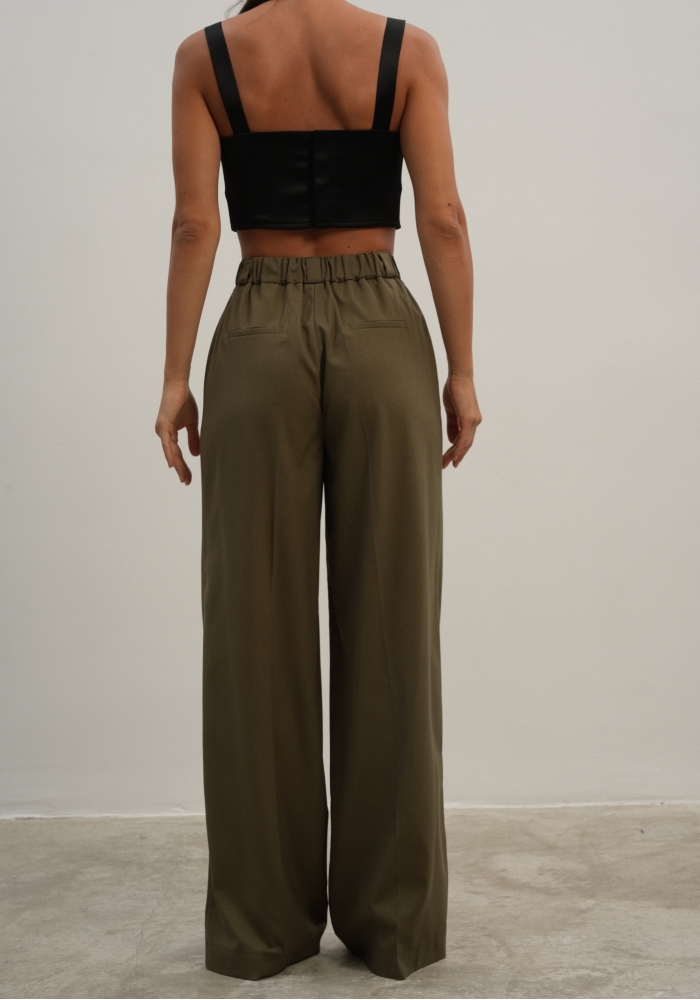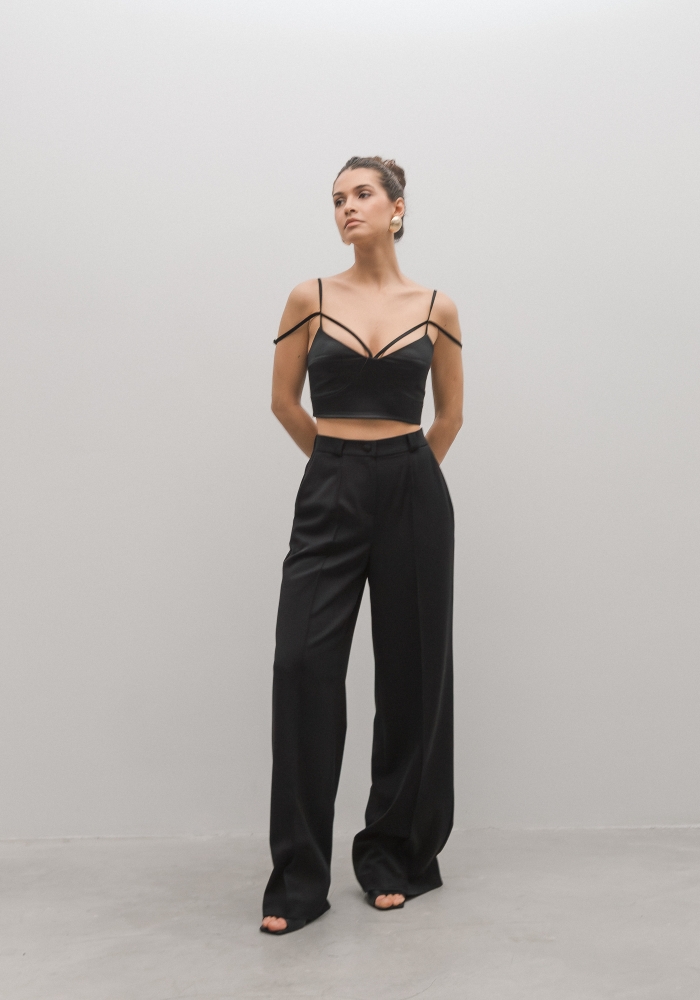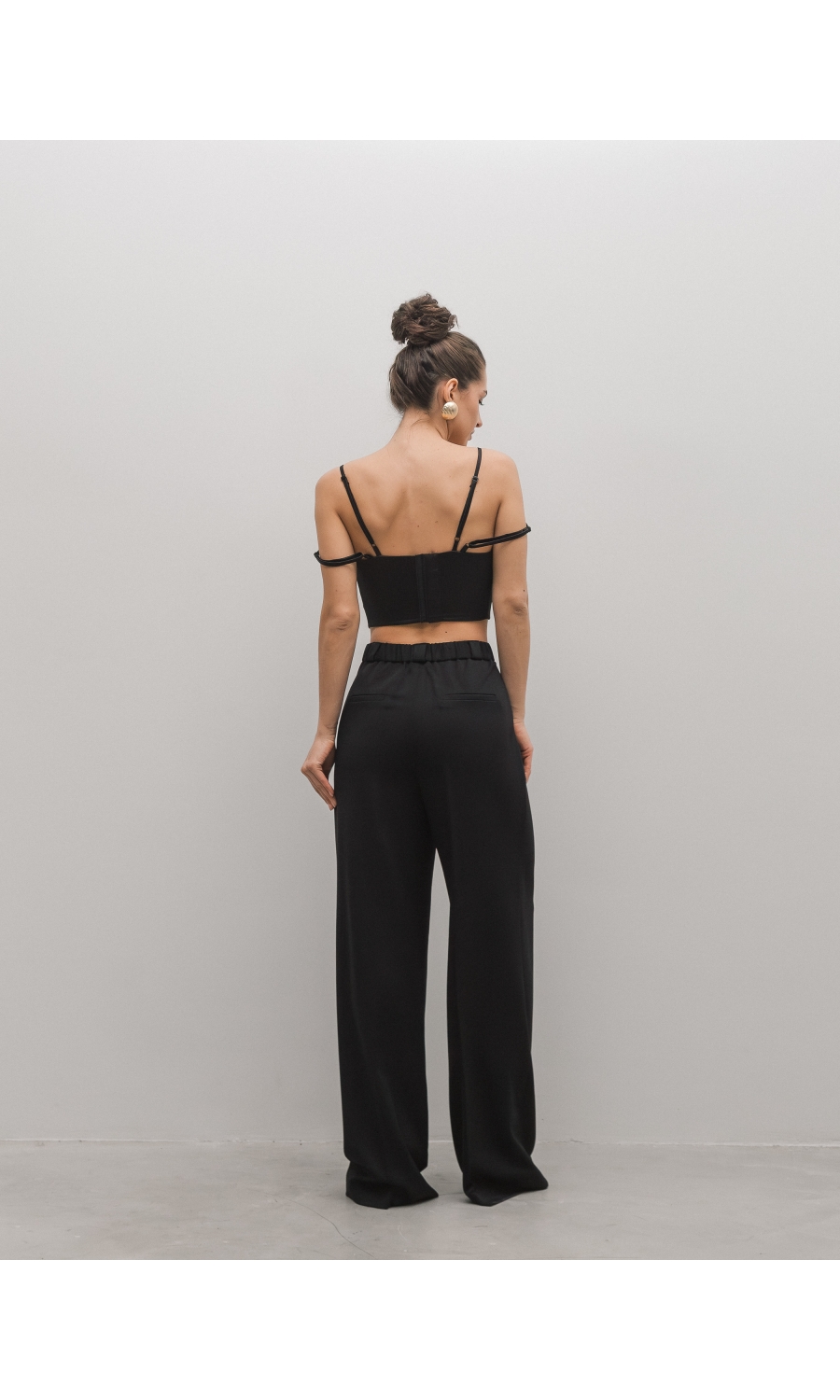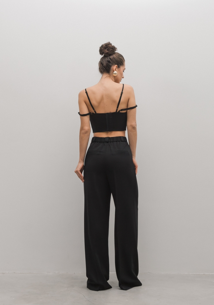 Брюки палаццо выполнены из поливискозной мягкой костюмной ткани. Модель имеет застроченную стрелку. Застегиваются на молнию и пуговицу. Сзади на линии талии расположена резинка для комфортной посадки. В боковых швах имеют два глубоких боковых кармана и два декоративных кармана-обманки на спинке изделия.