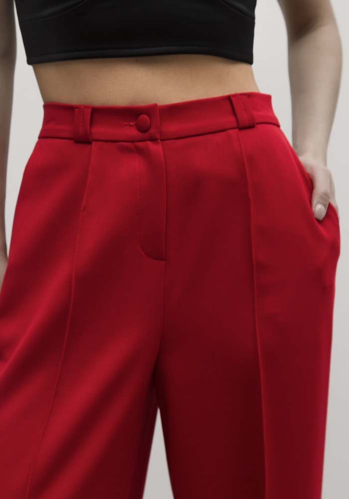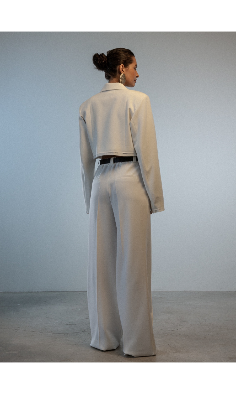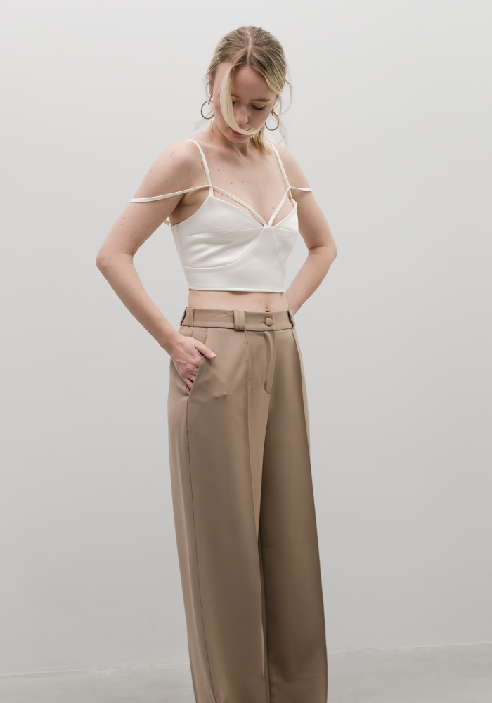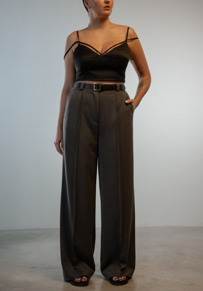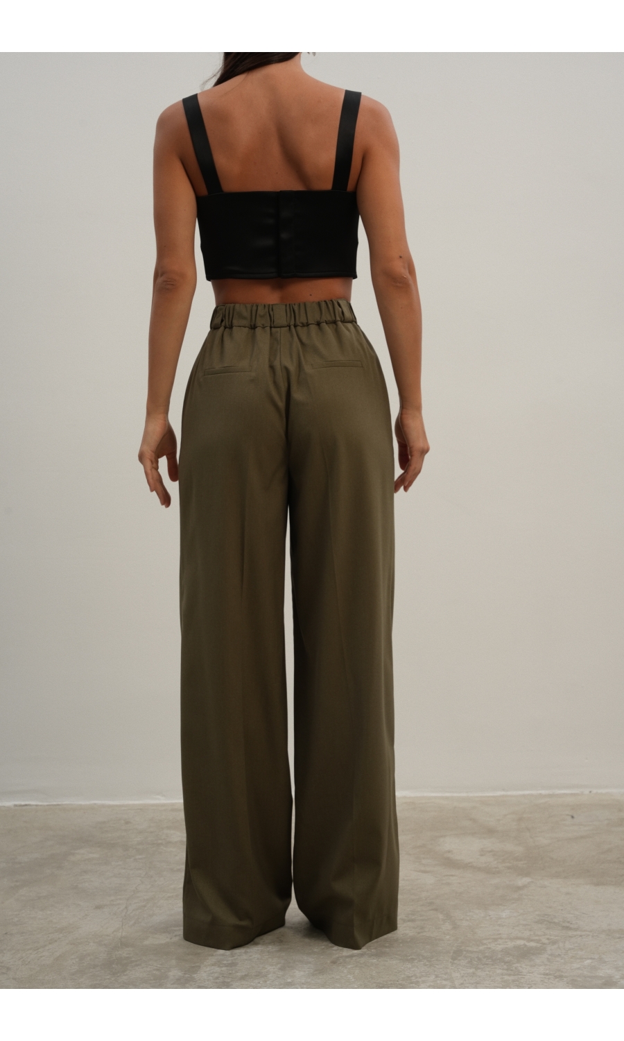 Брюки палаццо выполнены из поливискозной мягкой костюмной ткани. Модель имеет застроченную стрелку. Застегиваются на молнию и пуговицу. Сзади на линии талии расположена резинка для комфортной посадки. В боковых швах имеют два глубоких боковых кармана и два декоративных кармана-обманки на спинке изделия.
