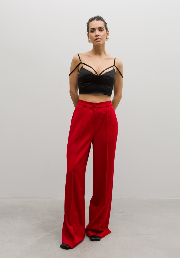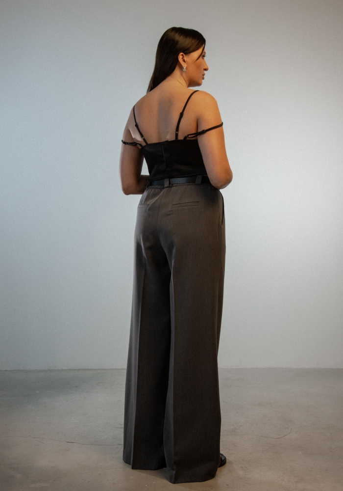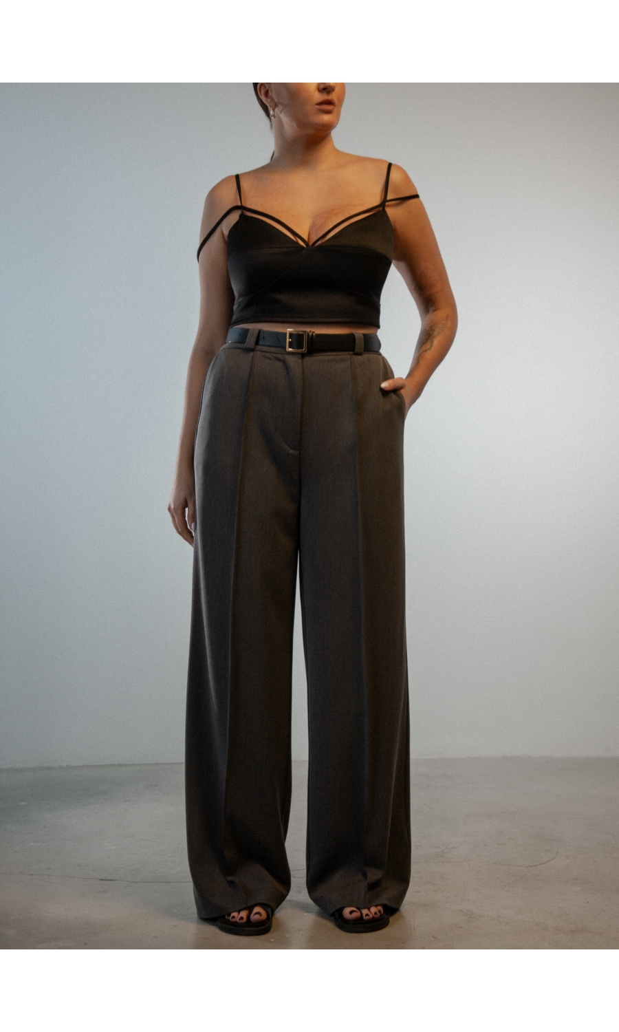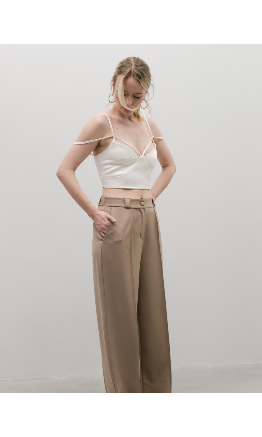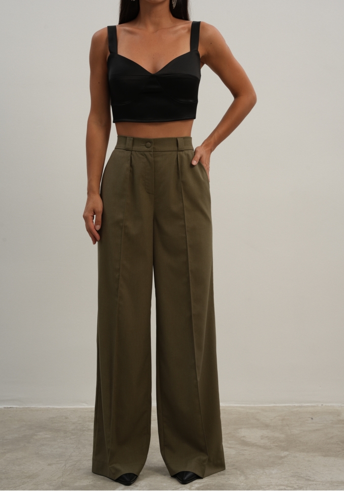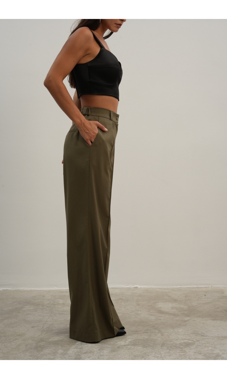 Брюки палаццо выполнены из поливискозной мягкой костюмной ткани. Модель имеет застроченную стрелку. Застегиваются на молнию и пуговицу. Сзади на линии талии расположена резинка для комфортной посадки. В боковых швах имеют два глубоких боковых кармана и два декоративных кармана-обманки на спинке изделия.