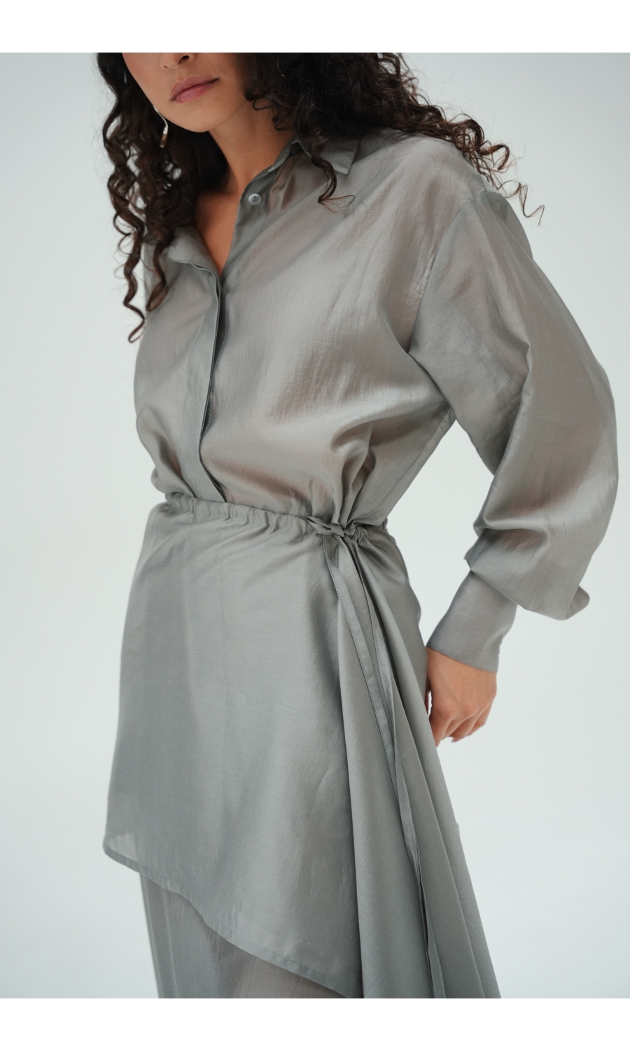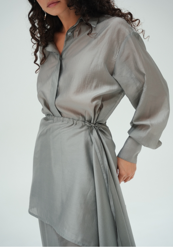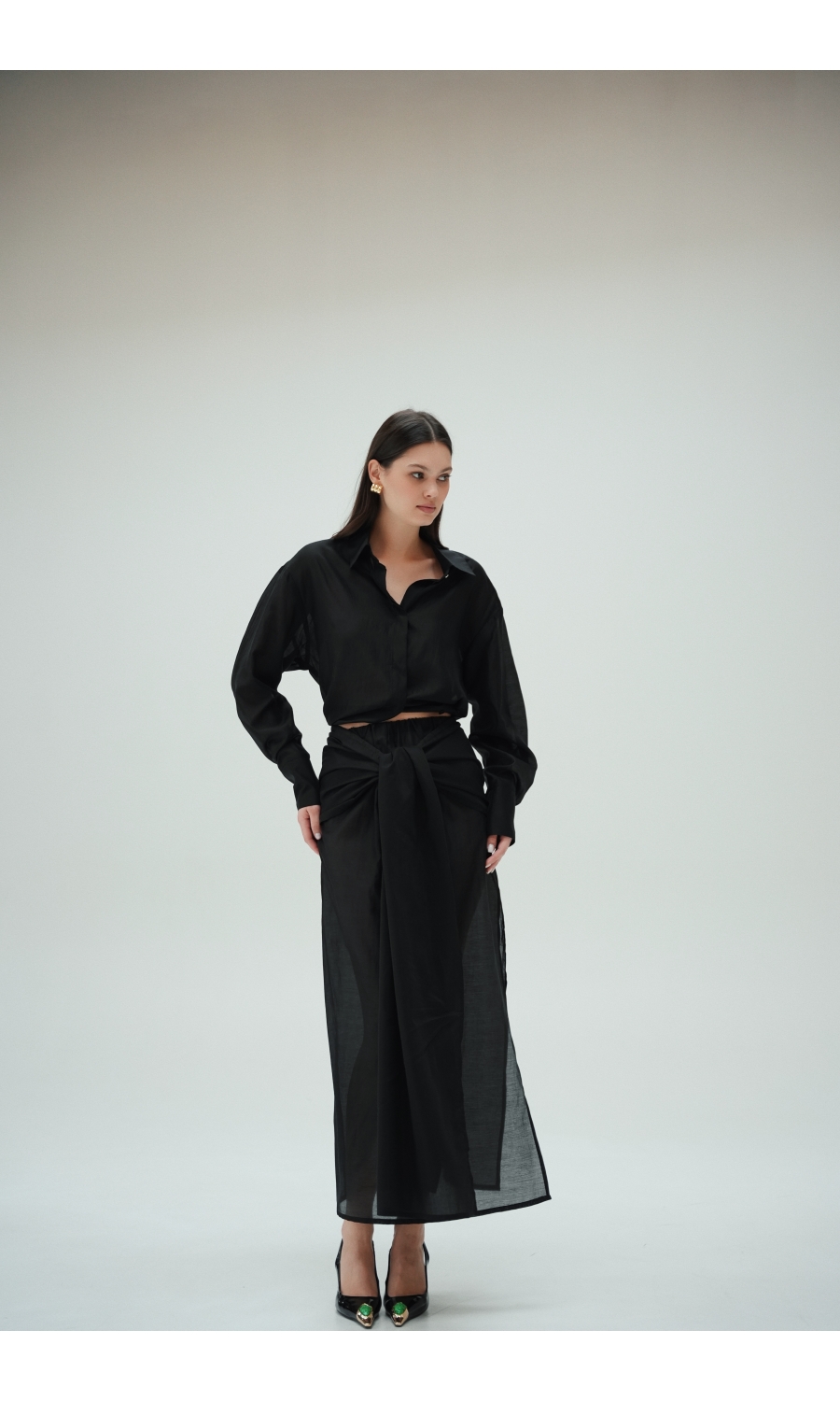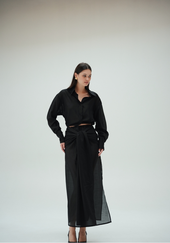 Юбка прямого кроя на резинке. Сверху надевается баска с длинными хвостами, которые добавляют женственности. Юбка-баска на кулиске, её можно завязывать на саму кулиску, оставляя спущенными хвосты, либо завязывать сами хвосты. Также баску можно трансформировать и использовать как топ. Баску легко интегрировать в разные образы, надевая поверх брюк, джинс, платьев и тд.