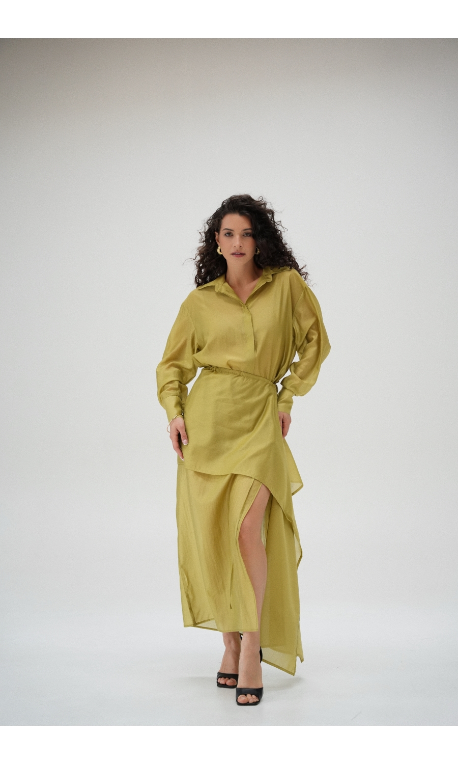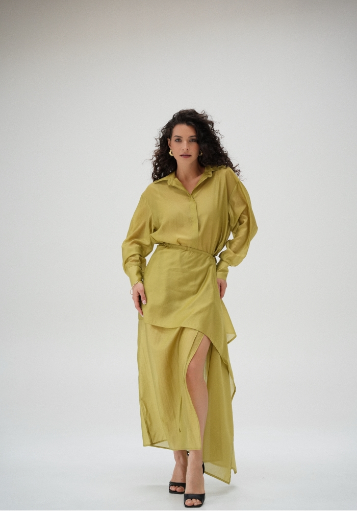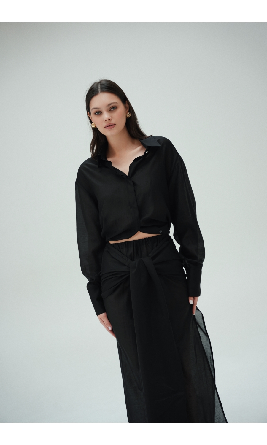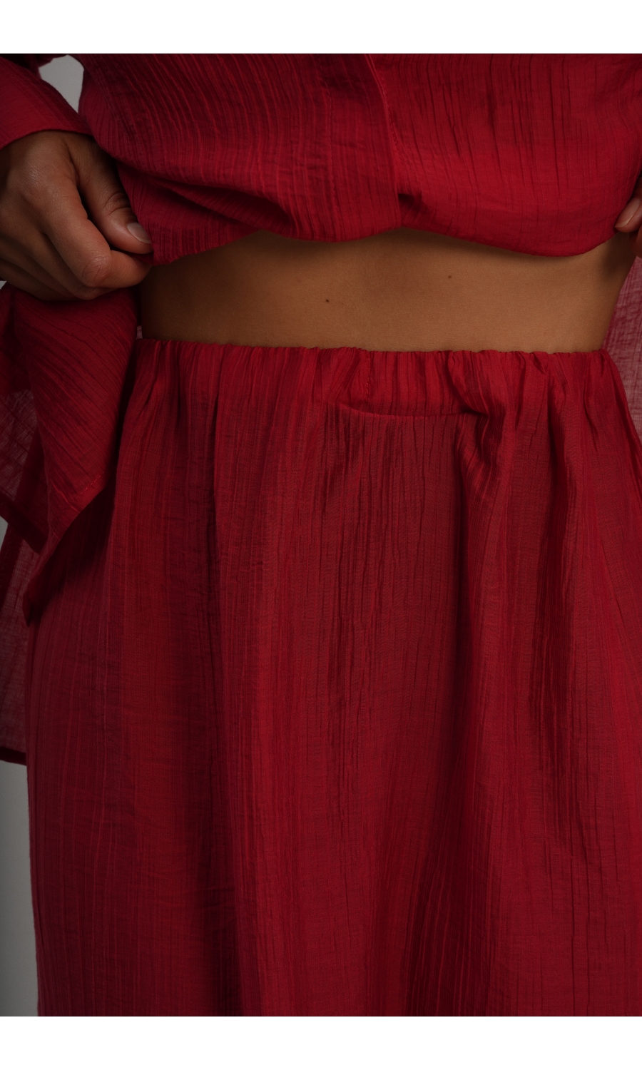 Юбка прямого кроя на резинке. Сверху надевается баска с длинными хвостами, которые добавляют женственности. Юбка-баска на кулиске, её можно завязывать на саму кулиску, оставляя спущенными хвосты, либо завязывать сами хвосты. Также баску можно трансформировать и использовать как топ. Баску легко интегрировать в разные образы, надевая поверх брюк, джинс, платьев и тд.