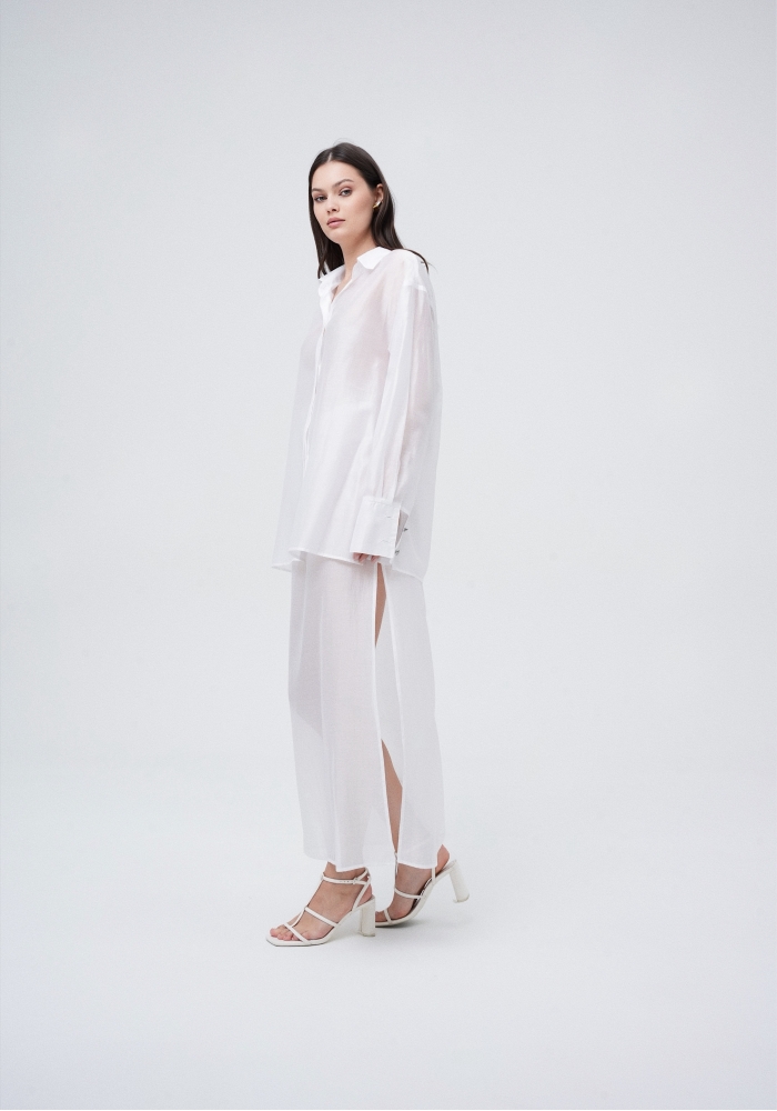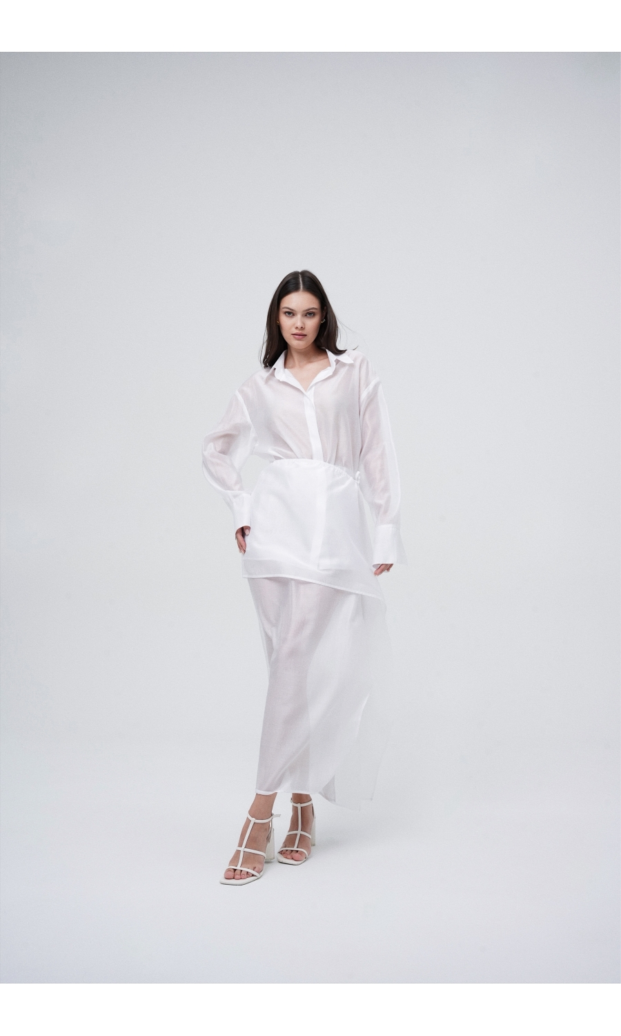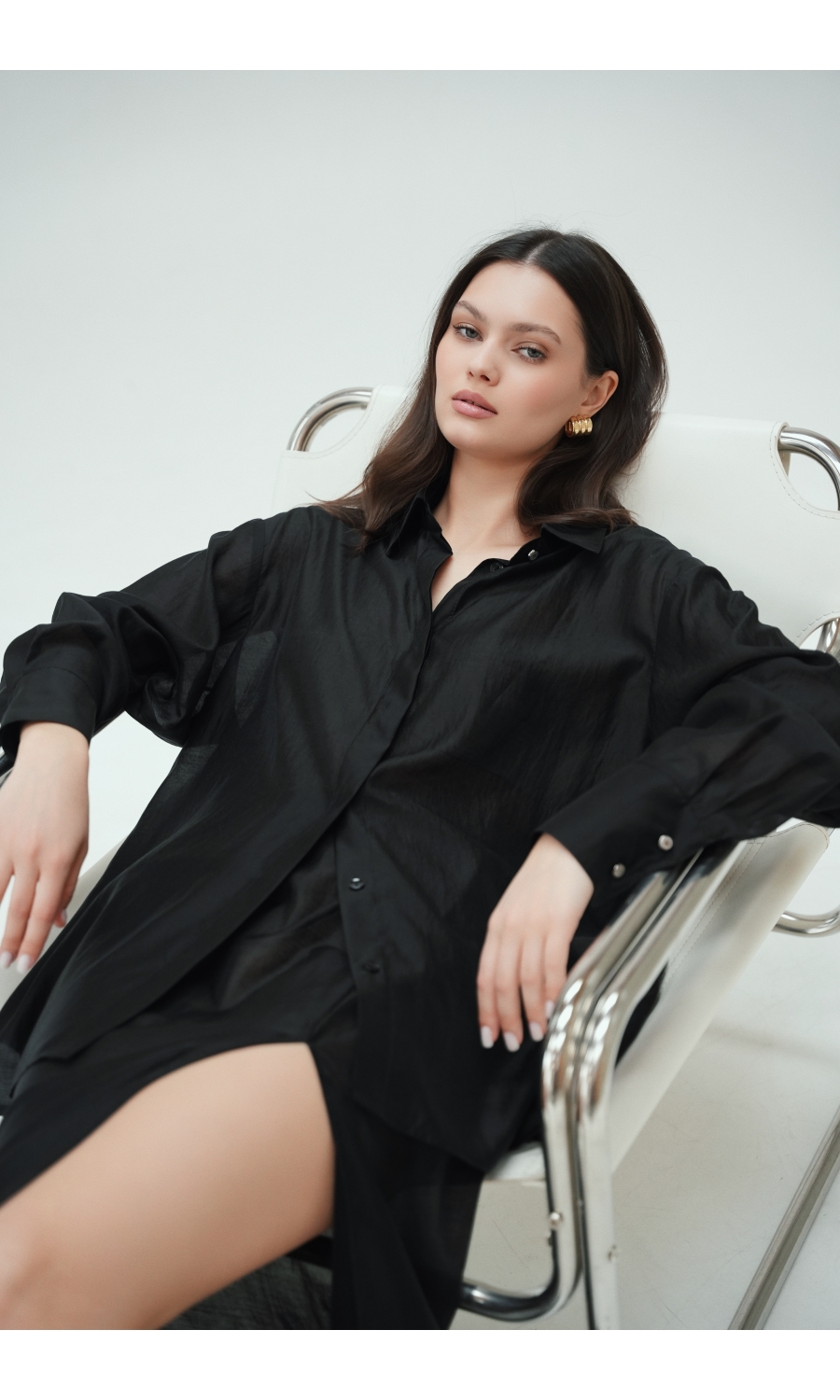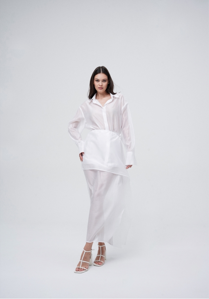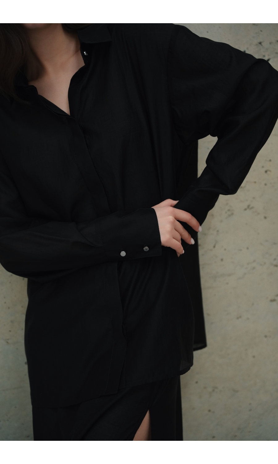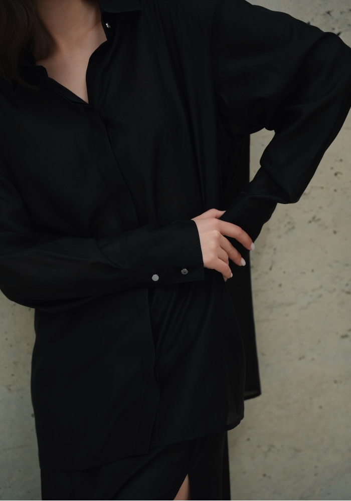 Рубашка прямого кроя со скрытой планкой. Акцентные металлические пуговицы на вороте и манжетах. Рубашка имеет выверенную длину, которая перекрывает паховую зону. Поэтому её можно носить с нижней юбкой без баски, заправляя рубашку или оставляя поверх юбки.