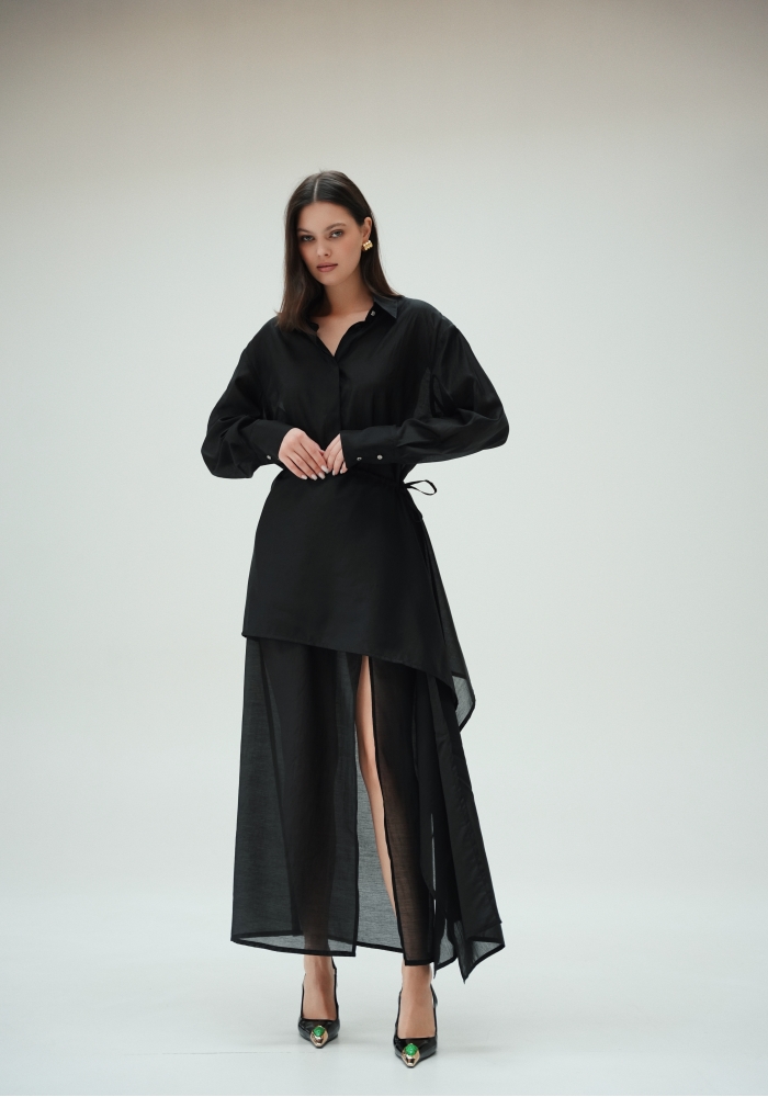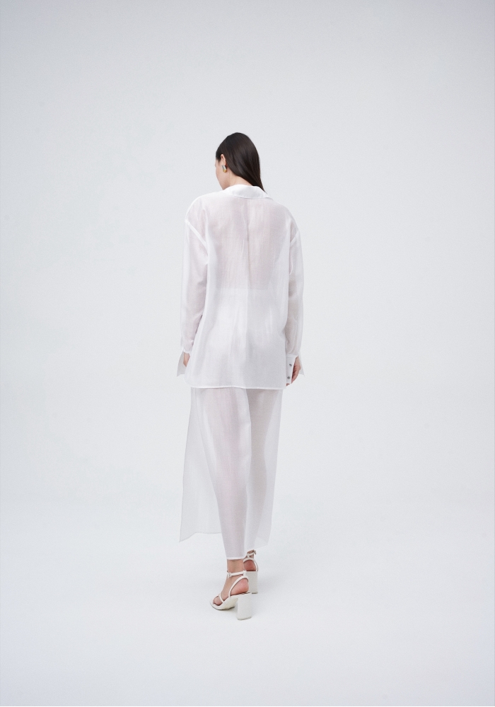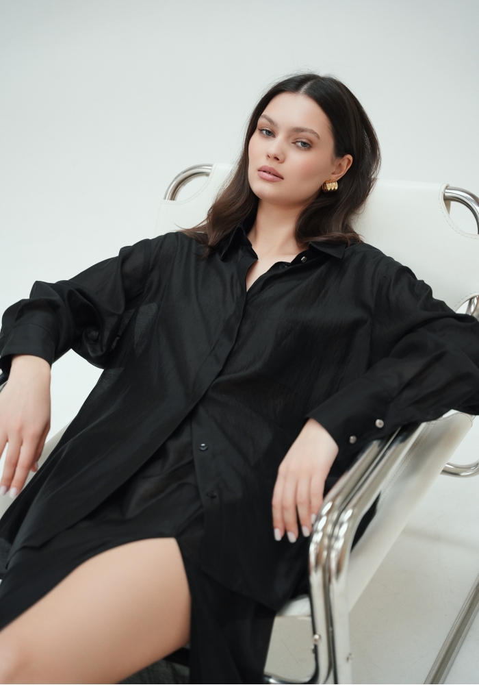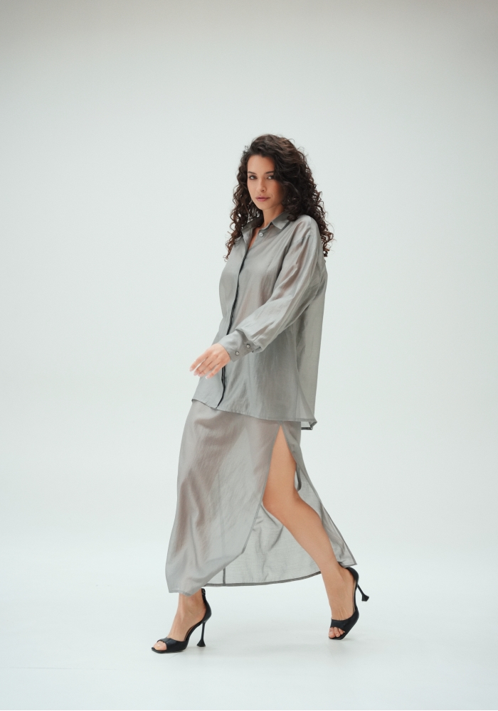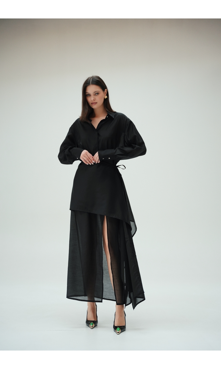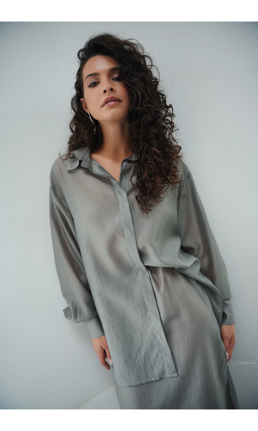 Рубашка прямого кроя со скрытой планкой. Акцентные металлические пуговицы на вороте и манжетах. Рубашка имеет выверенную длину, которая перекрывает паховую зону. Поэтому её можно носить с нижней юбкой без баски, заправляя рубашку или оставляя поверх юбки.