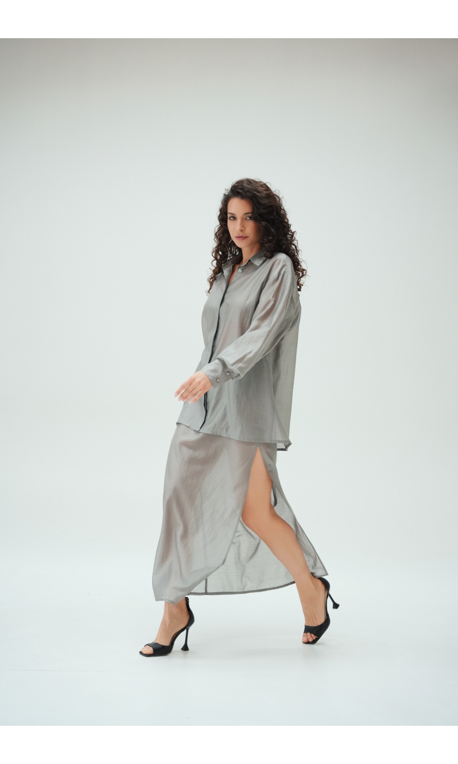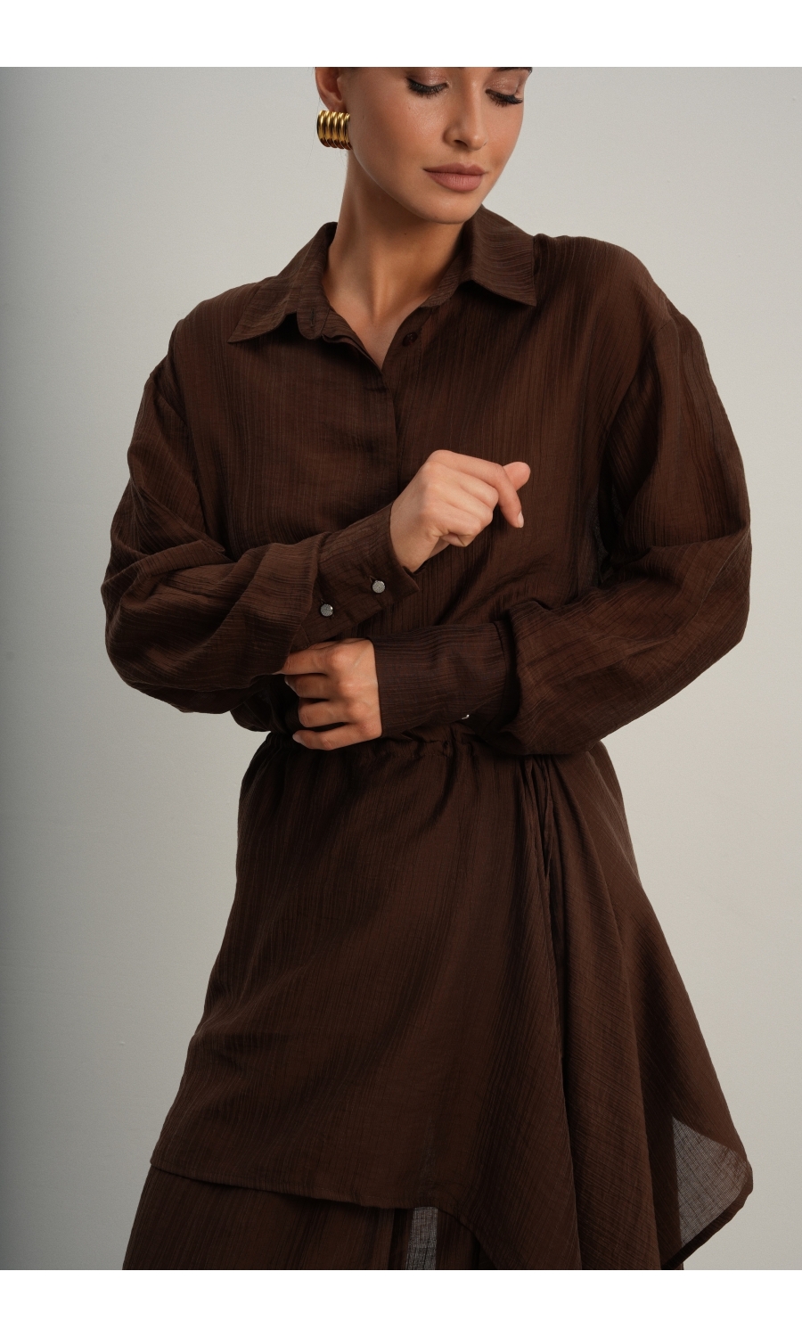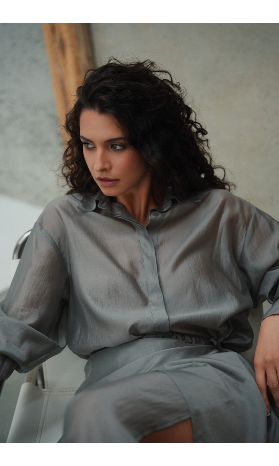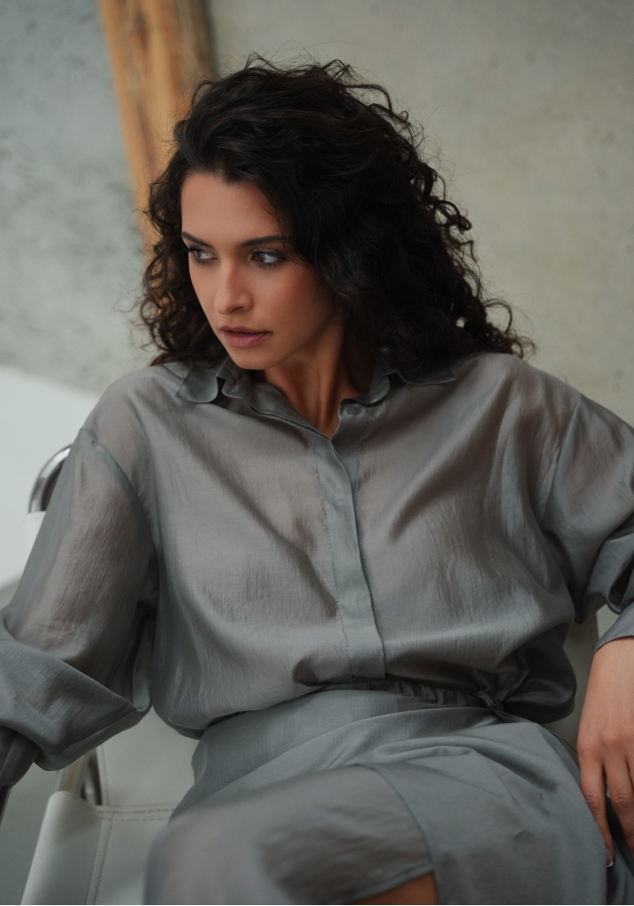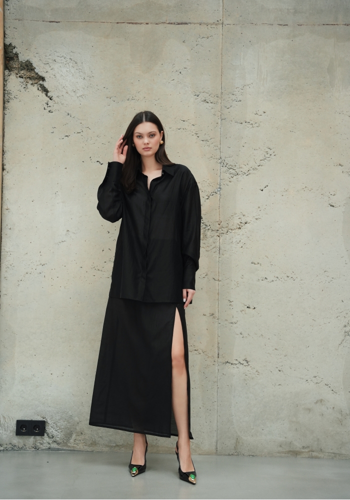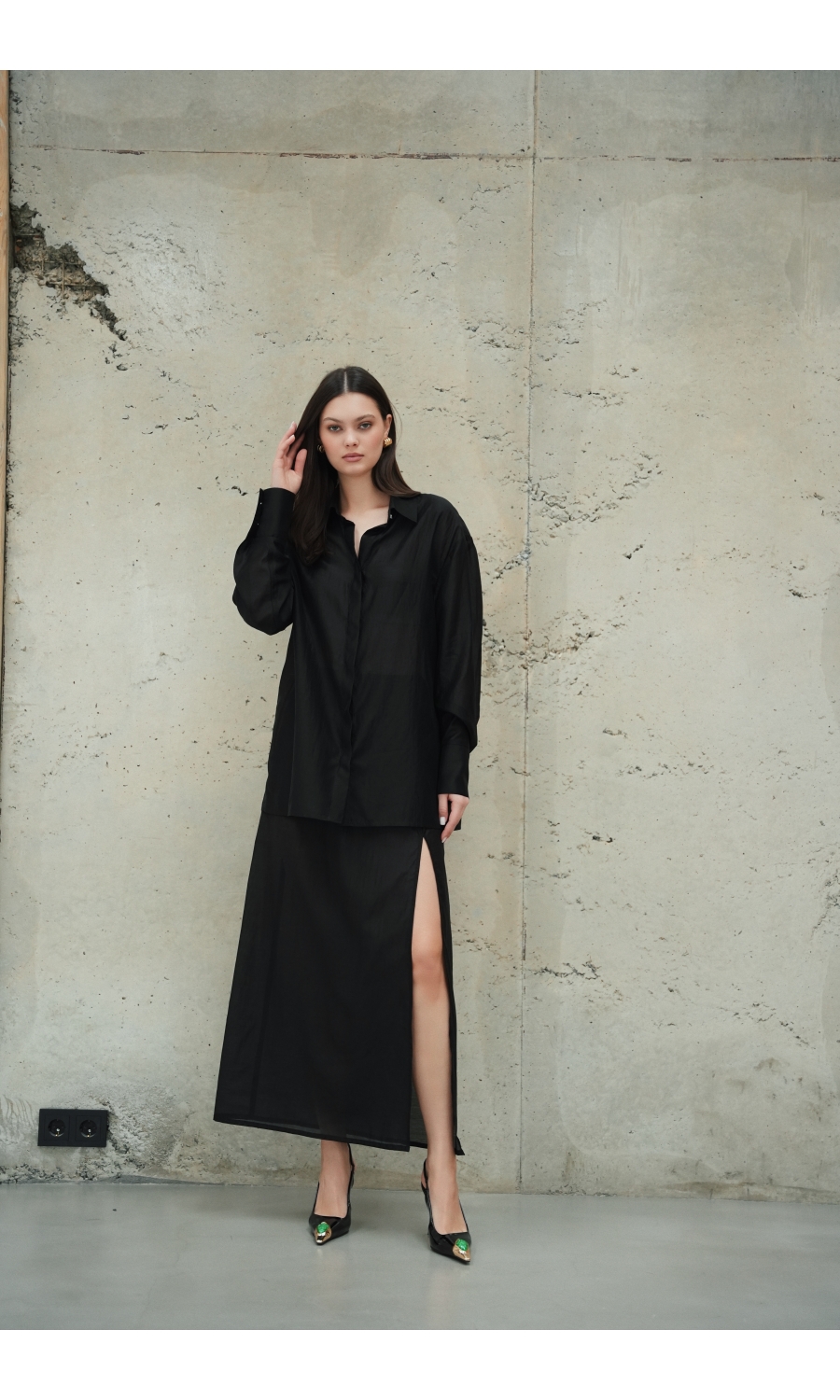 Рубашка прямого кроя со скрытой планкой. Акцентные металлические пуговицы на вороте и манжетах. Рубашка имеет выверенную длину, которая перекрывает паховую зону. Поэтому её можно носить с нижней юбкой без баски, заправляя рубашку или оставляя поверх юбки.