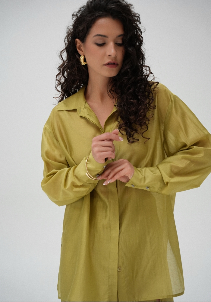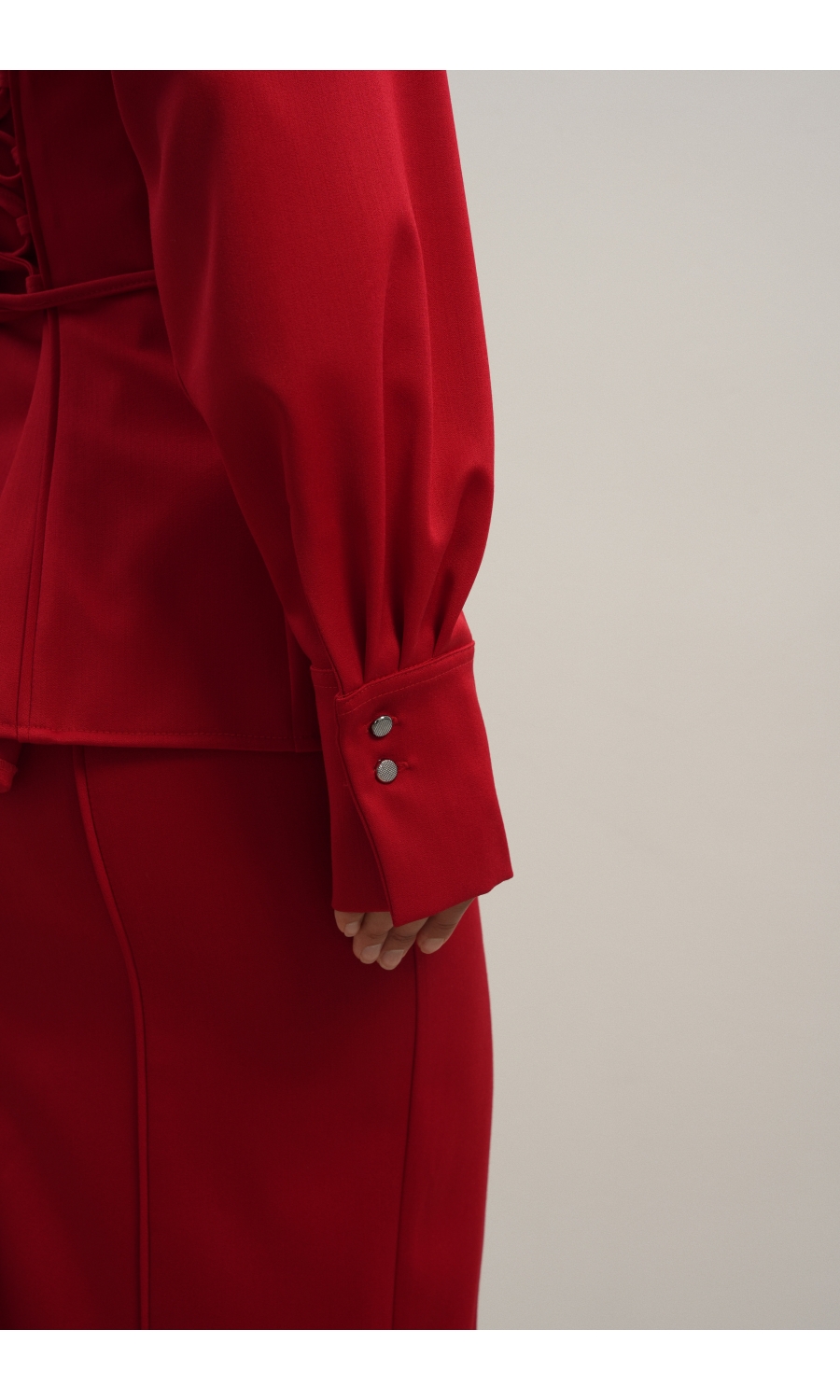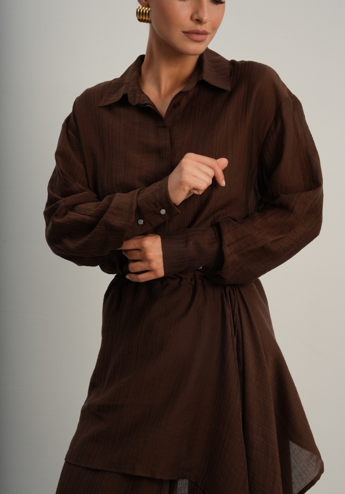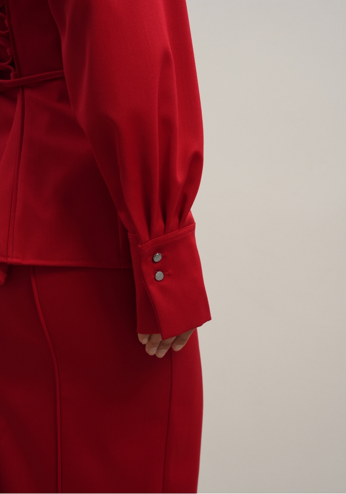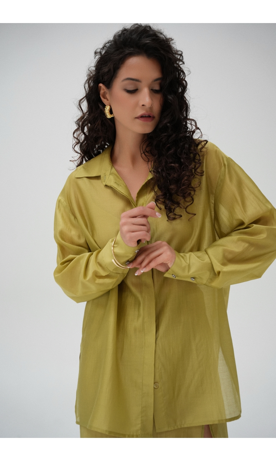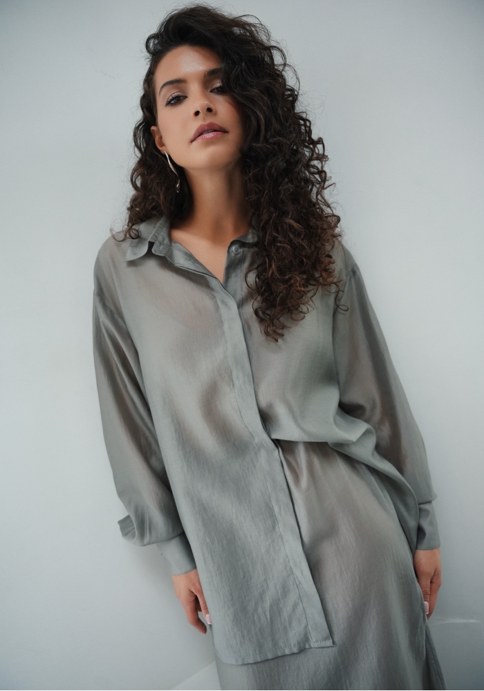 Рубашка прямого кроя со скрытой планкой. Акцентные металлические пуговицы на вороте и манжетах. Рубашка имеет выверенную длину, которая перекрывает паховую зону. Поэтому её можно носить с нижней юбкой без баски, заправляя рубашку или оставляя поверх юбки.