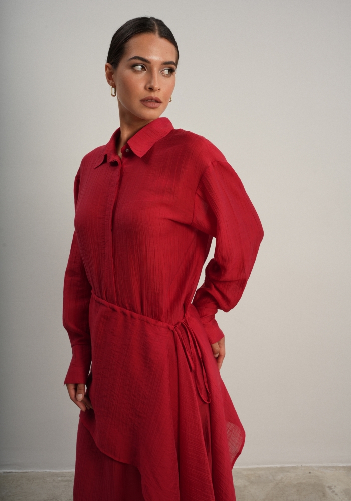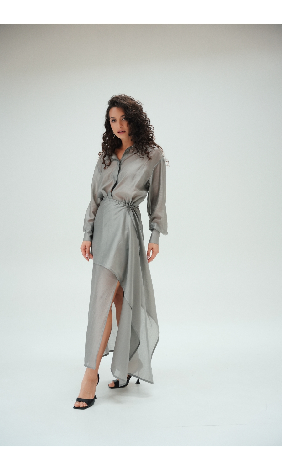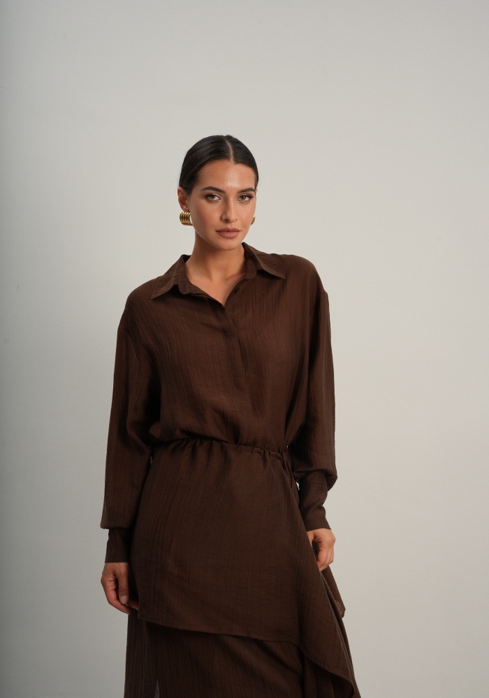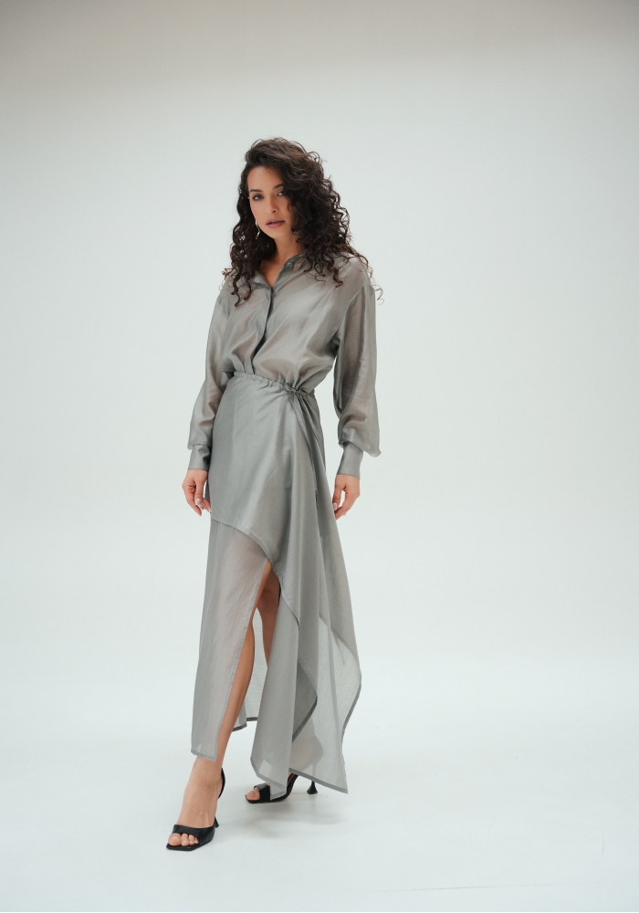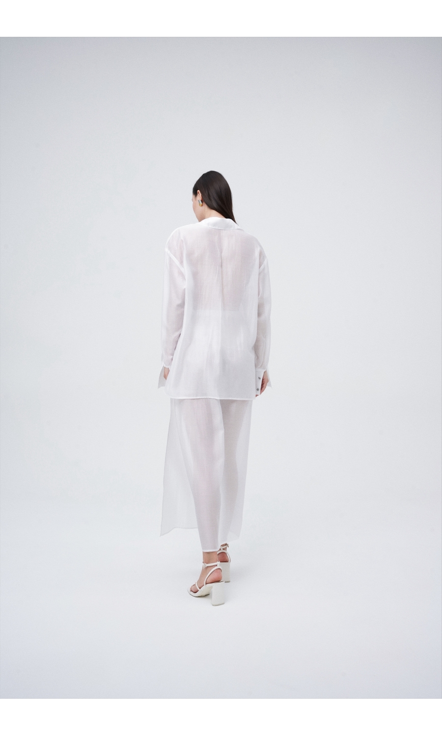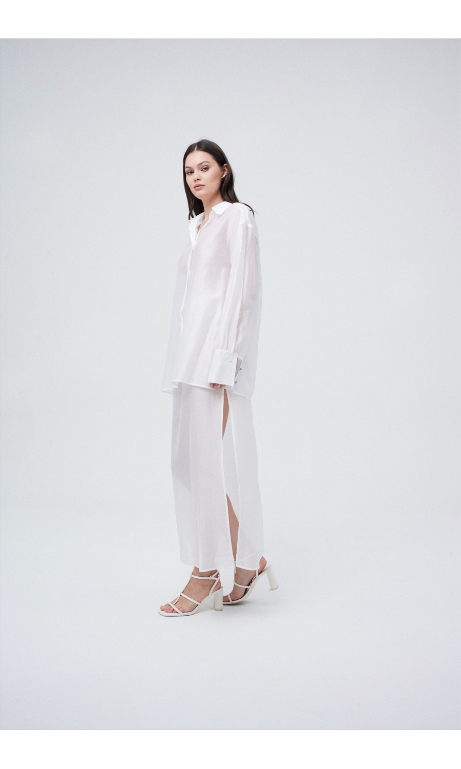 Рубашка прямого кроя со скрытой планкой. Акцентные металлические пуговицы на вороте и манжетах. Рубашка имеет выверенную длину, которая перекрывает паховую зону. Поэтому её можно носить с нижней юбкой без баски, заправляя рубашку или оставляя поверх юбки.