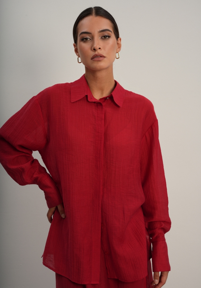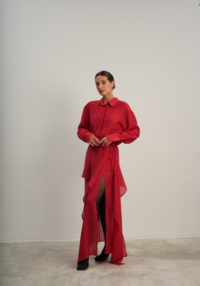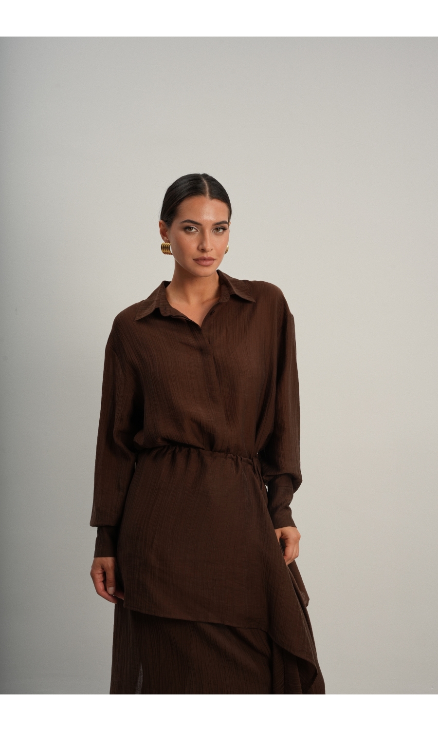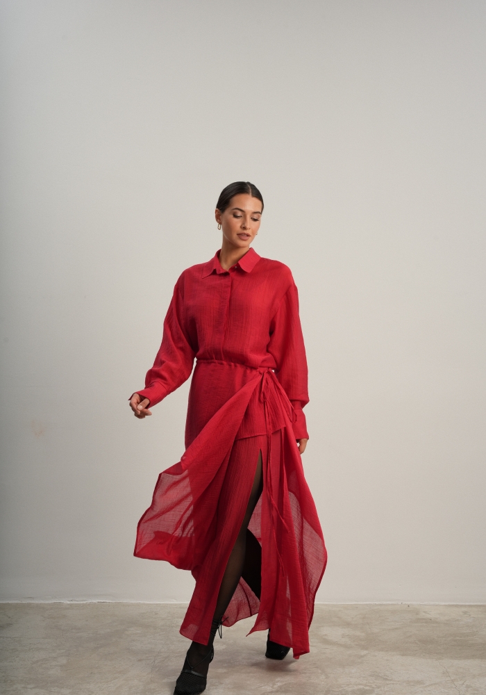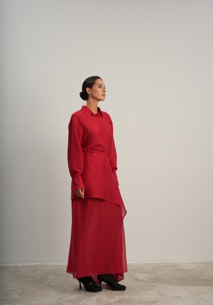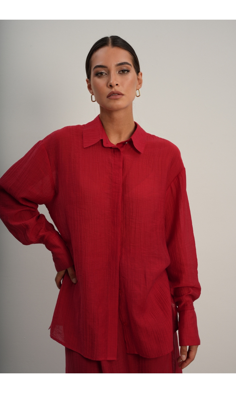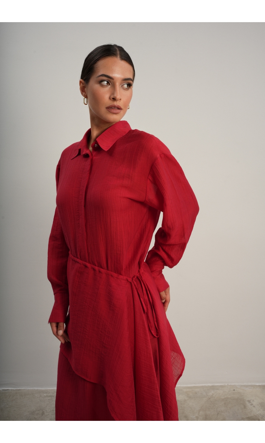 Рубашка прямого кроя со скрытой планкой. Акцентные металлические пуговицы на вороте и манжетах. Рубашка имеет выверенную длину, которая перекрывает паховую зону. Поэтому её можно носить с нижней юбкой без баски, заправляя рубашку или оставляя поверх юбки.