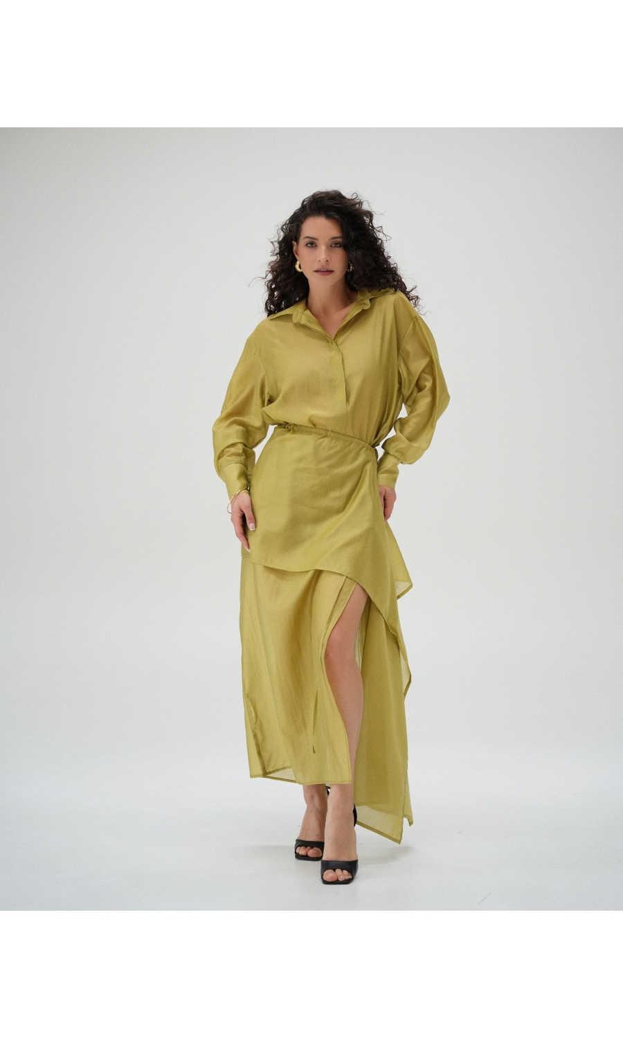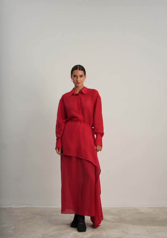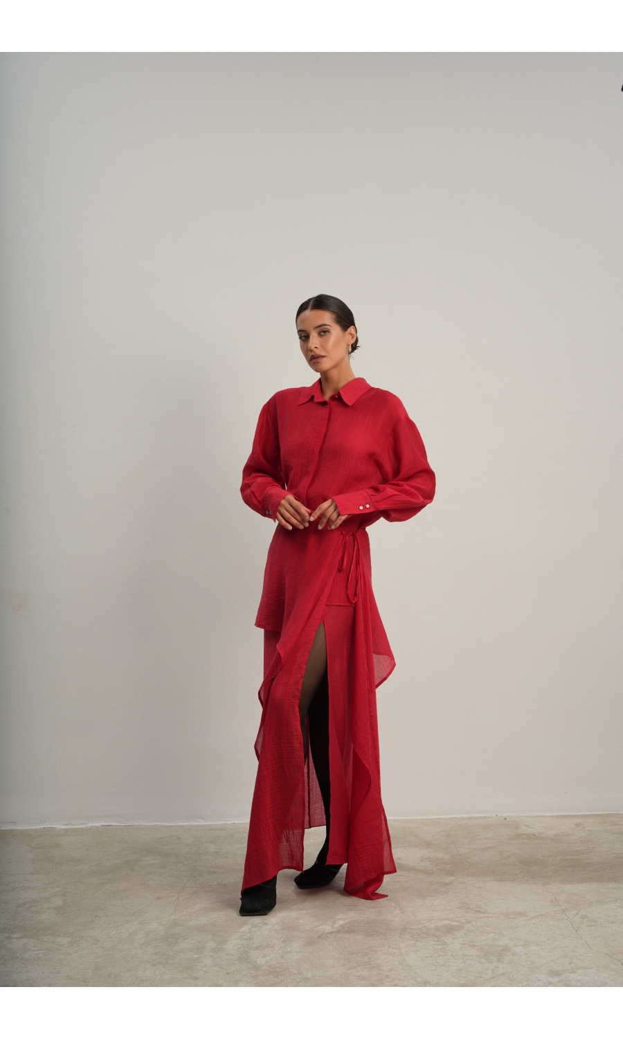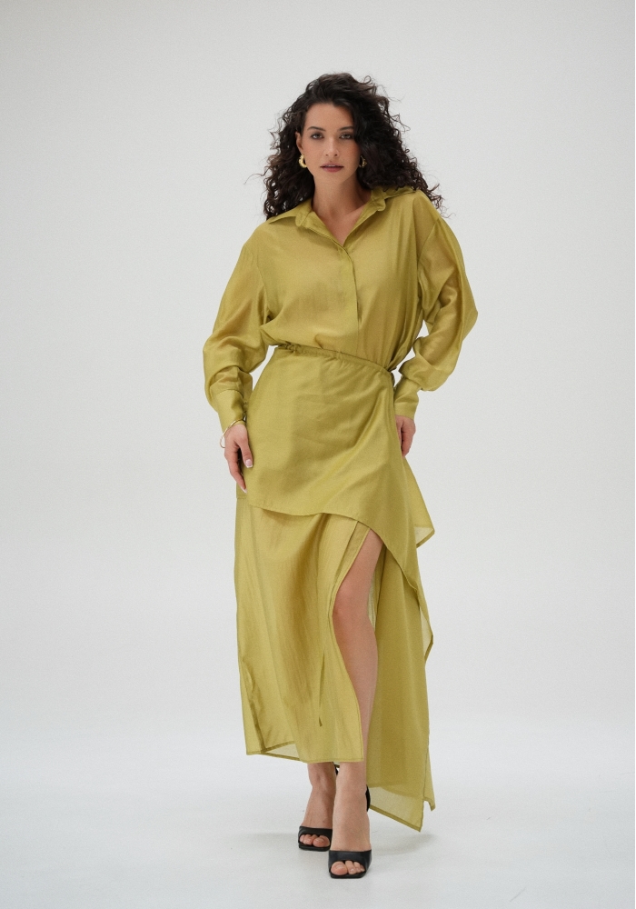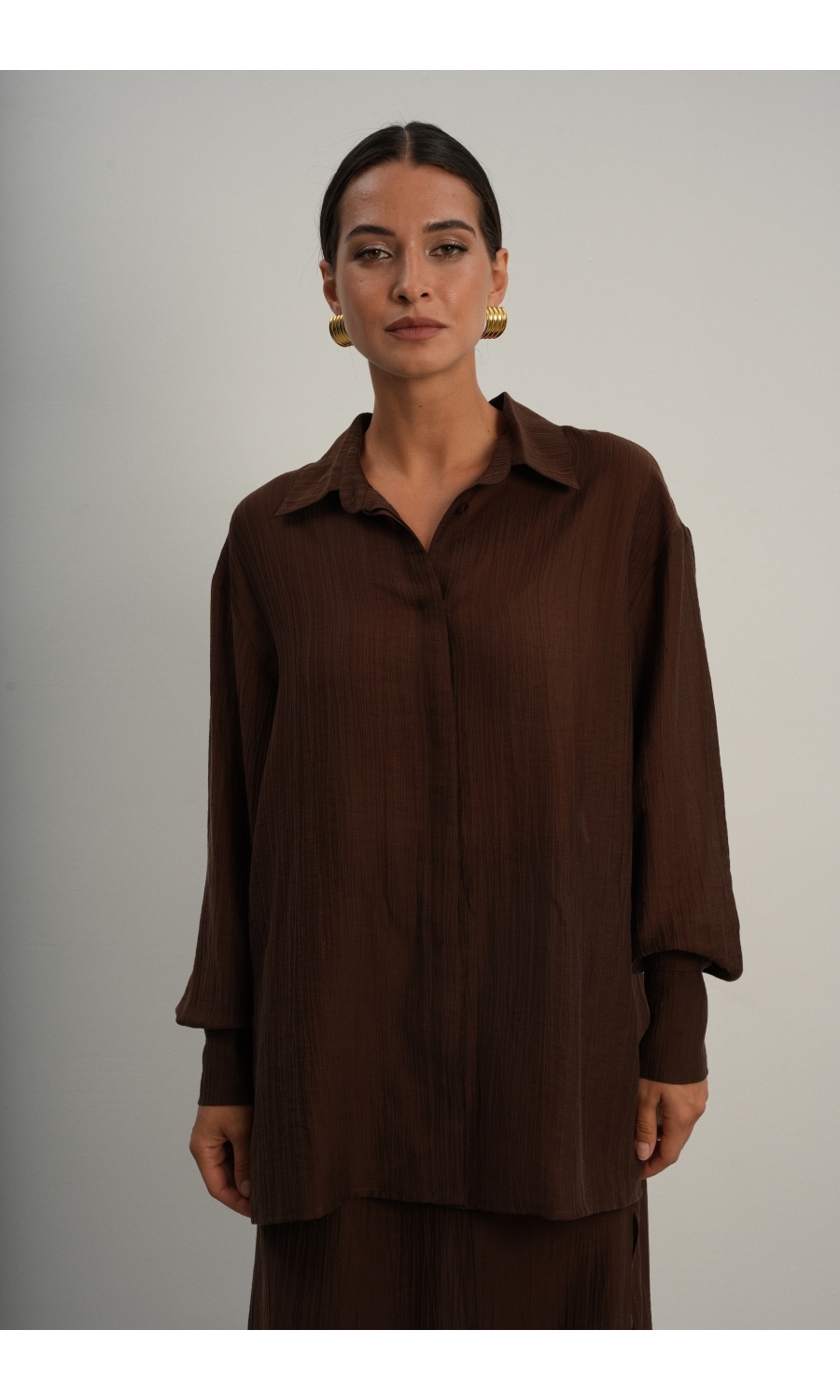 Рубашка прямого кроя со скрытой планкой. Акцентные металлические пуговицы на вороте и манжетах. Рубашка имеет выверенную длину, которая перекрывает паховую зону. Поэтому её можно носить с нижней юбкой без баски, заправляя рубашку или оставляя поверх юбки.