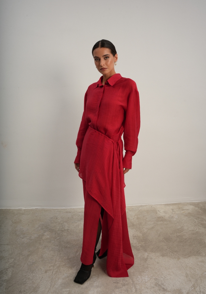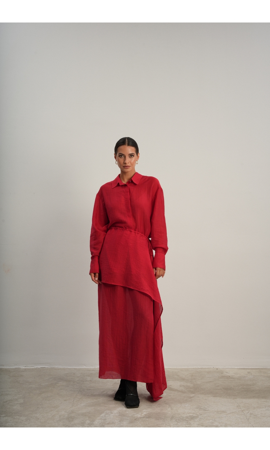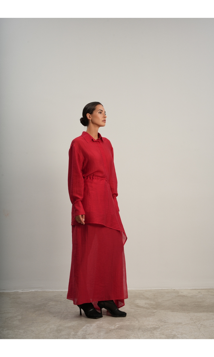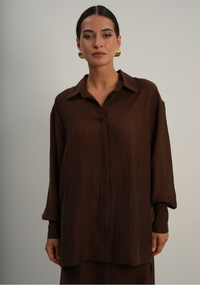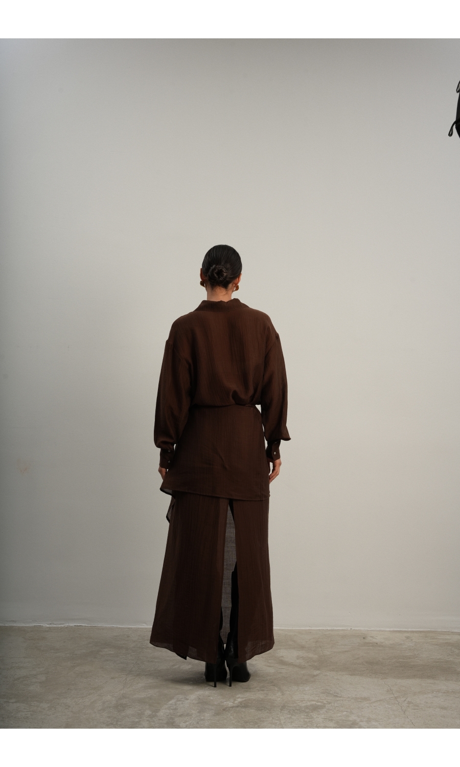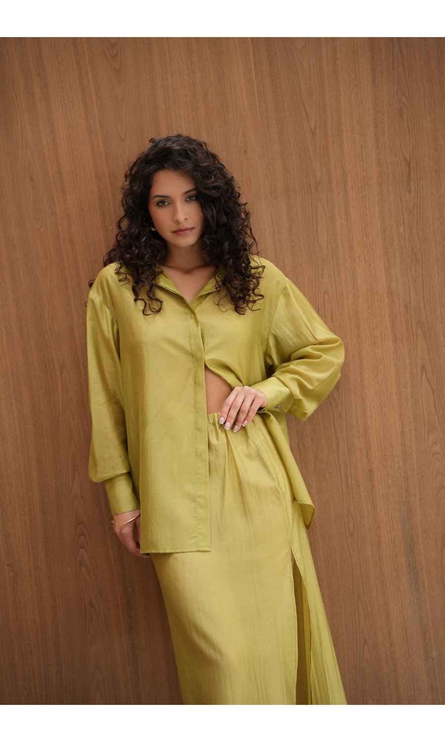 Рубашка прямого кроя со скрытой планкой. Акцентные металлические пуговицы на вороте и манжетах. Рубашка имеет выверенную длину, которая перекрывает паховую зону. Поэтому её можно носить с нижней юбкой без баски, заправляя рубашку или оставляя поверх юбки.