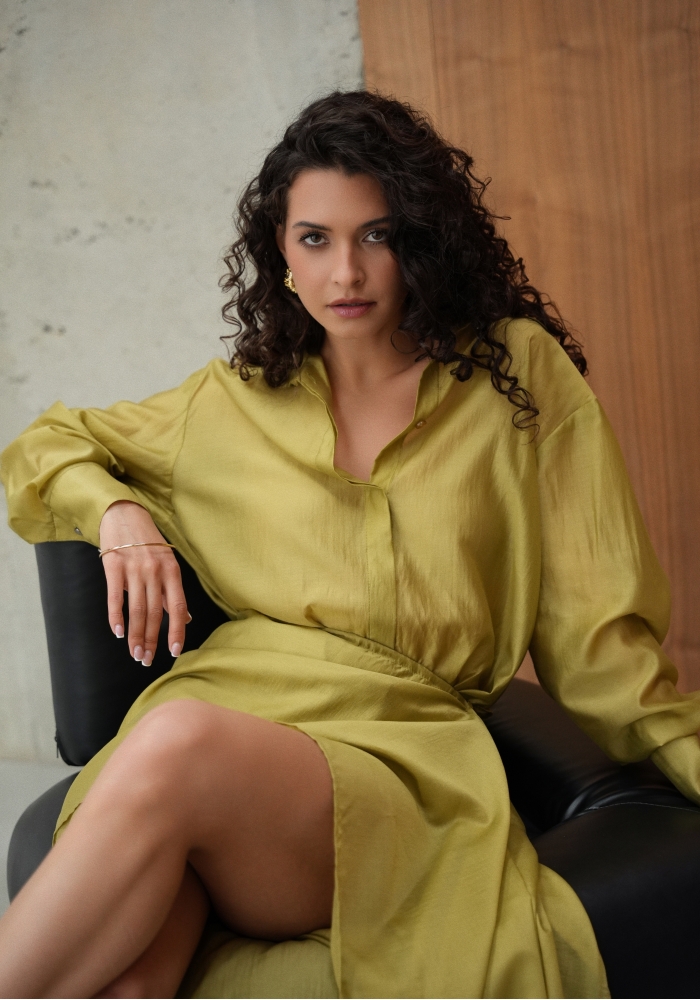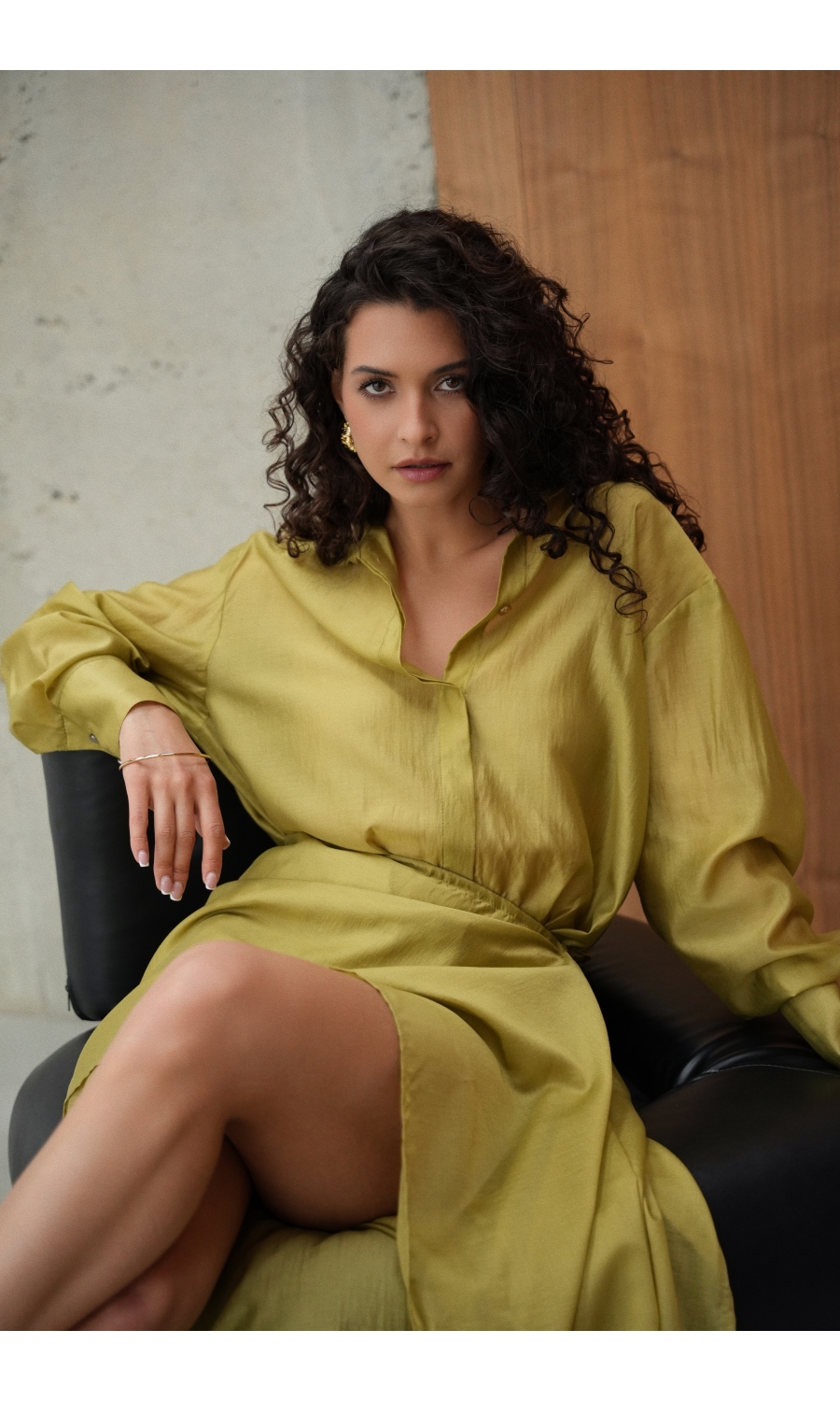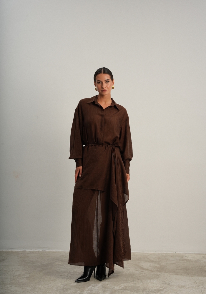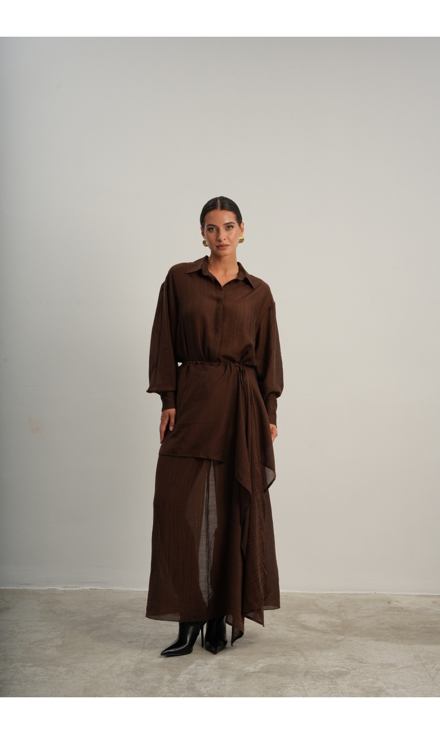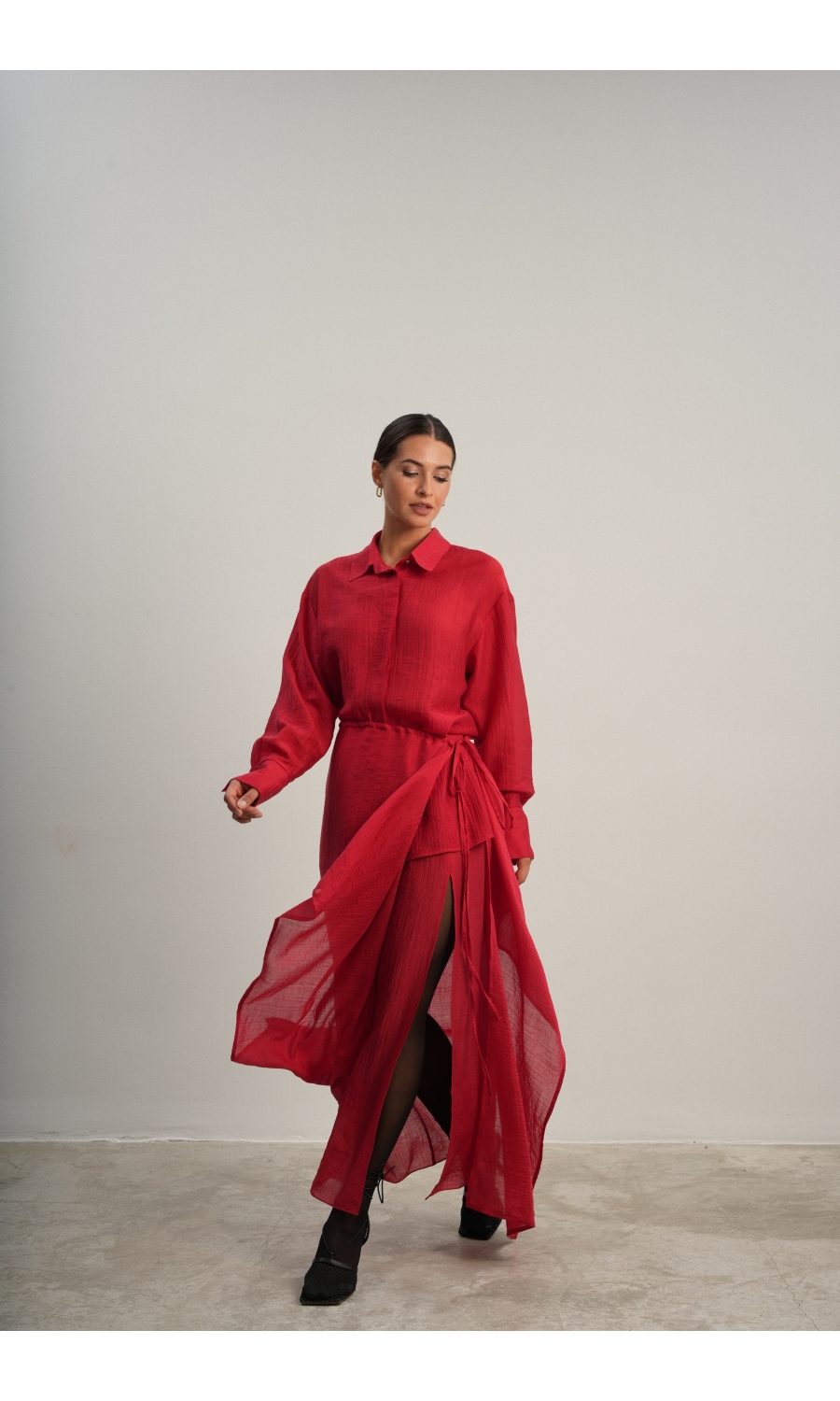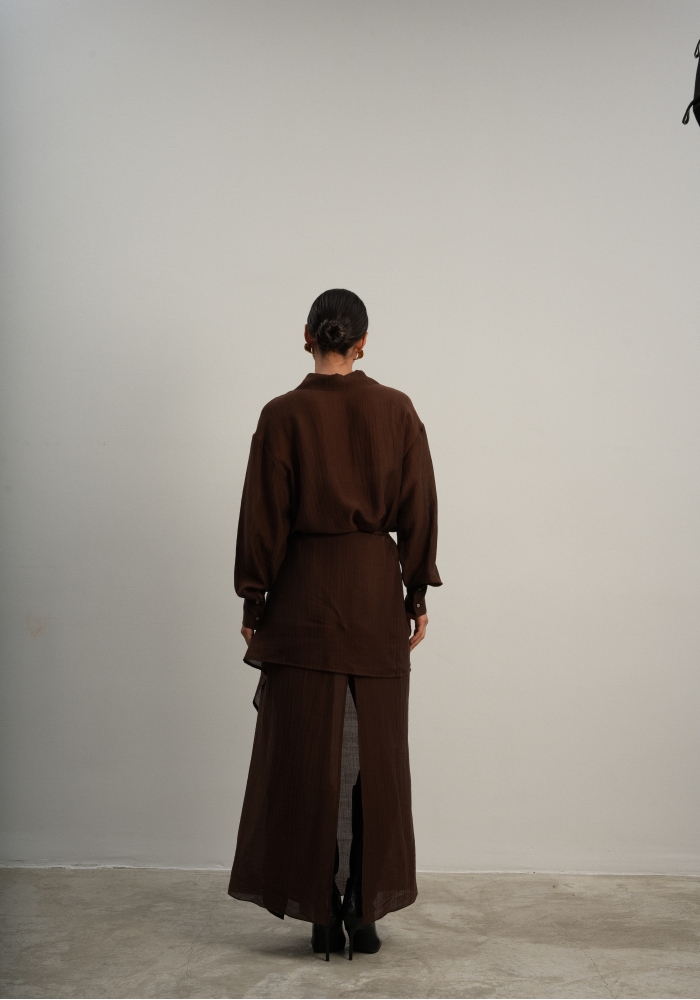 Рубашка прямого кроя со скрытой планкой. Акцентные металлические пуговицы на вороте и манжетах. Рубашка имеет выверенную длину, которая перекрывает паховую зону. Поэтому её можно носить с нижней юбкой без баски, заправляя рубашку или оставляя поверх юбки.