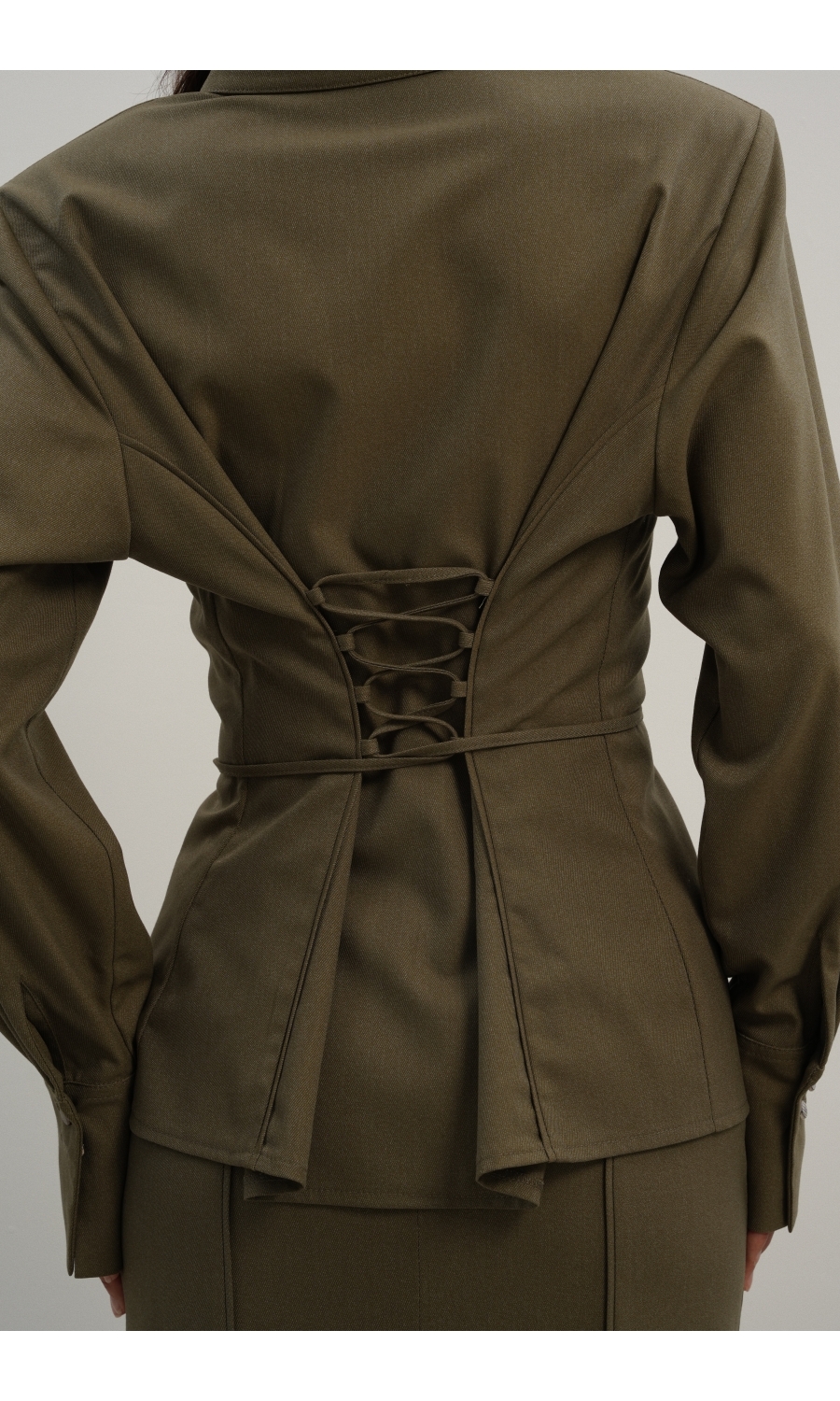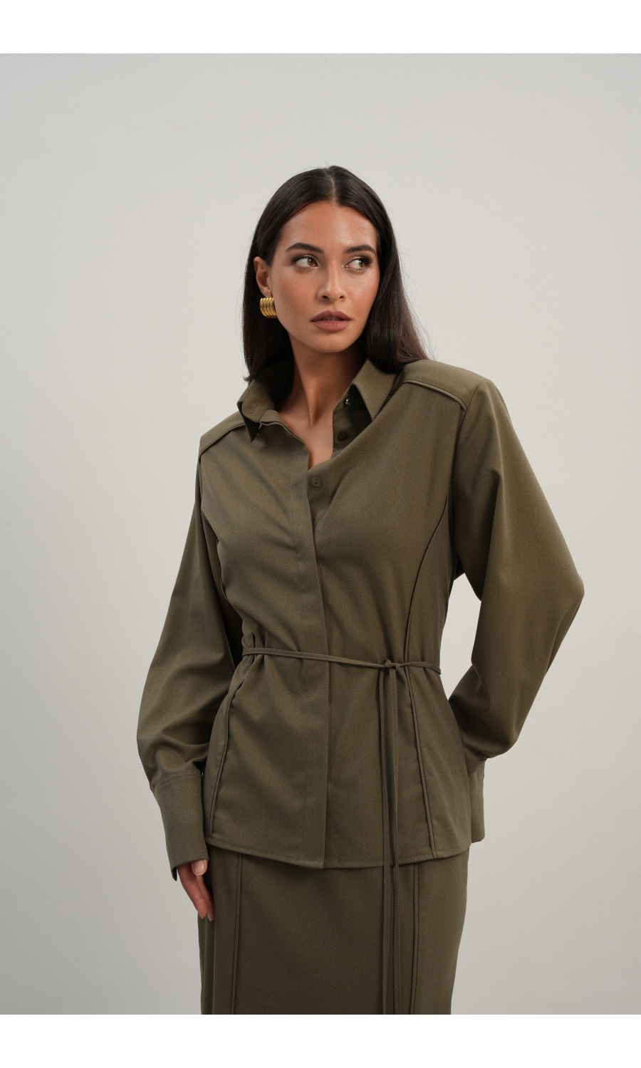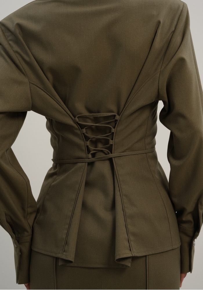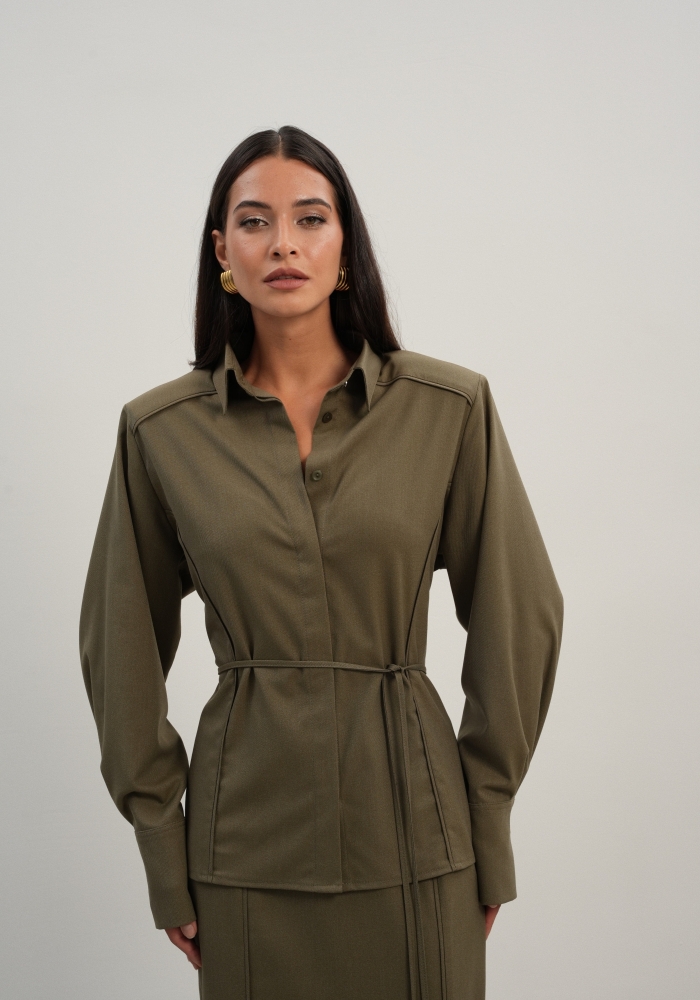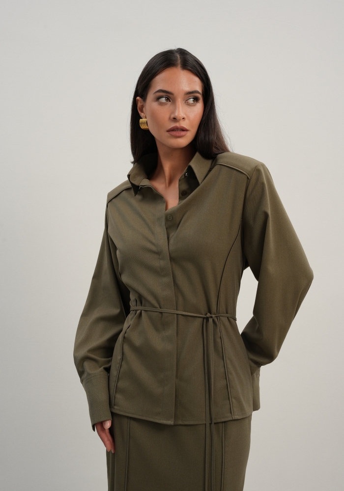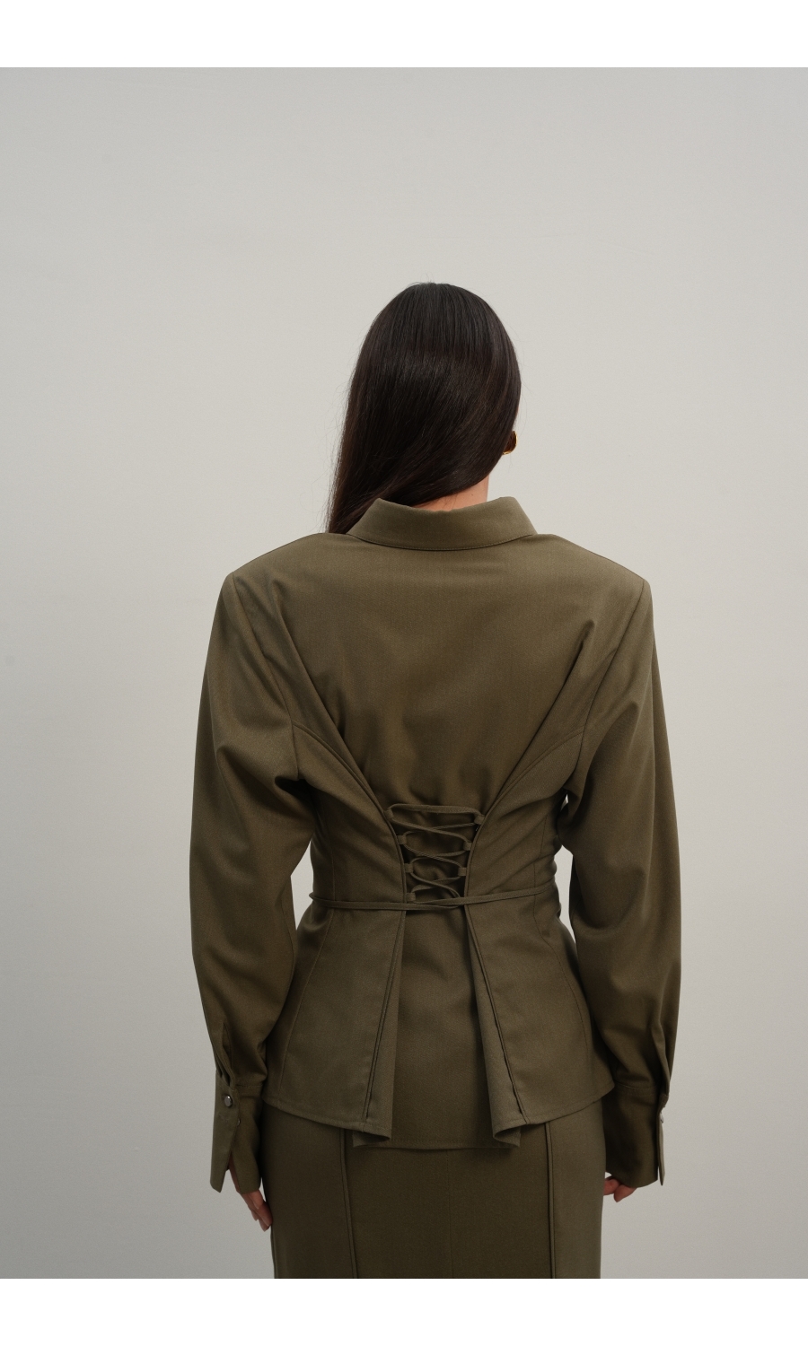 Рубашка с акцентными плечами приталенного силуэта с рельефами. Сзади по спинке расположена шнуровка, которая позволяет регулировать ширину изделия на талии.