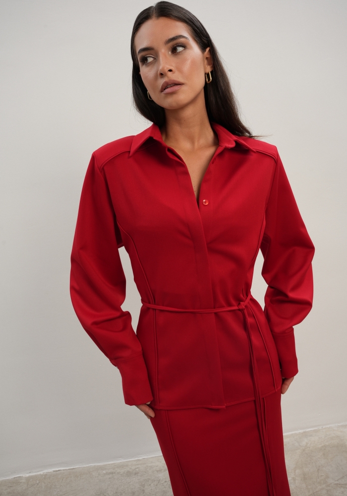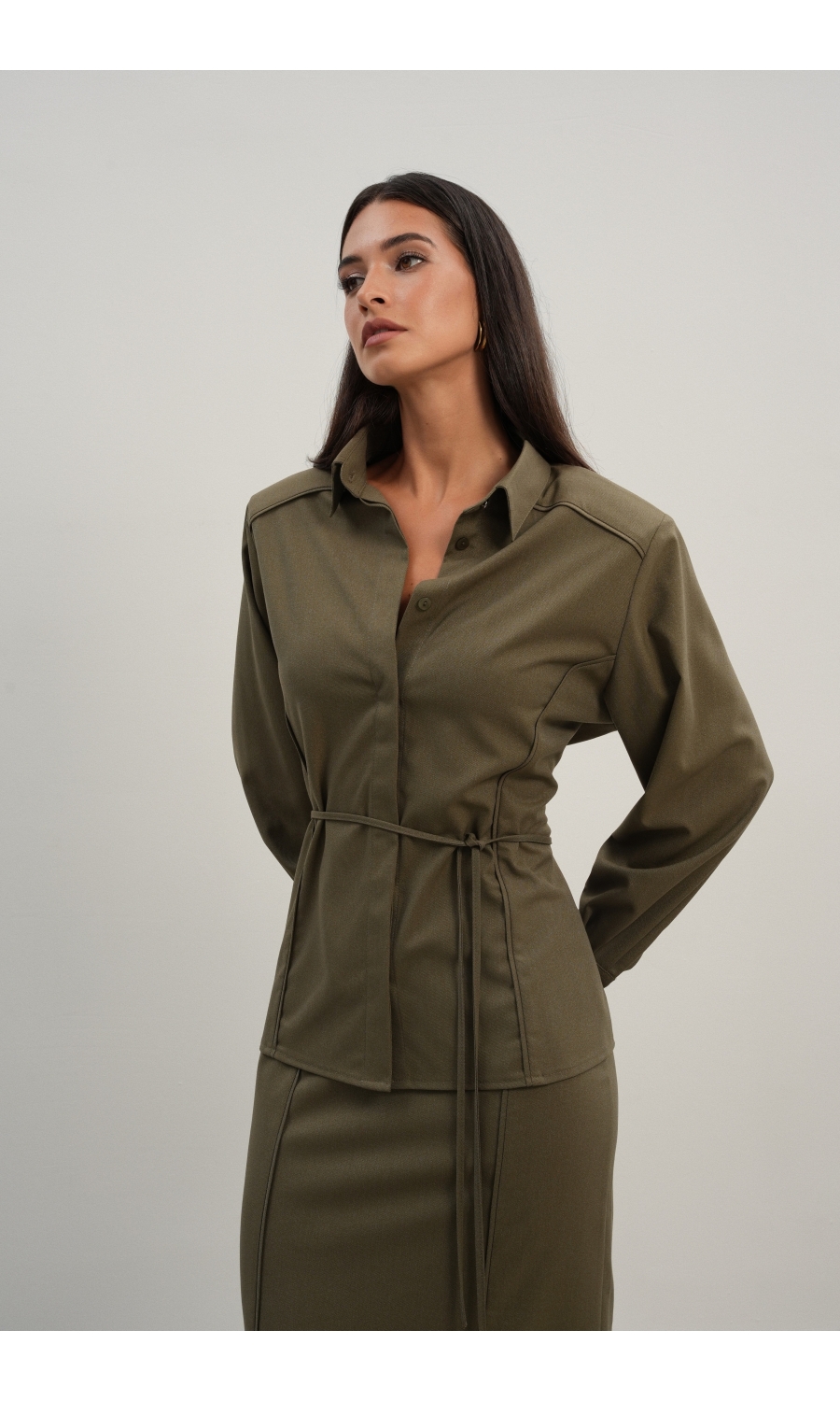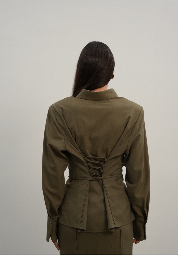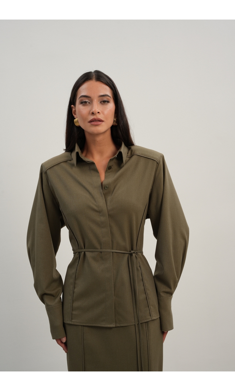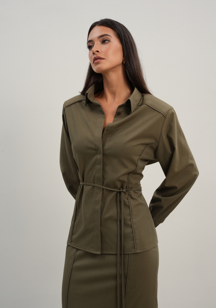 Рубашка с акцентными плечами приталенного силуэта с рельефами. Сзади по спинке расположена шнуровка, которая позволяет регулировать ширину изделия на талии.