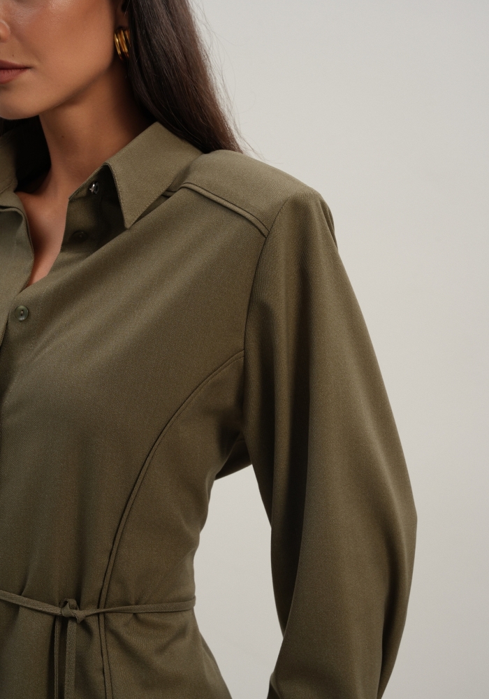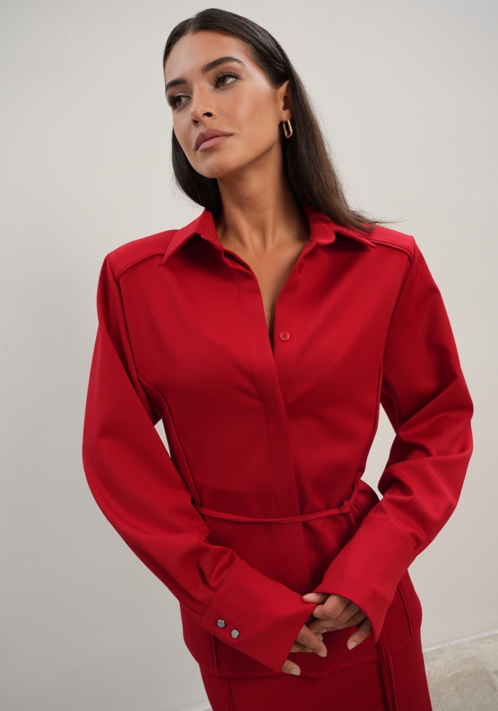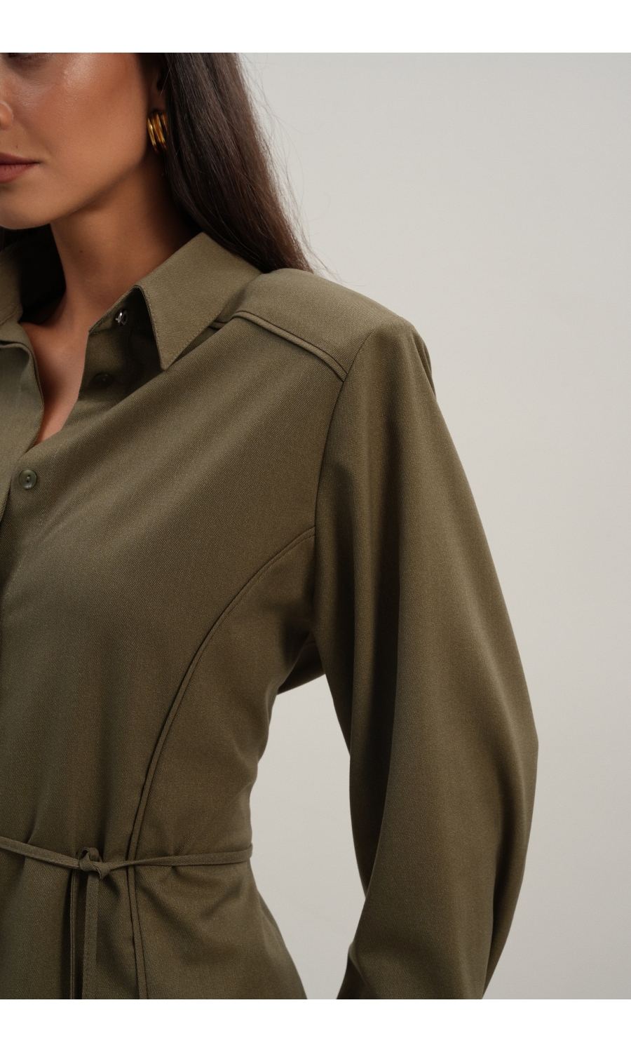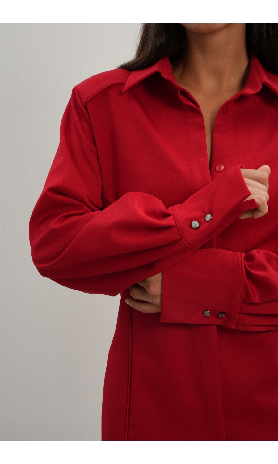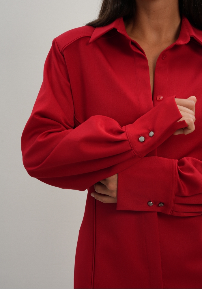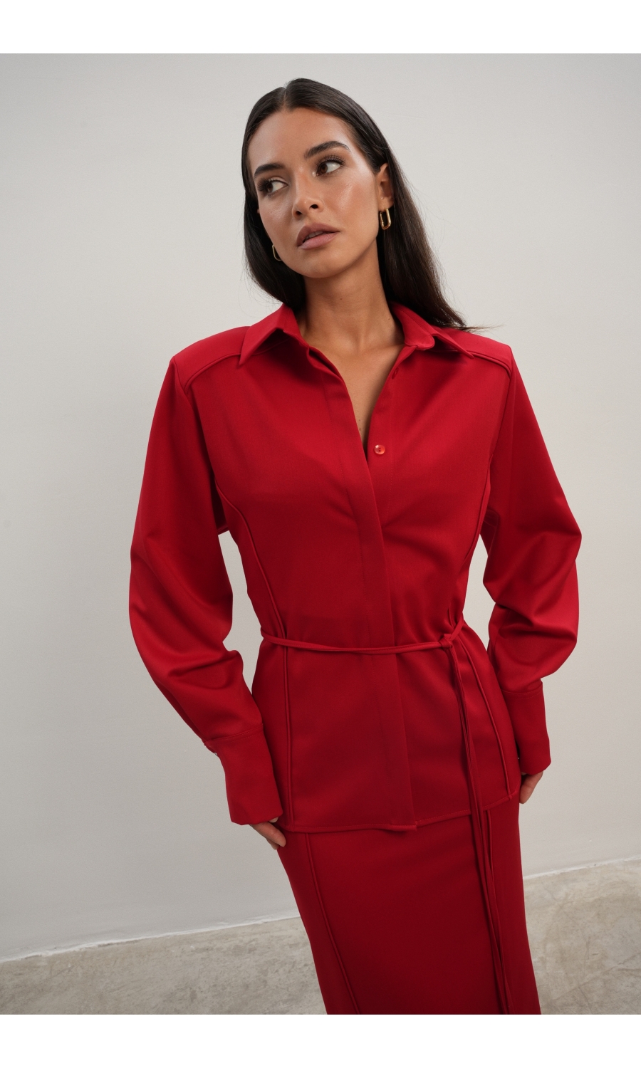 Рубашка с акцентными плечами приталенного силуэта с рельефами. Сзади по спинке расположена шнуровка, которая позволяет регулировать ширину изделия на талии.