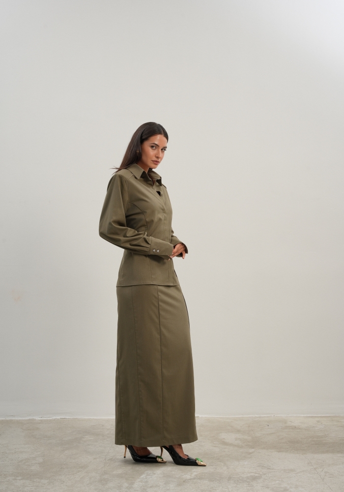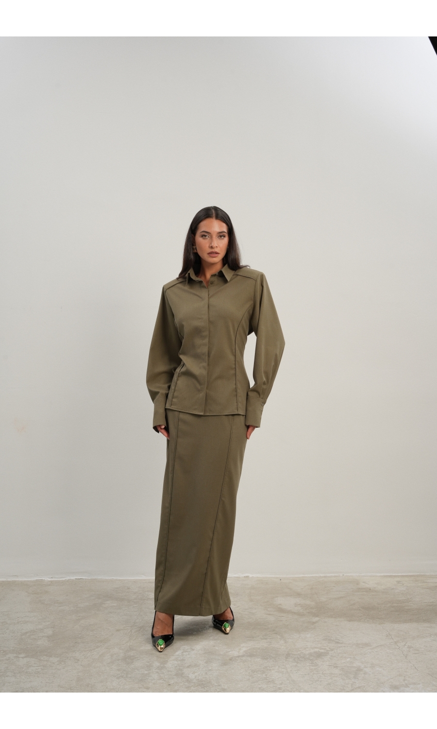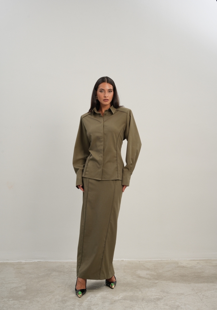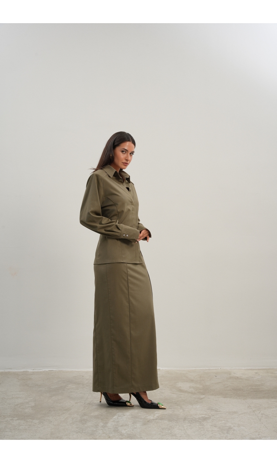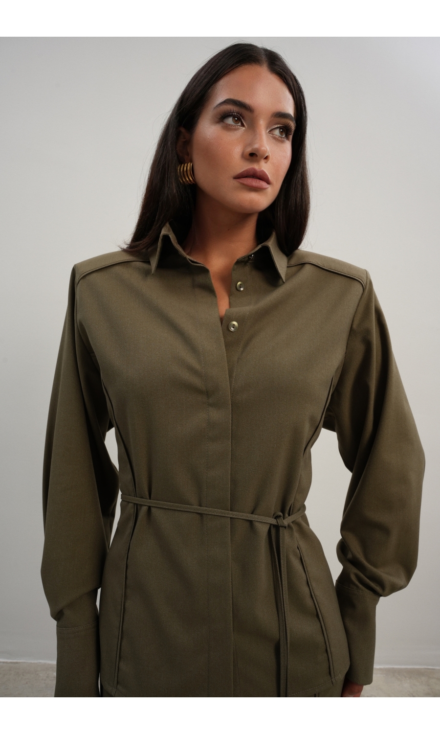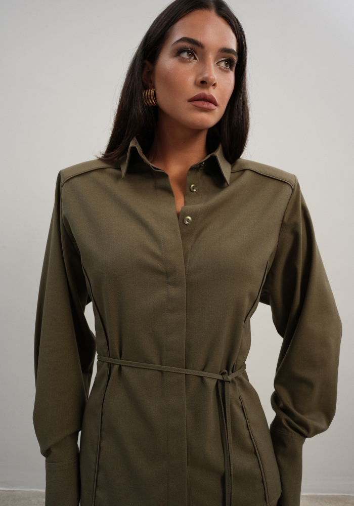 Рубашка с акцентными плечами приталенного силуэта с рельефами. Сзади по спинке расположена шнуровка, которая позволяет регулировать ширину изделия на талии.