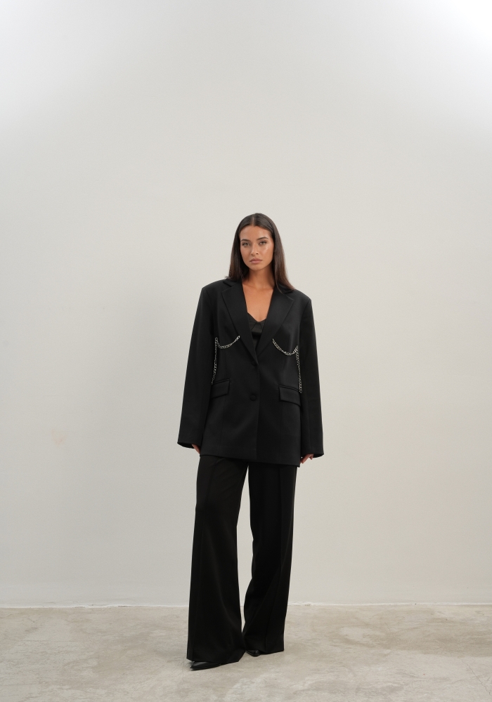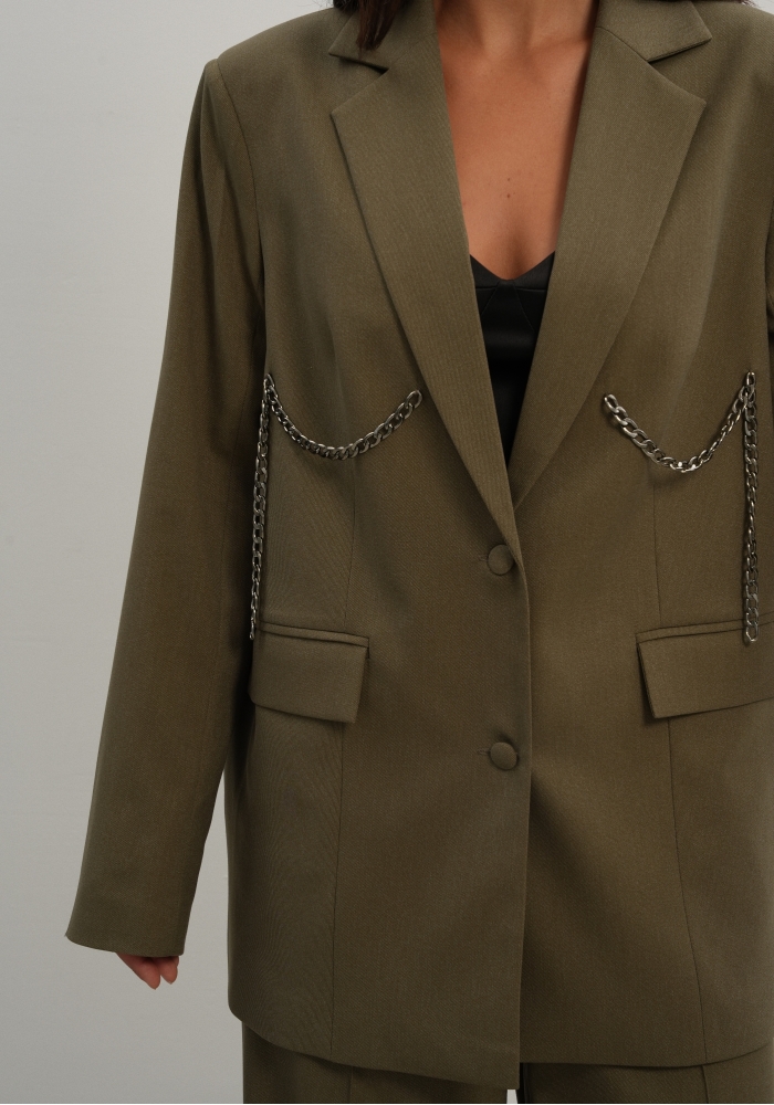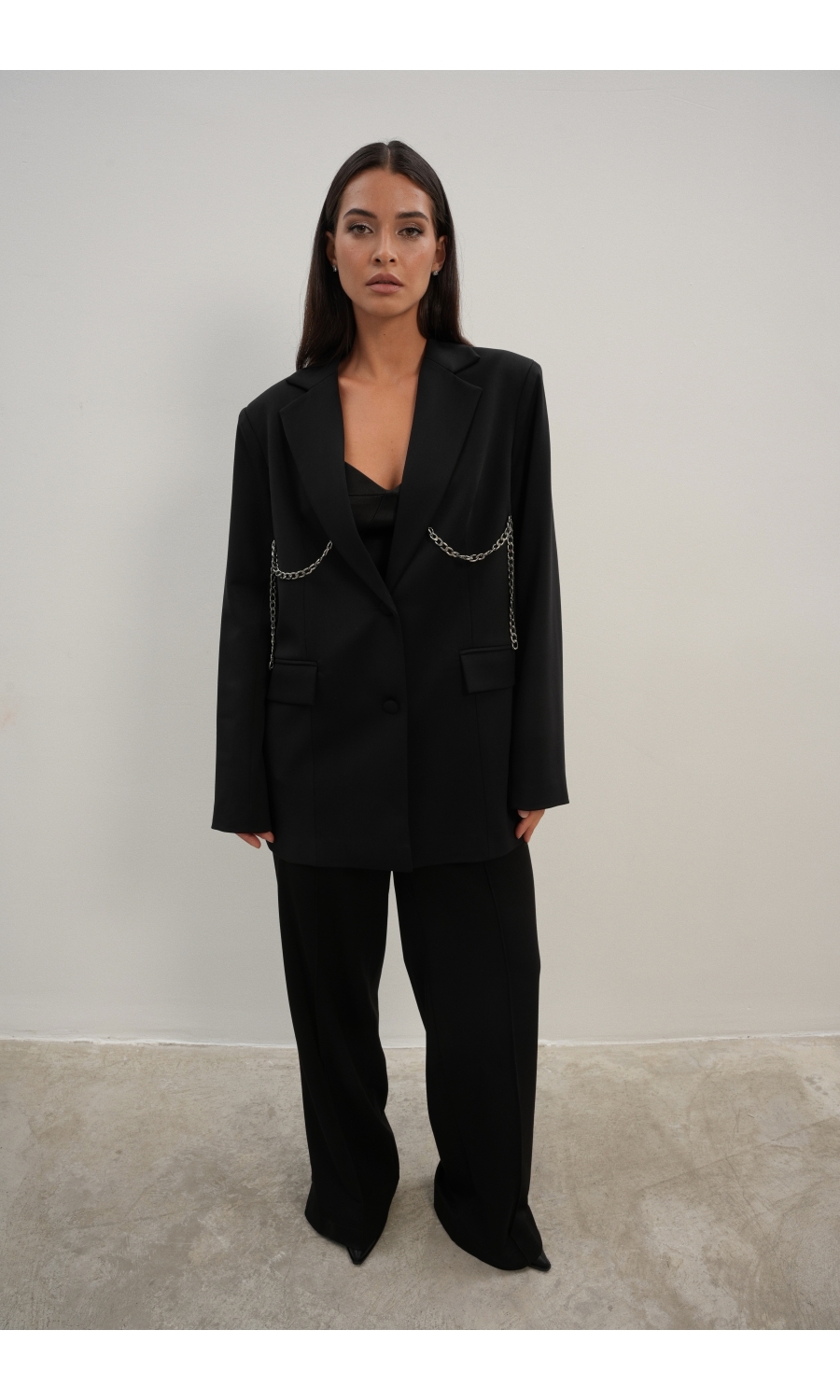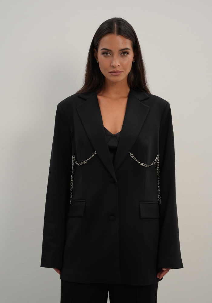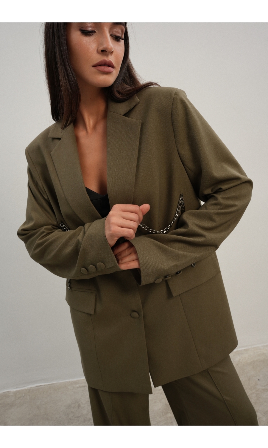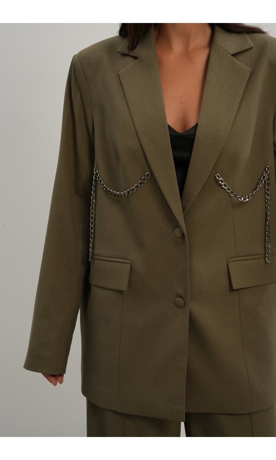 | Двубортный жакет прямого кроя выполнен из поливискозной ткани. На зоне груди расположена несъемная акцентная деталь в виде цепи. |
