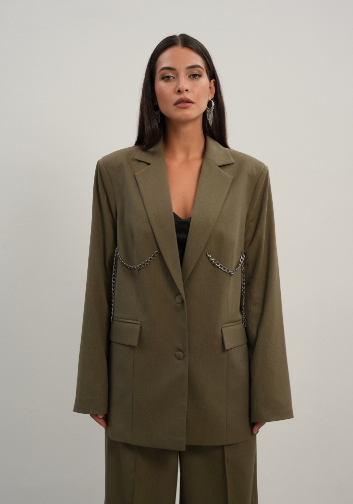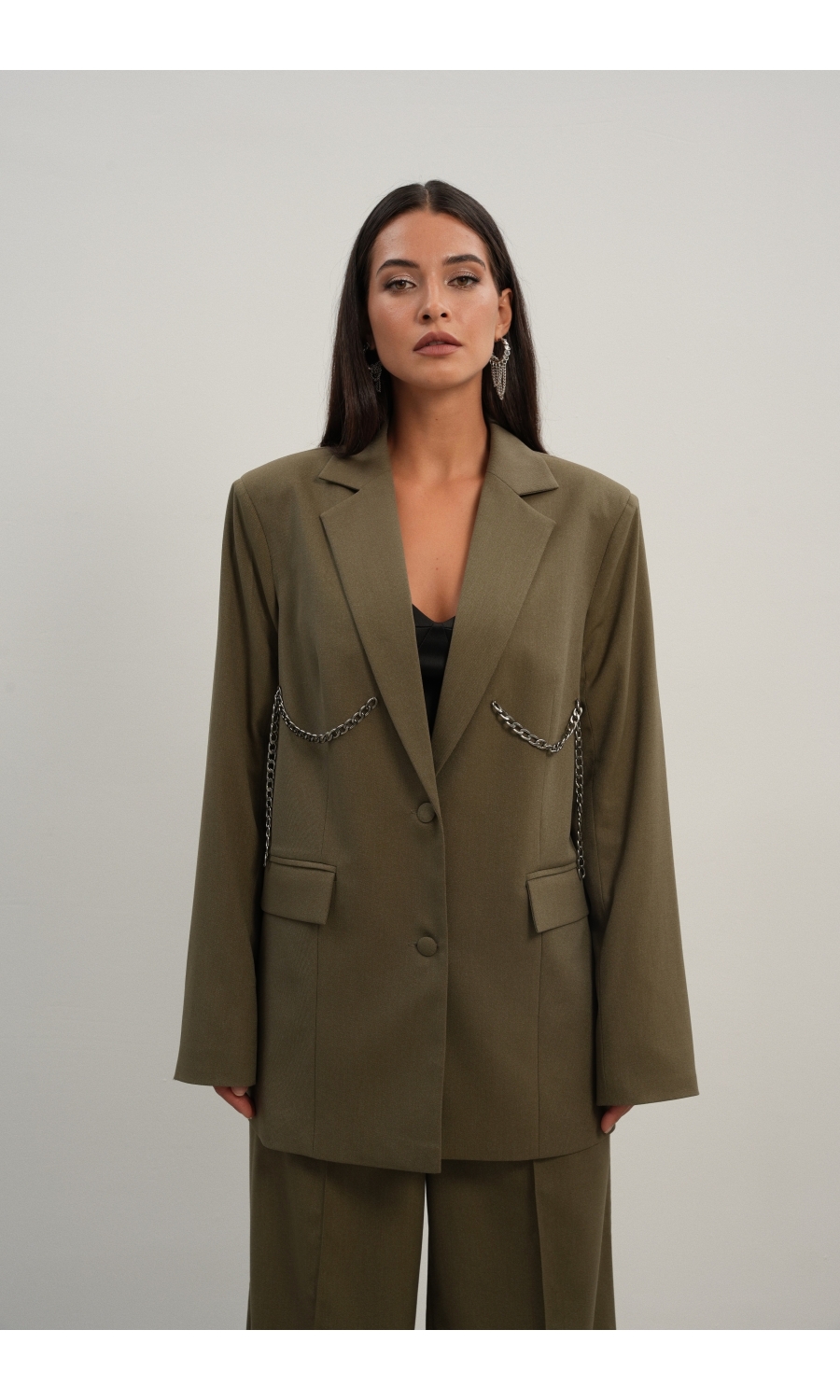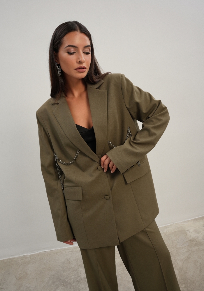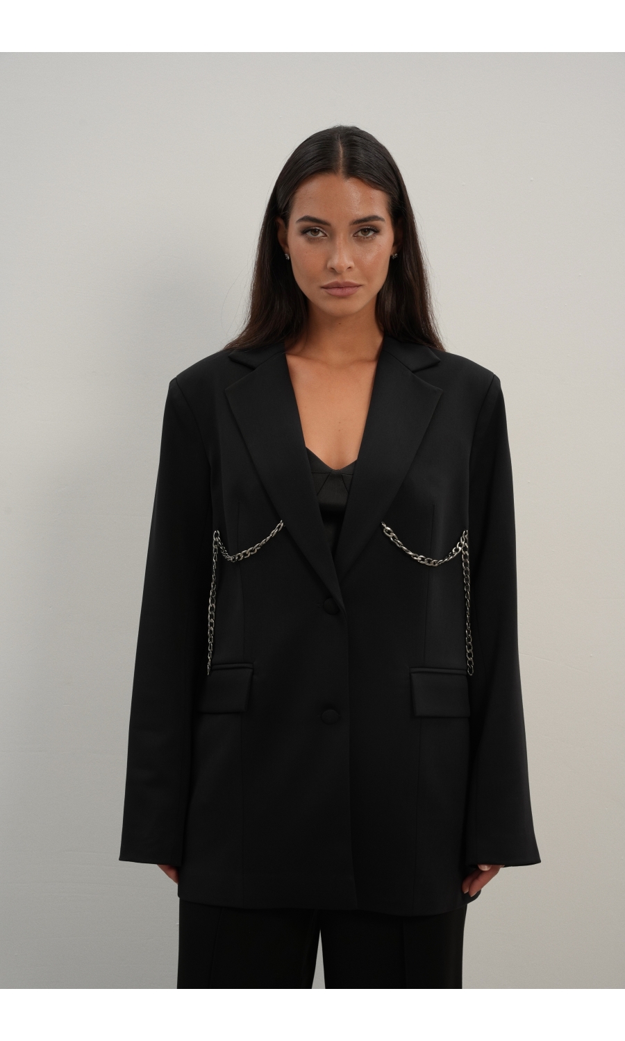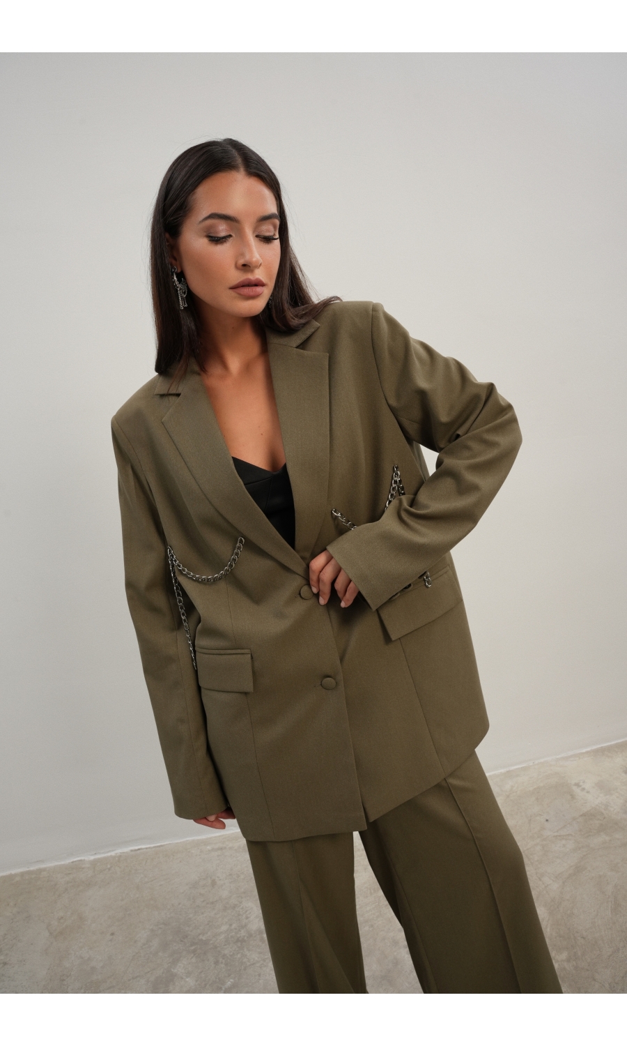 | Двубортный жакет прямого кроя выполнен из поливискозной ткани. На зоне груди расположена несъемная акцентная деталь в виде цепи. |