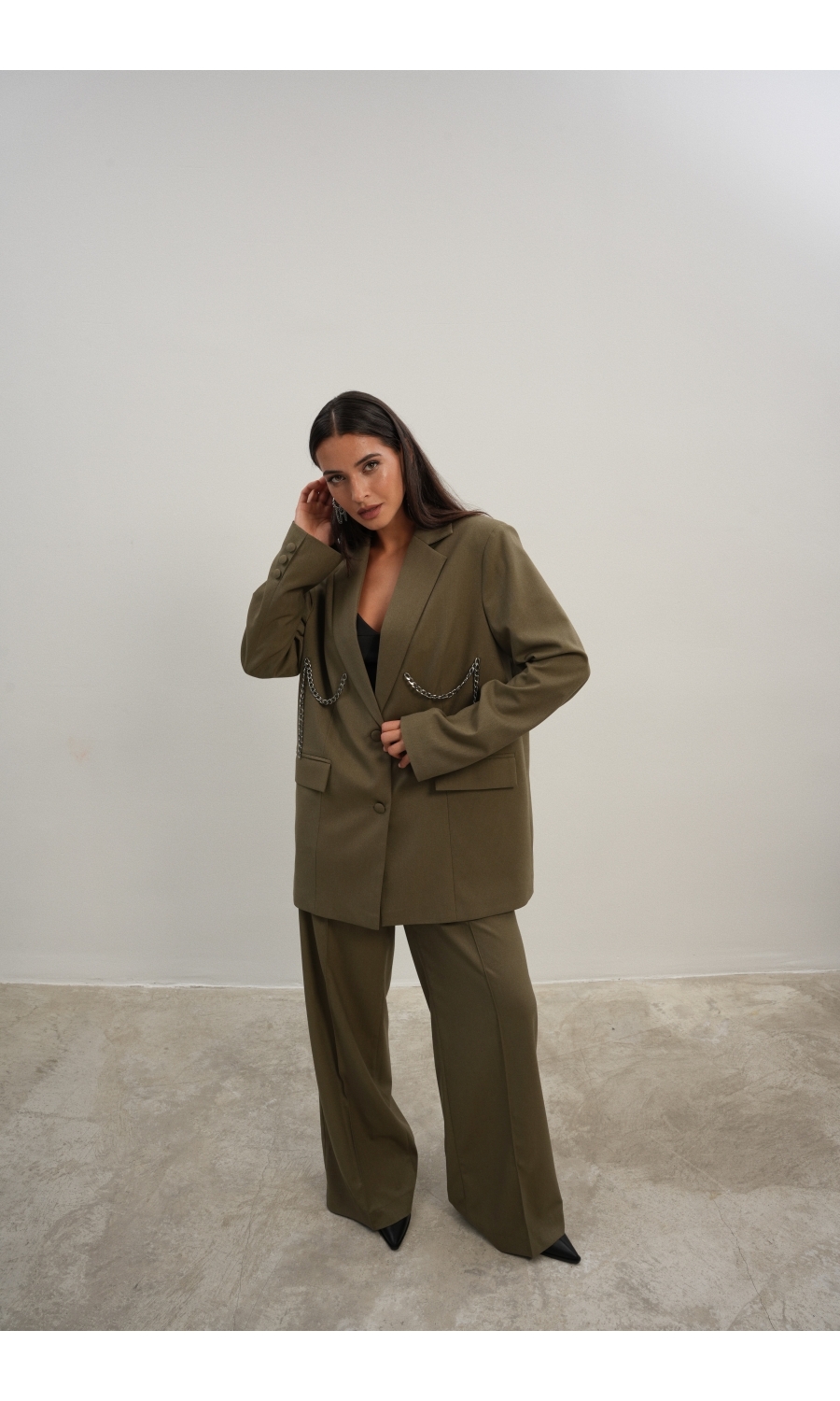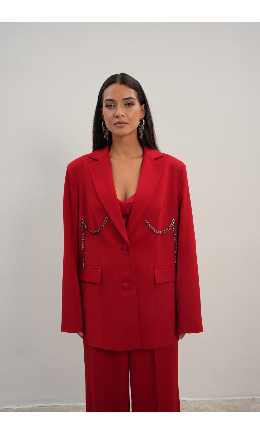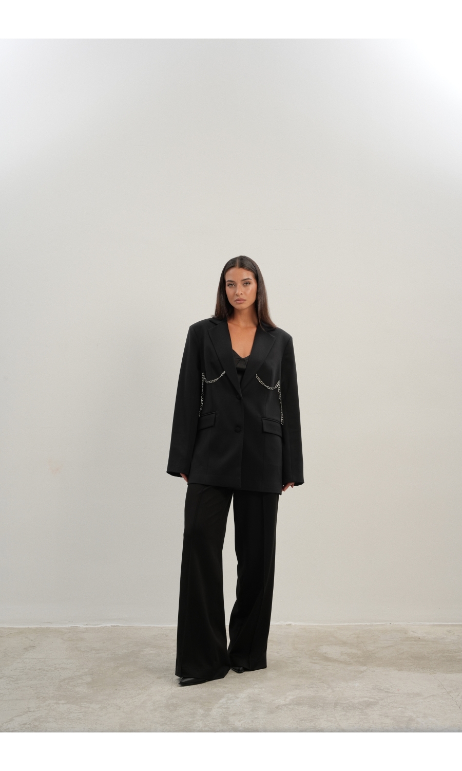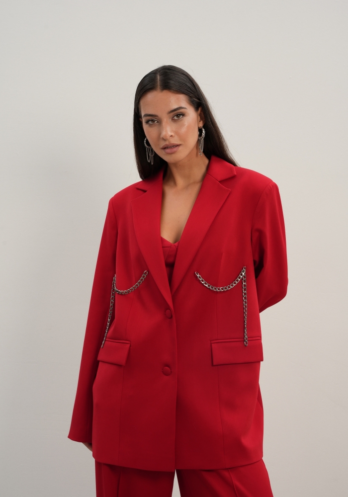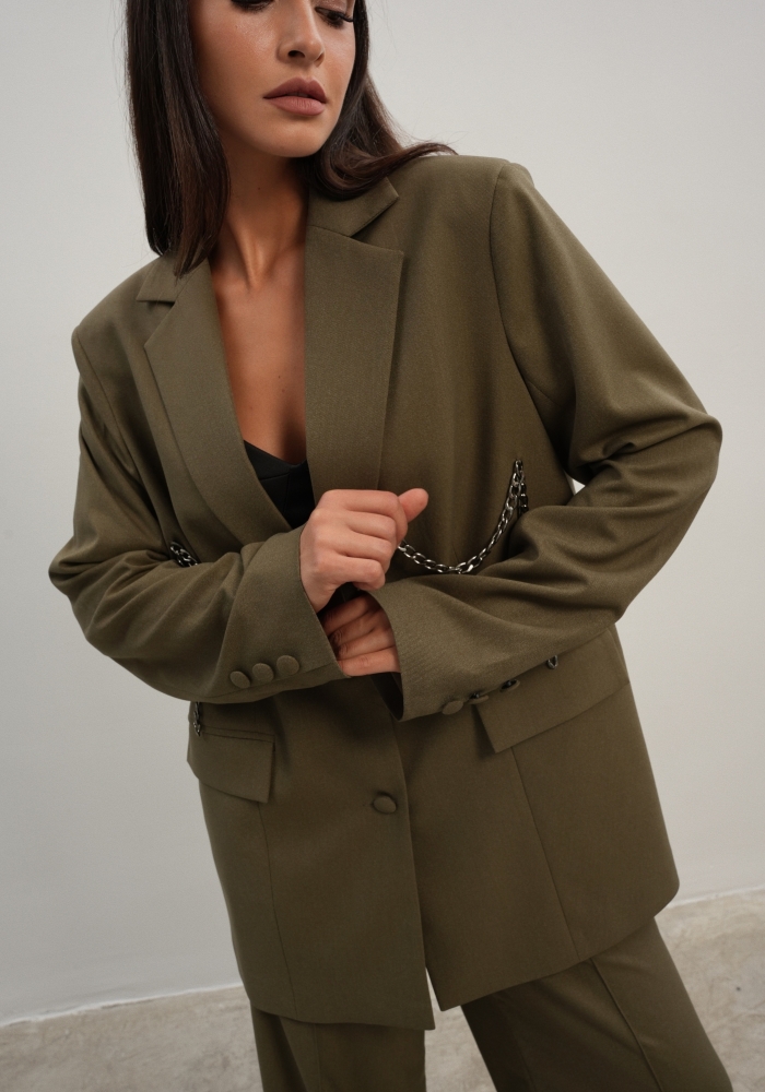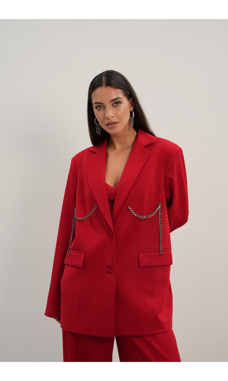 | Двубортный жакет прямого кроя выполнен из поливискозной ткани. На зоне груди расположена несъемная акцентная деталь в виде цепи. |
