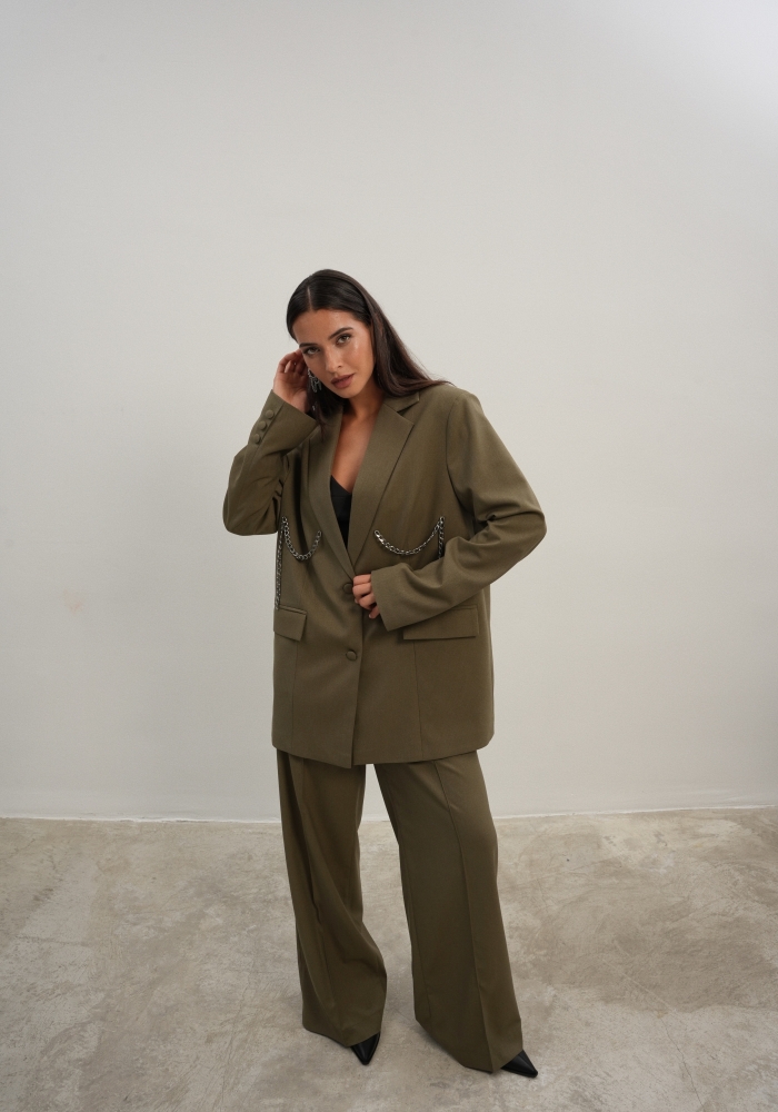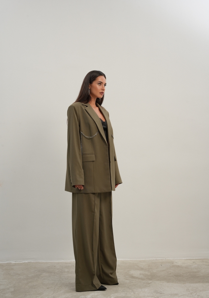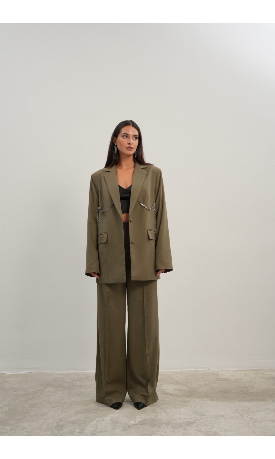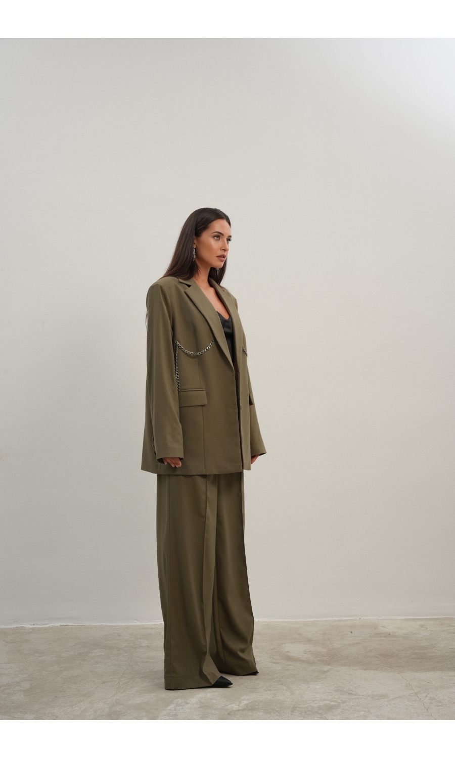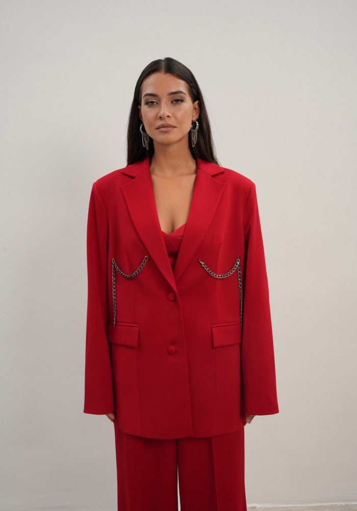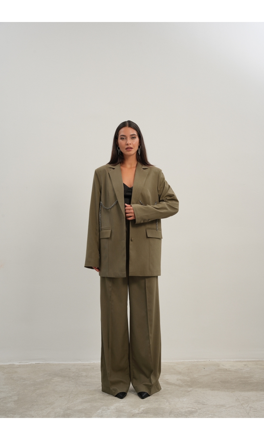 | Двубортный жакет прямого кроя выполнен из поливискозной ткани. На зоне груди расположена несъемная акцентная деталь в виде цепи. |