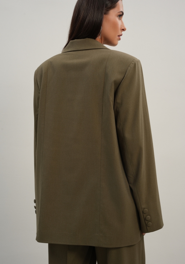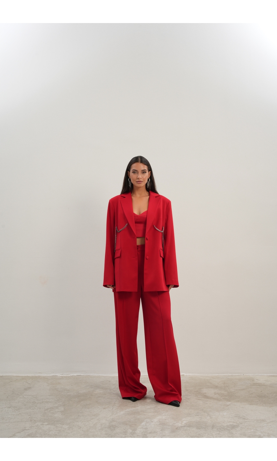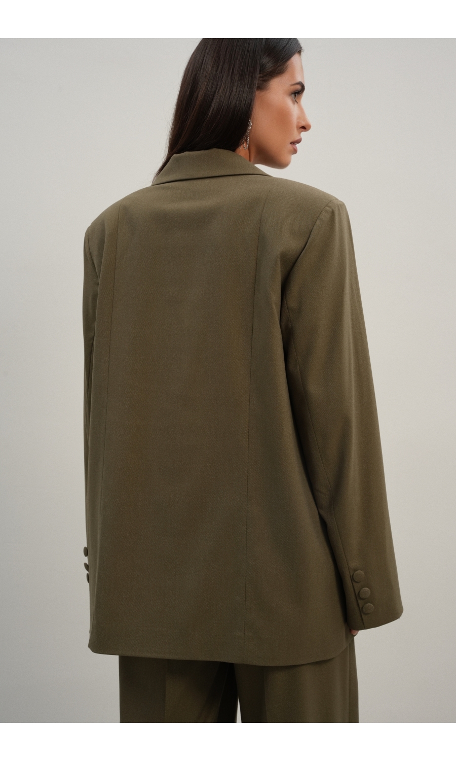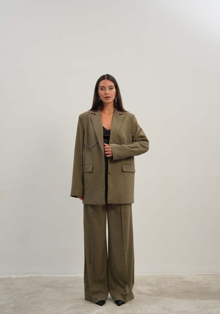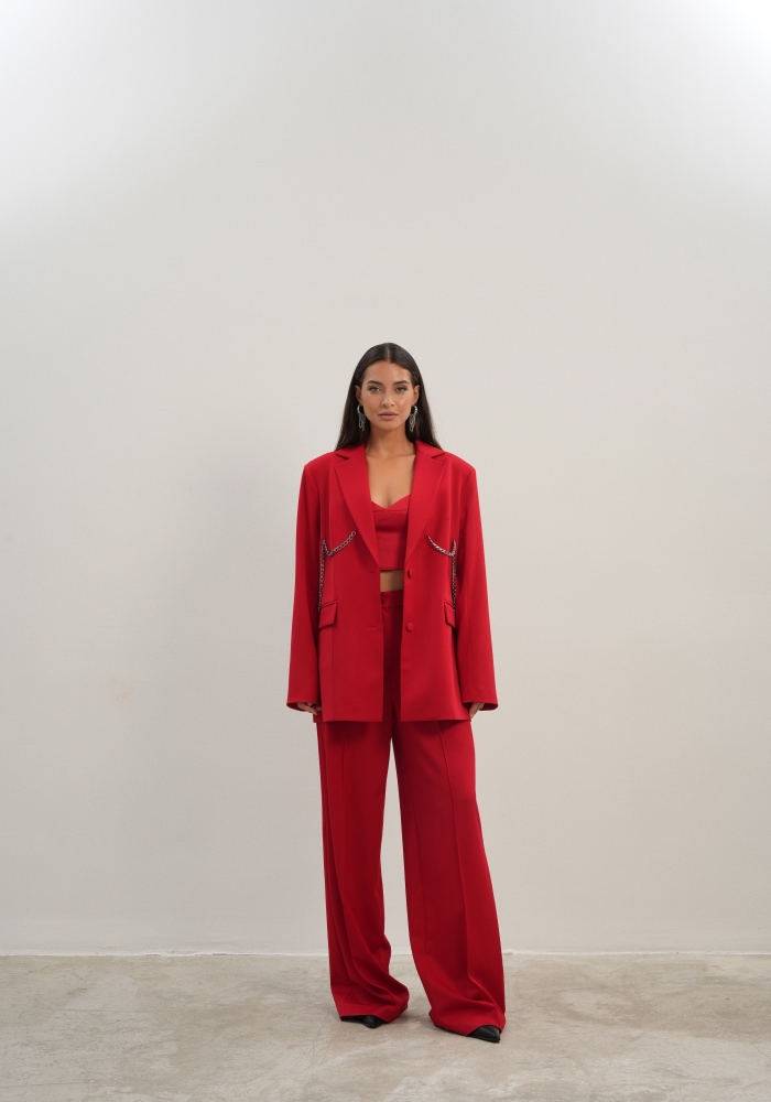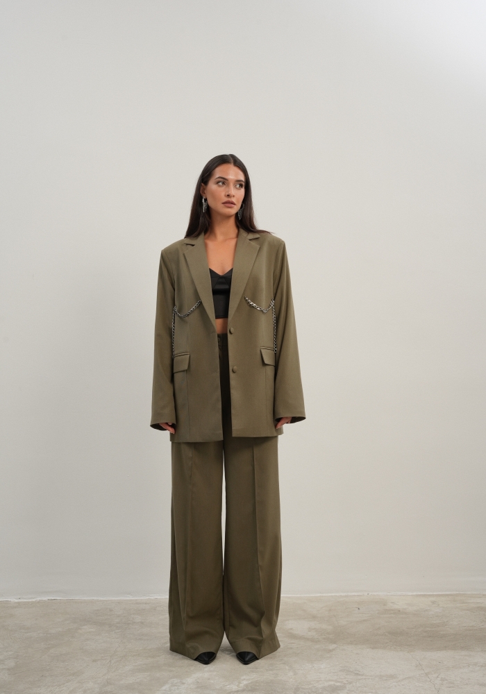 | Двубортный жакет прямого кроя выполнен из поливискозной ткани. На зоне груди расположена несъемная акцентная деталь в виде цепи. |