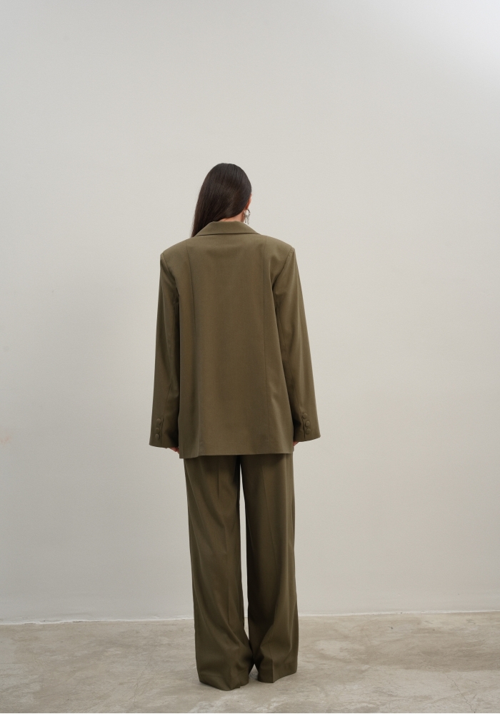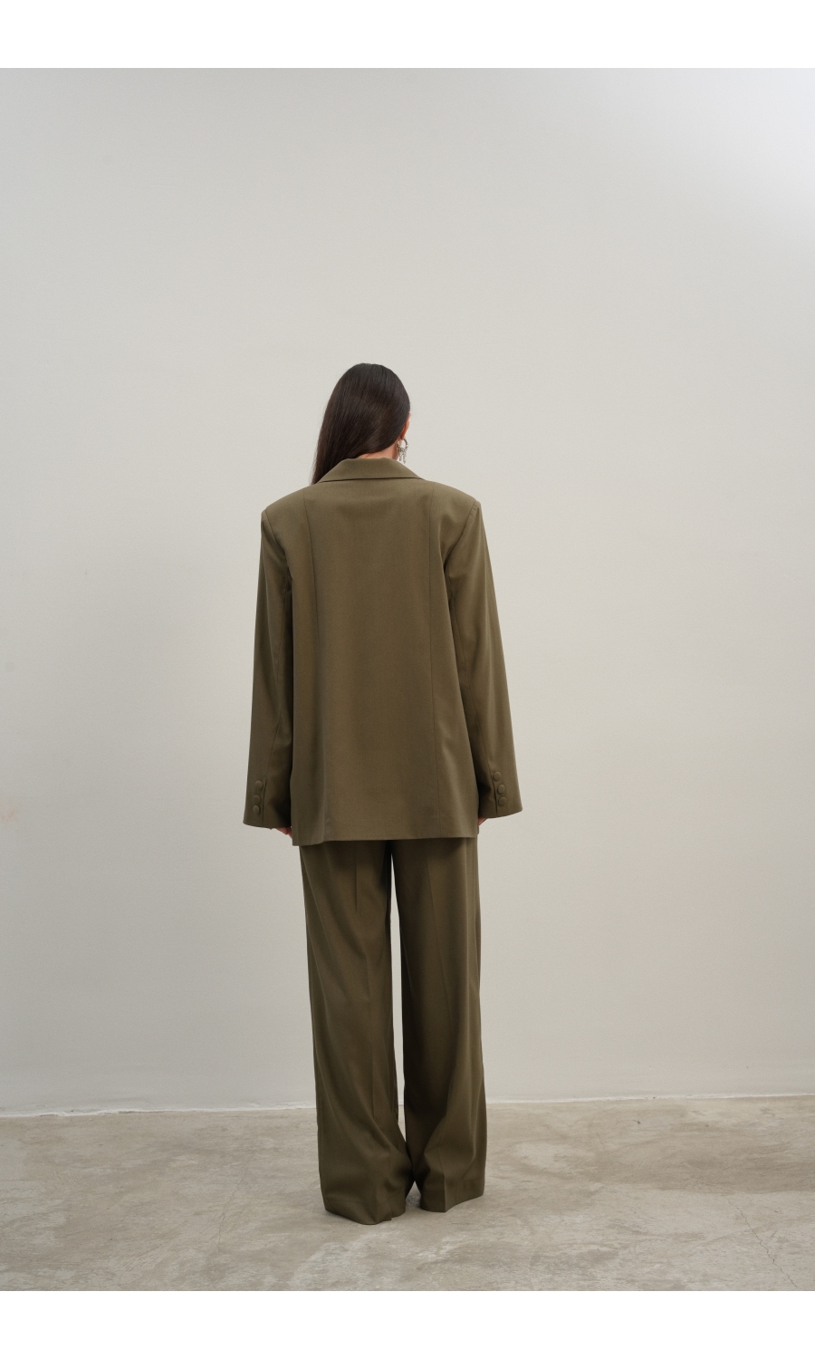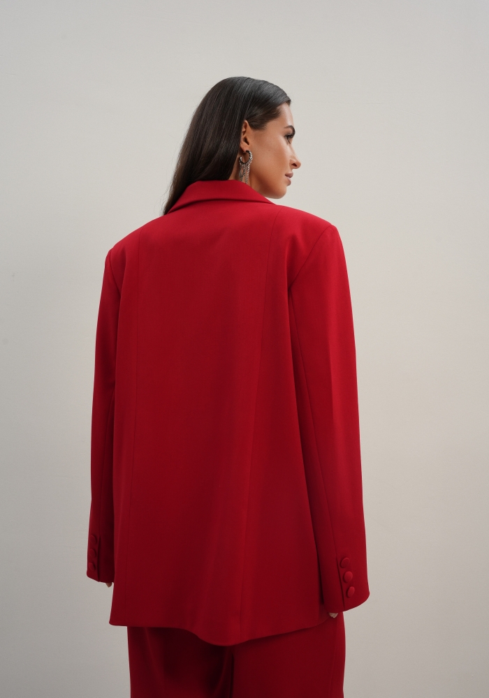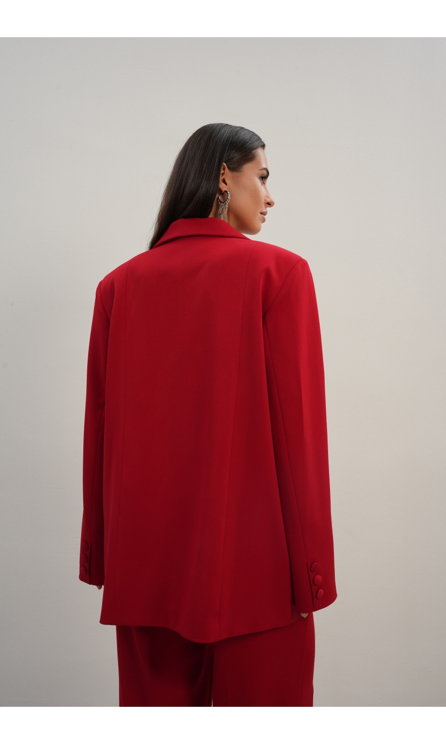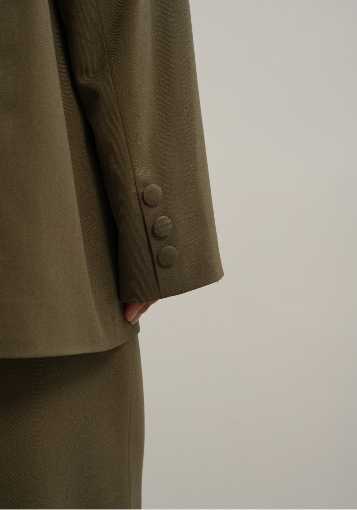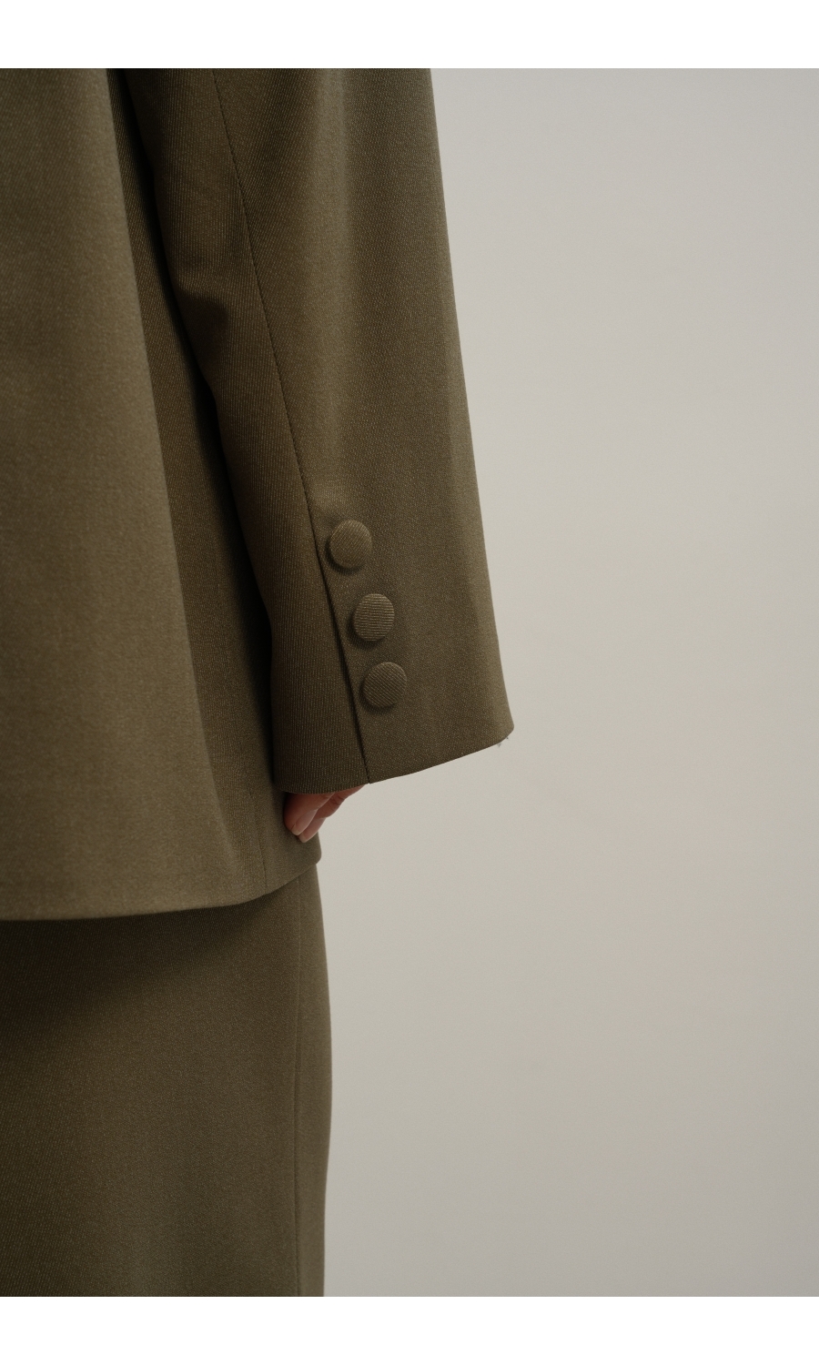 | Двубортный жакет прямого кроя выполнен из поливискозной ткани. На зоне груди расположена несъемная акцентная деталь в виде цепи. |