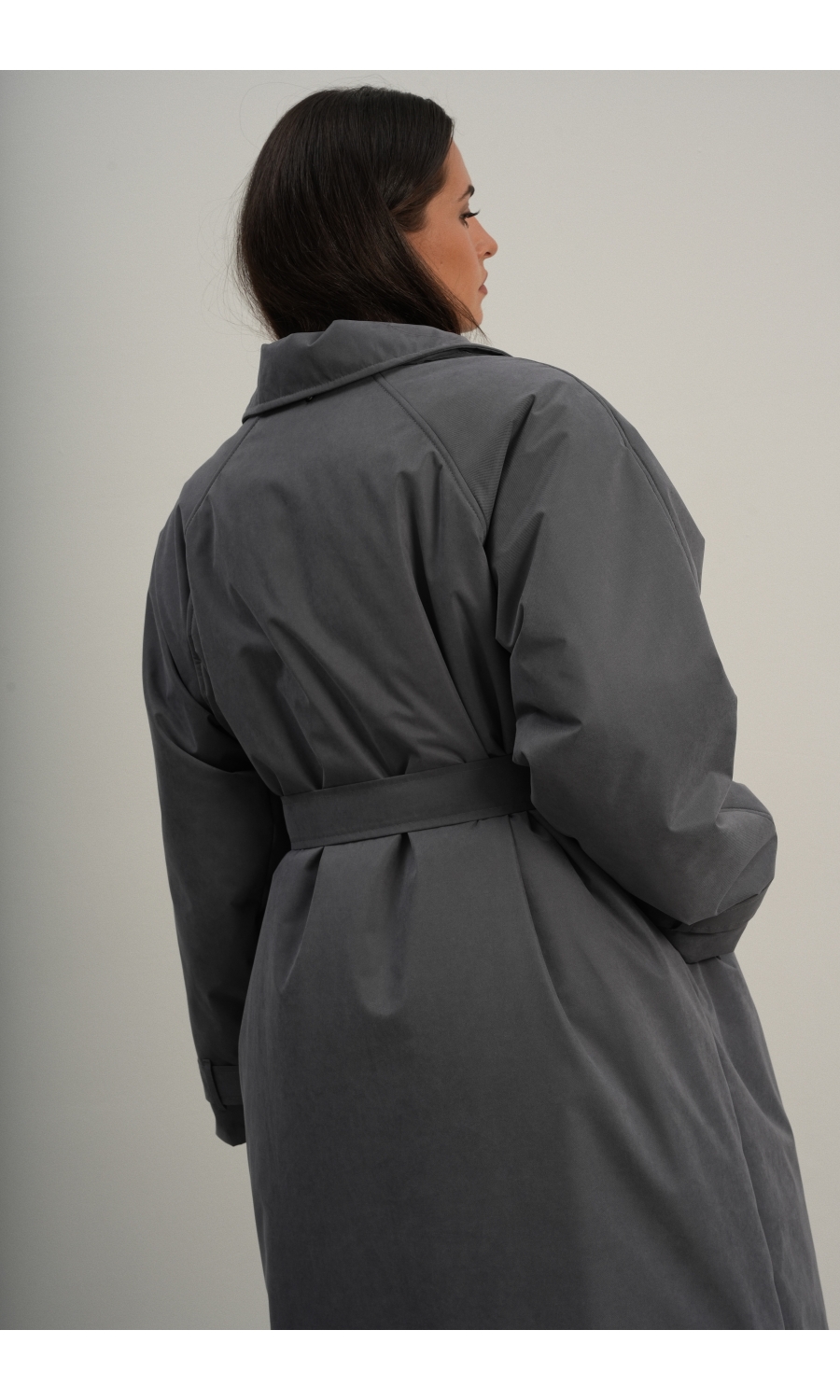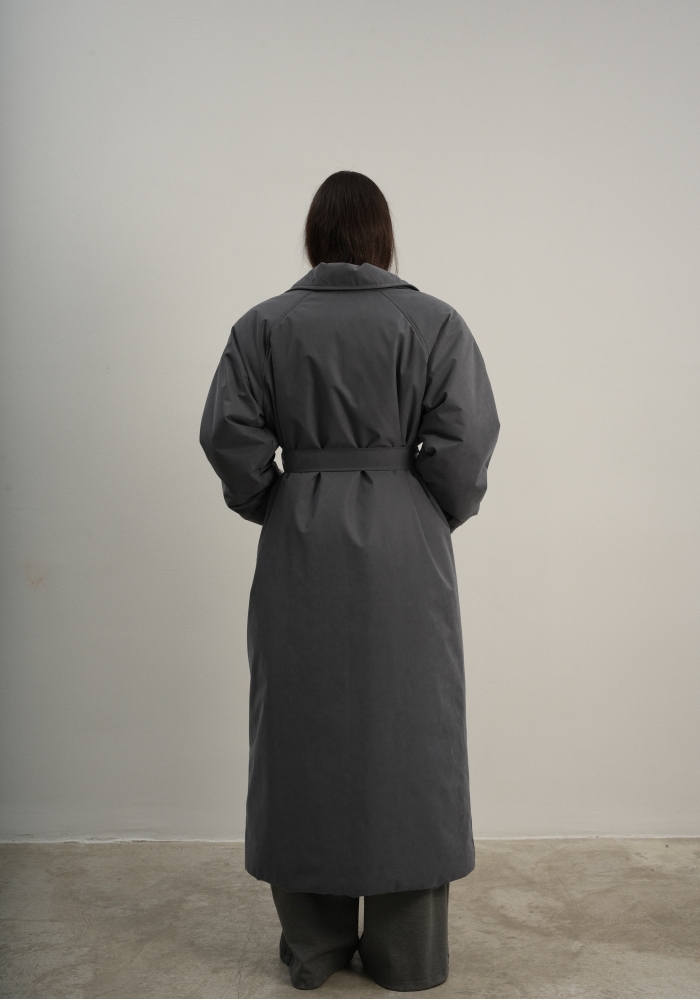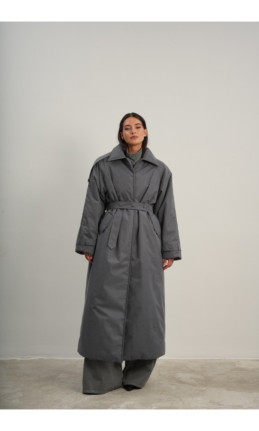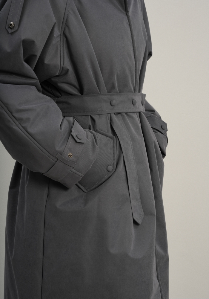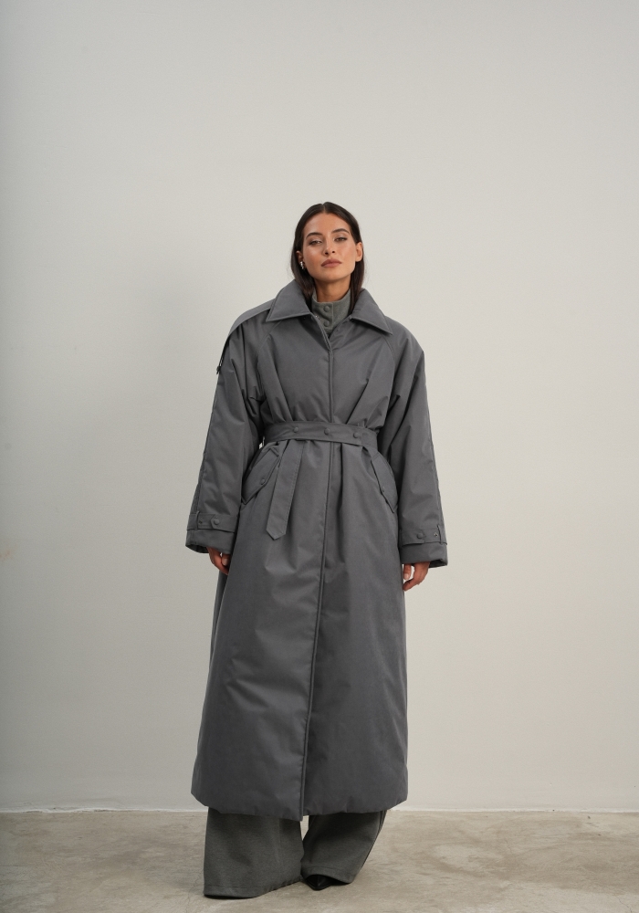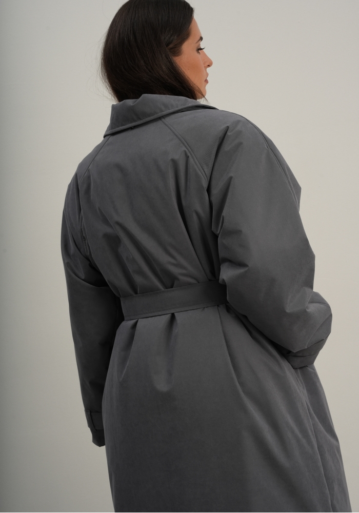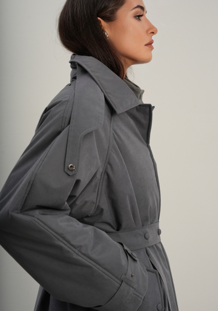 Утеплённая куртка прямого кроя в длине макси со съемной пелериной выполнена из современного ветронепродуваемого материала с водоотталкивающей пропиткой. Ткань имеет легкую фактуру в виде мелких полосок и слегка бархатистую на ощупь поверхность. Застежка в виде кнопок под обтяжку. Пояс застегивается также на кнопки. Паты по низу рукава служат для регулировки. Температурный режим до -15.