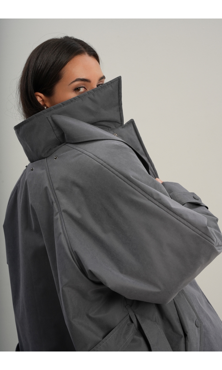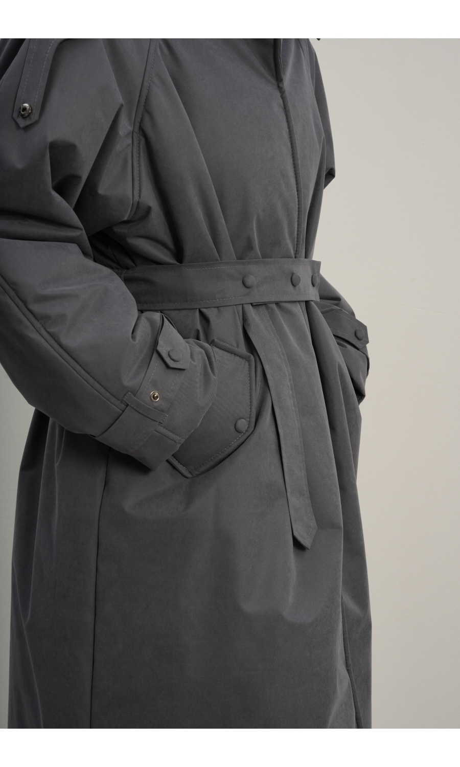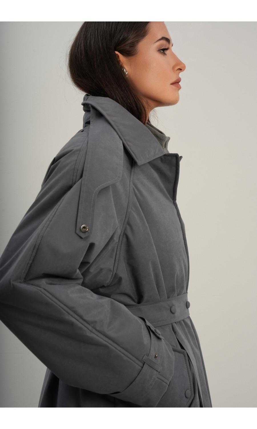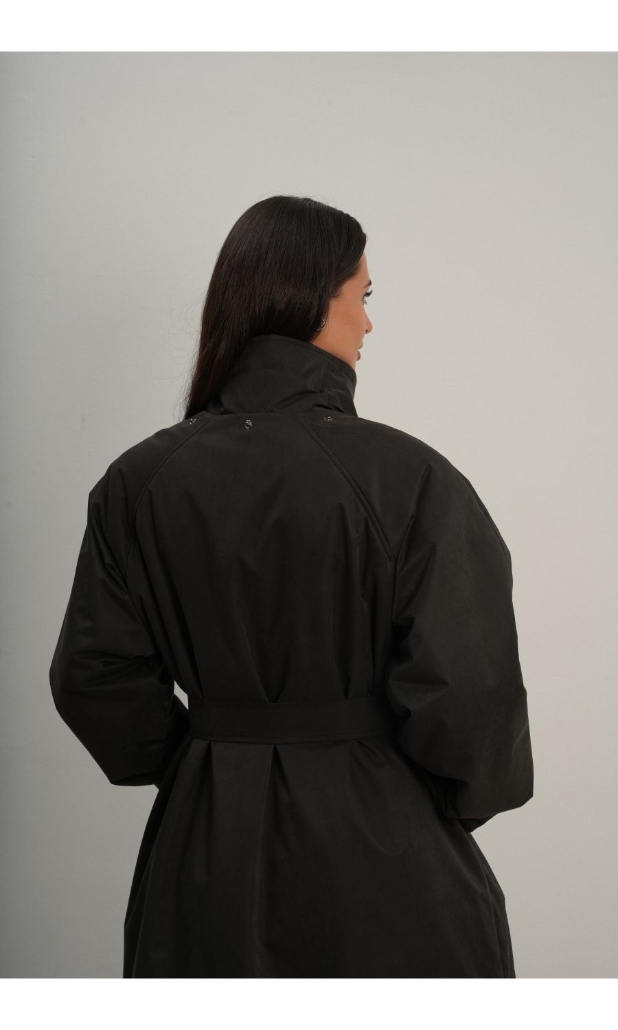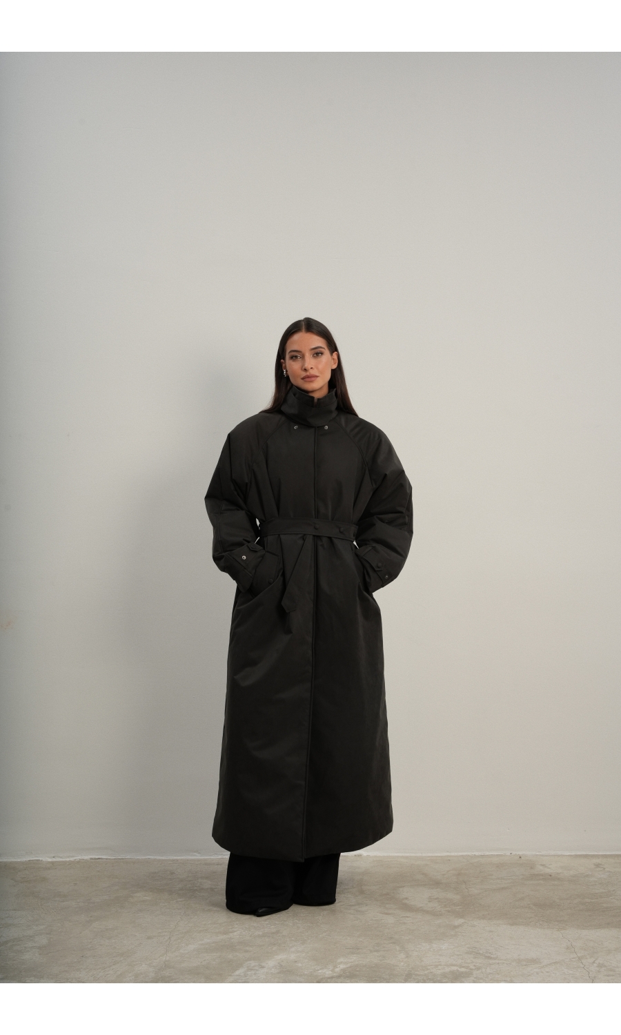 Утеплённая куртка прямого кроя в длине макси со съемной пелериной выполнена из современного ветронепродуваемого материала с водоотталкивающей пропиткой. Ткань имеет легкую фактуру в виде мелких полосок и слегка бархатистую на ощупь поверхность. Застежка в виде кнопок под обтяжку. Пояс застегивается также на кнопки. Паты по низу рукава служат для регулировки. Температурный режим до -15.