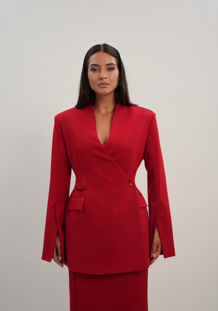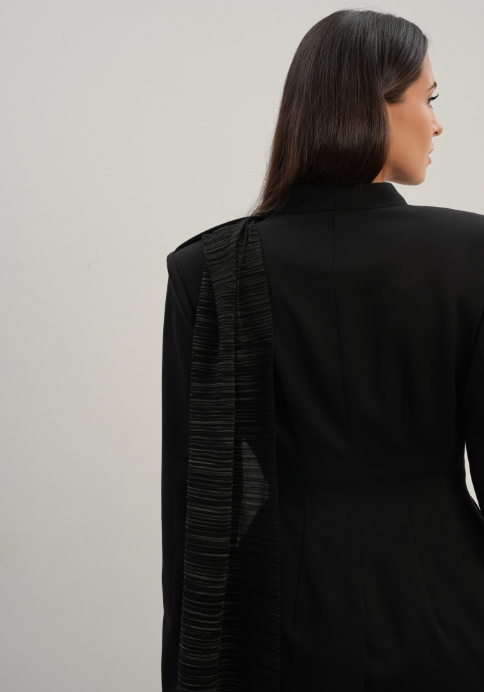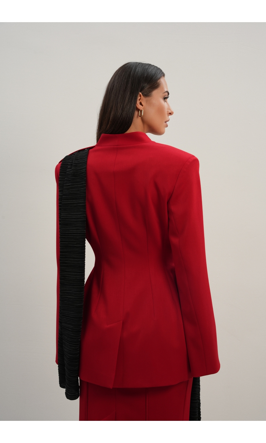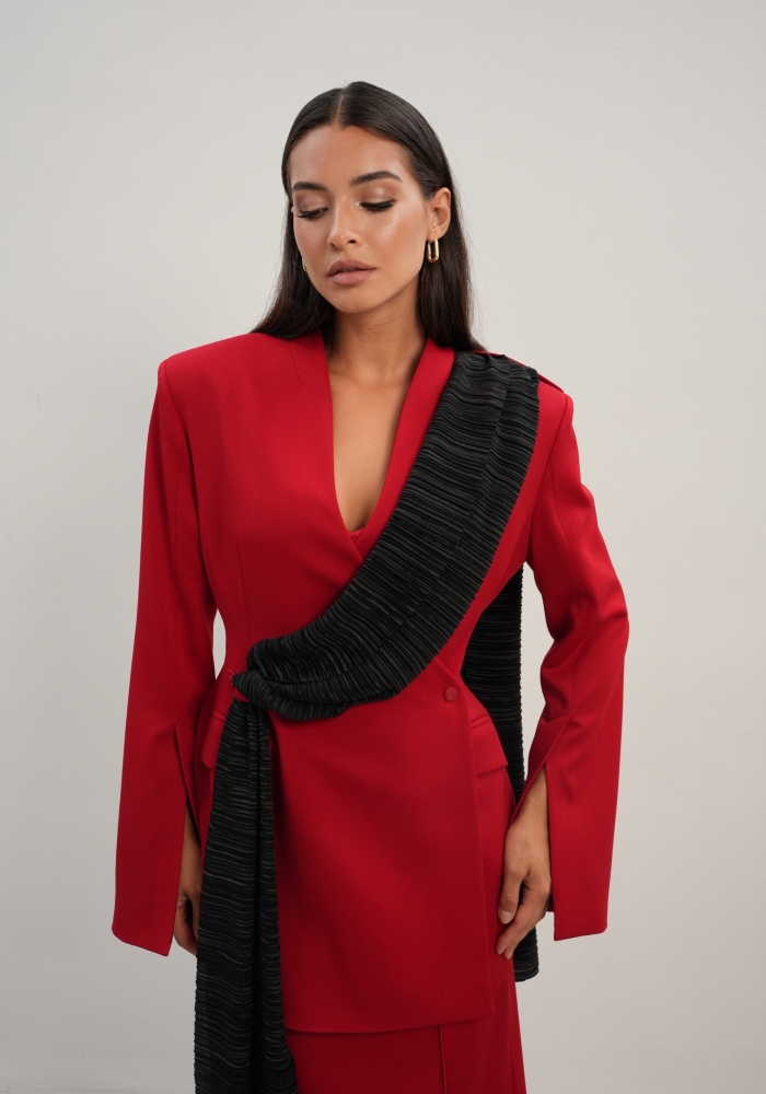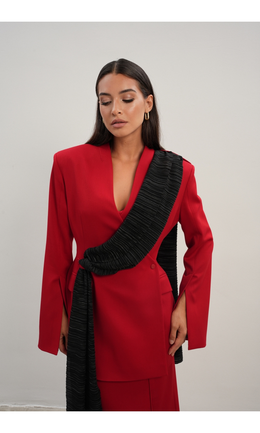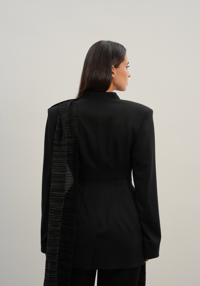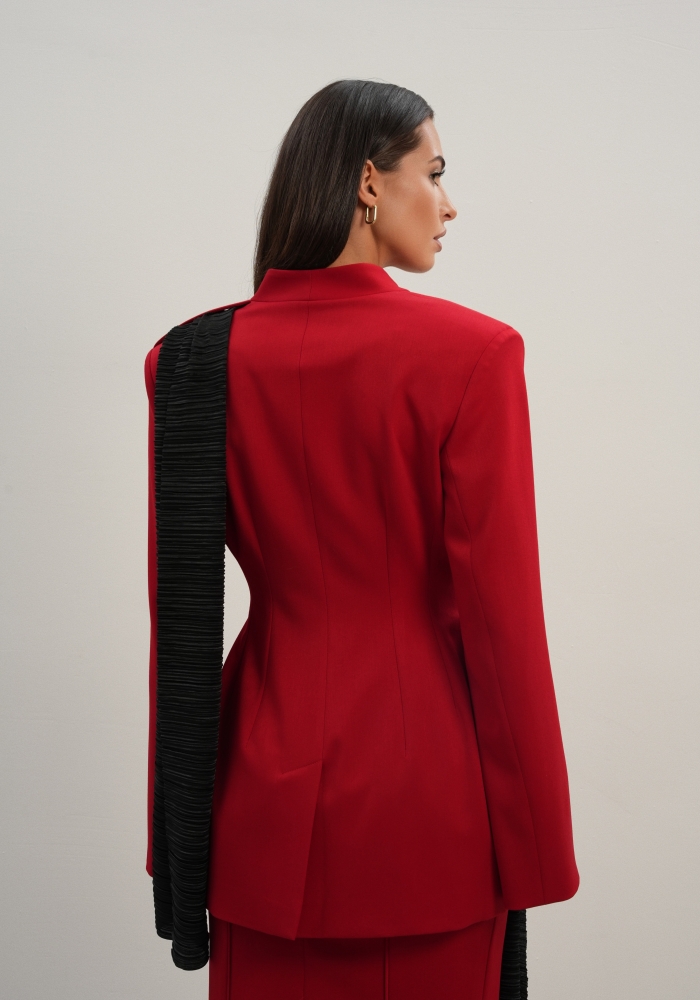 | Жакет приталенного кроя выполнен из поливискозной ткани. Имеет акцентные плечи и выраженную талию, тем самым создает силуэт песочных часов. На жакете расположены кнопки, которыми можно регулировать объем талии. В комплекте идет съемная декоративная деталь в виде ткани гофре, которая крепится на хлястик в районе плечевого шва и талии. Дополните образ брюками палаццо |