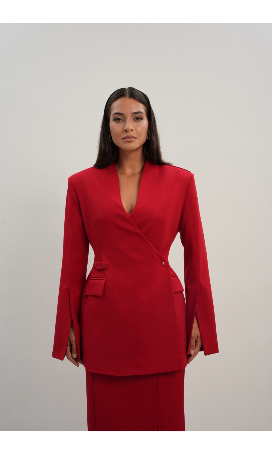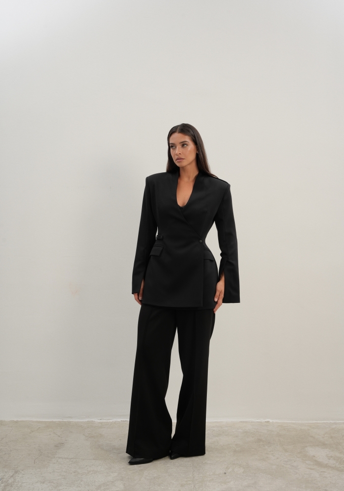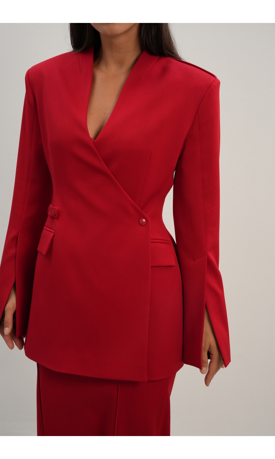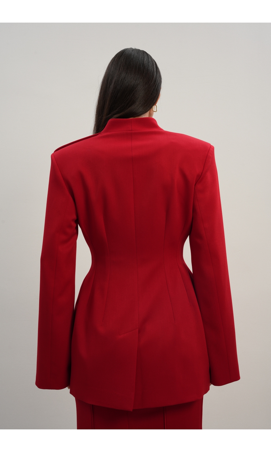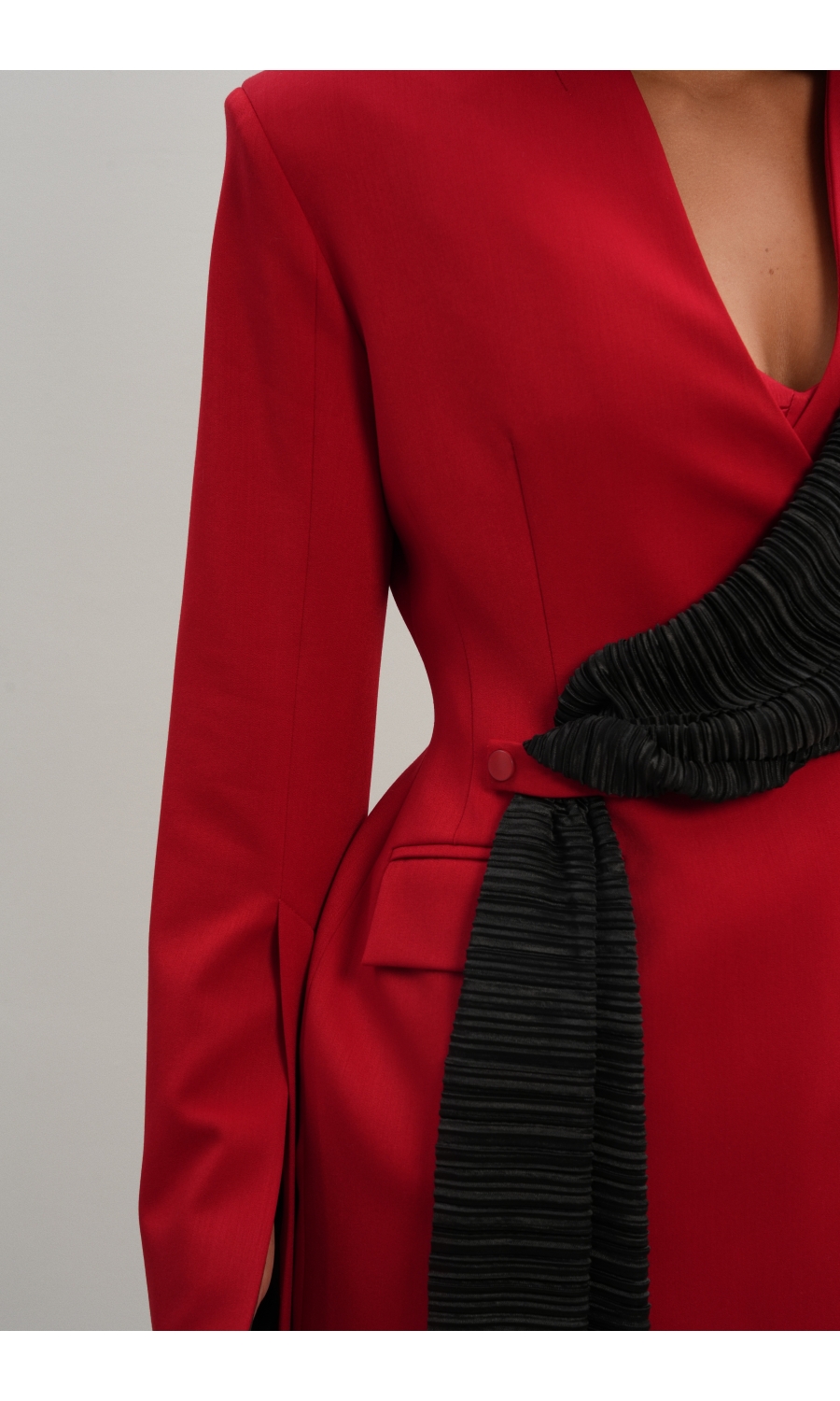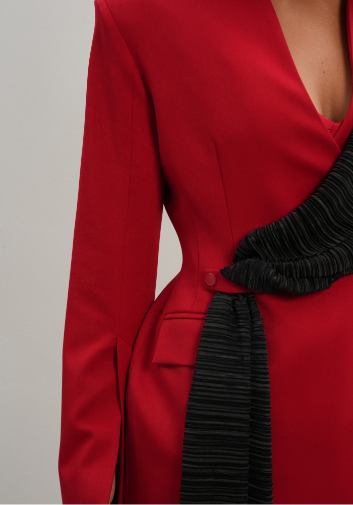 | Жакет приталенного кроя выполнен из поливискозной ткани. Имеет акцентные плечи и выраженную талию, тем самым создает силуэт песочных часов. На жакете расположены кнопки, которыми можно регулировать объем талии. В комплекте идет съемная декоративная деталь в виде ткани гофре, которая крепится на хлястик в районе плечевого шва и талии. Дополните образ брюками палаццо |